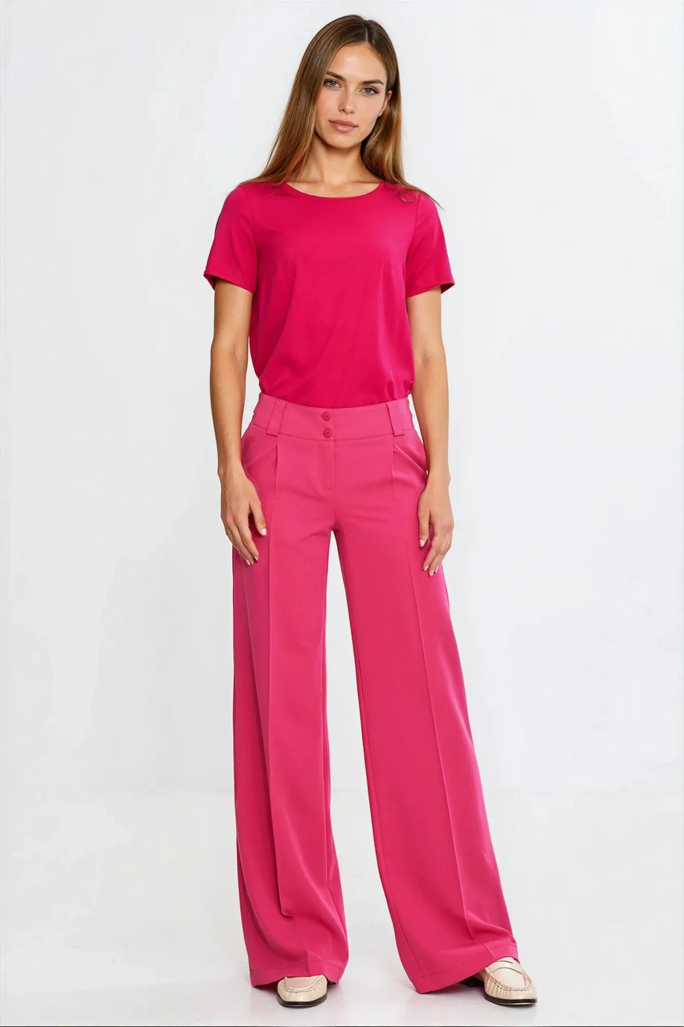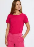 Krój regular. Model basic. Materiał wiskoza. Dekolt w łódkę i krótki rękaw wykończony lamówką. Wkładana przez głowę.