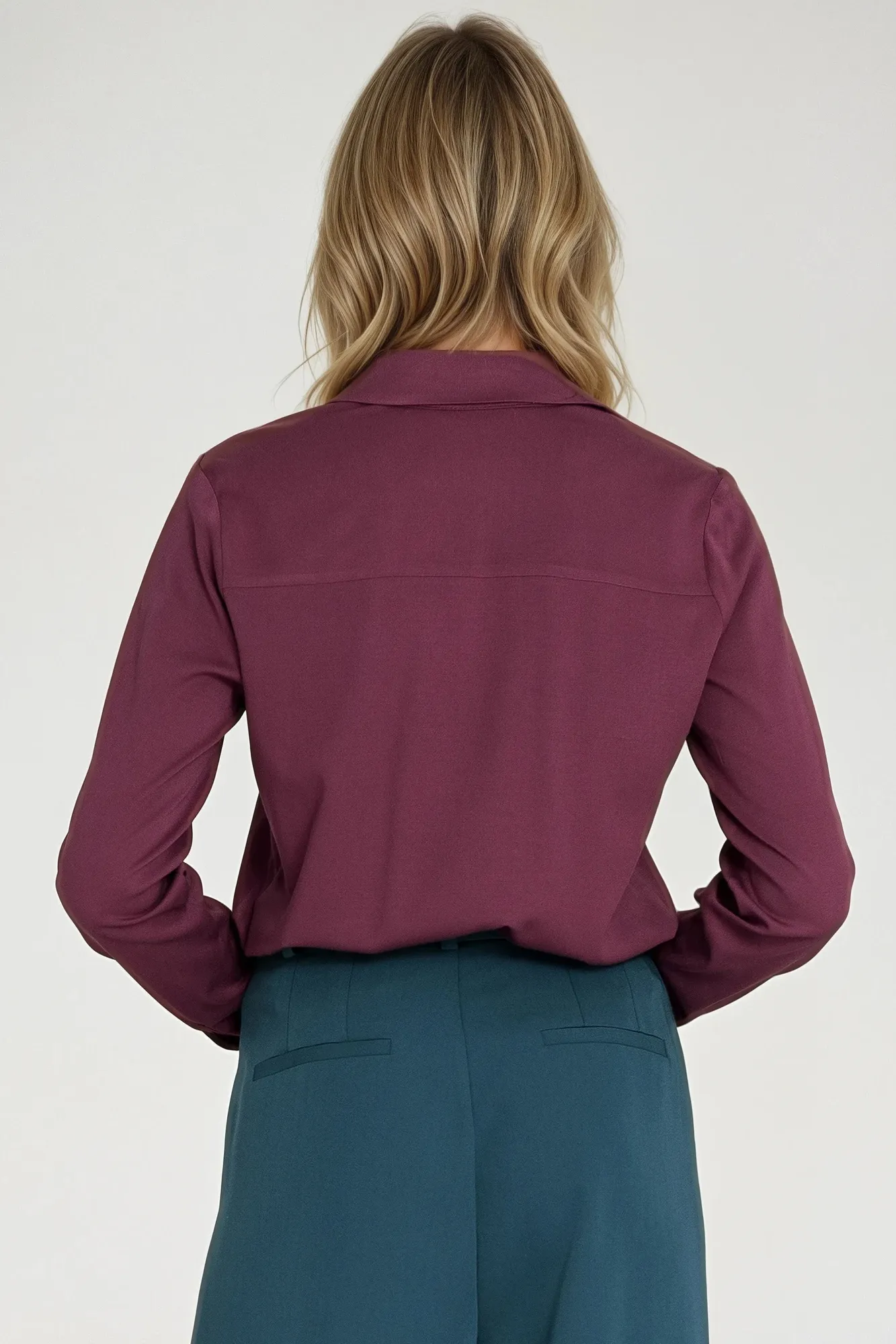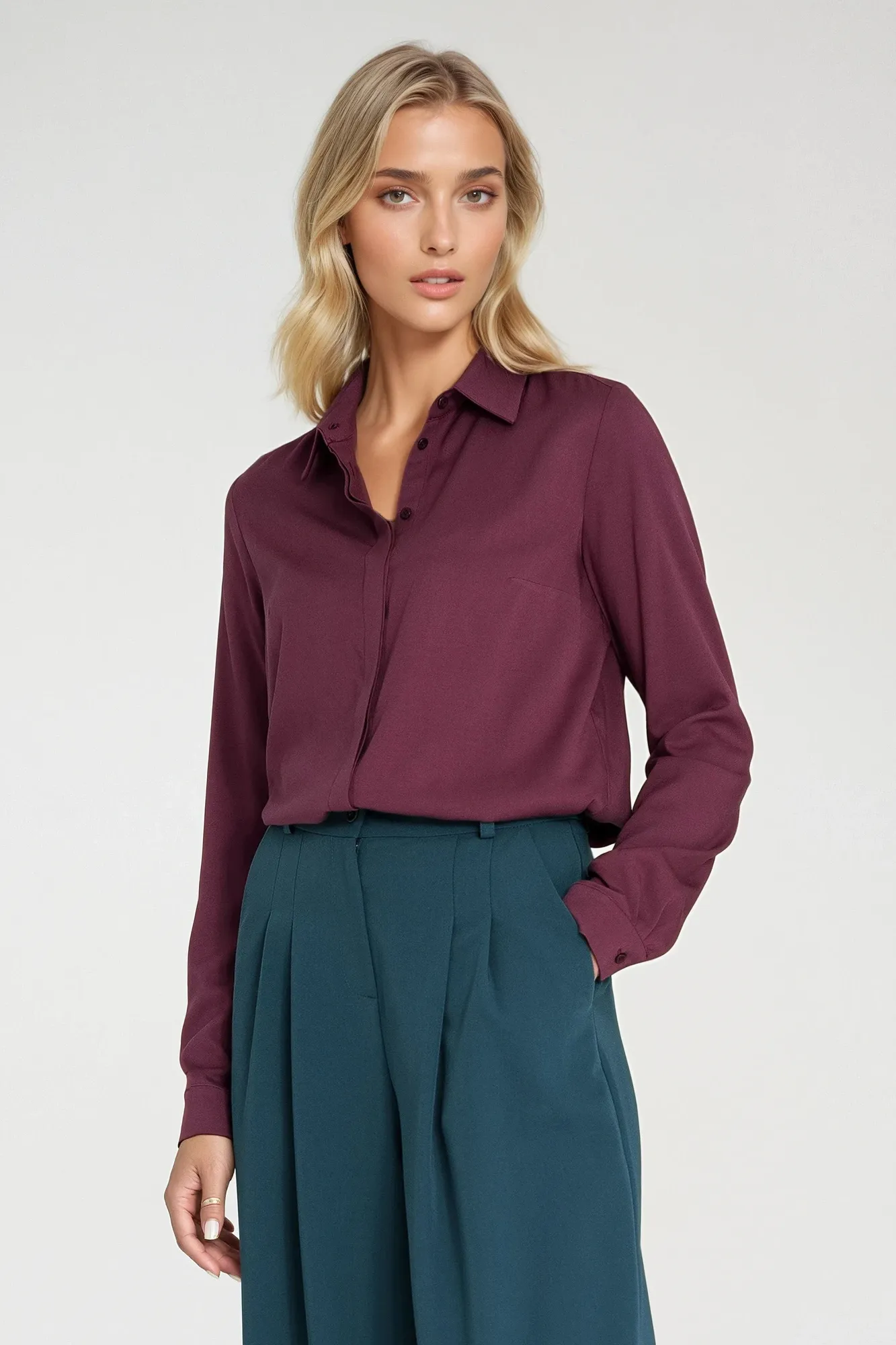 Krój regular. Materiał wiskoza. Z kołnierzykiem. Długi rękaw zakończony mankietem. Zapinana na guziki z kryta plisą.