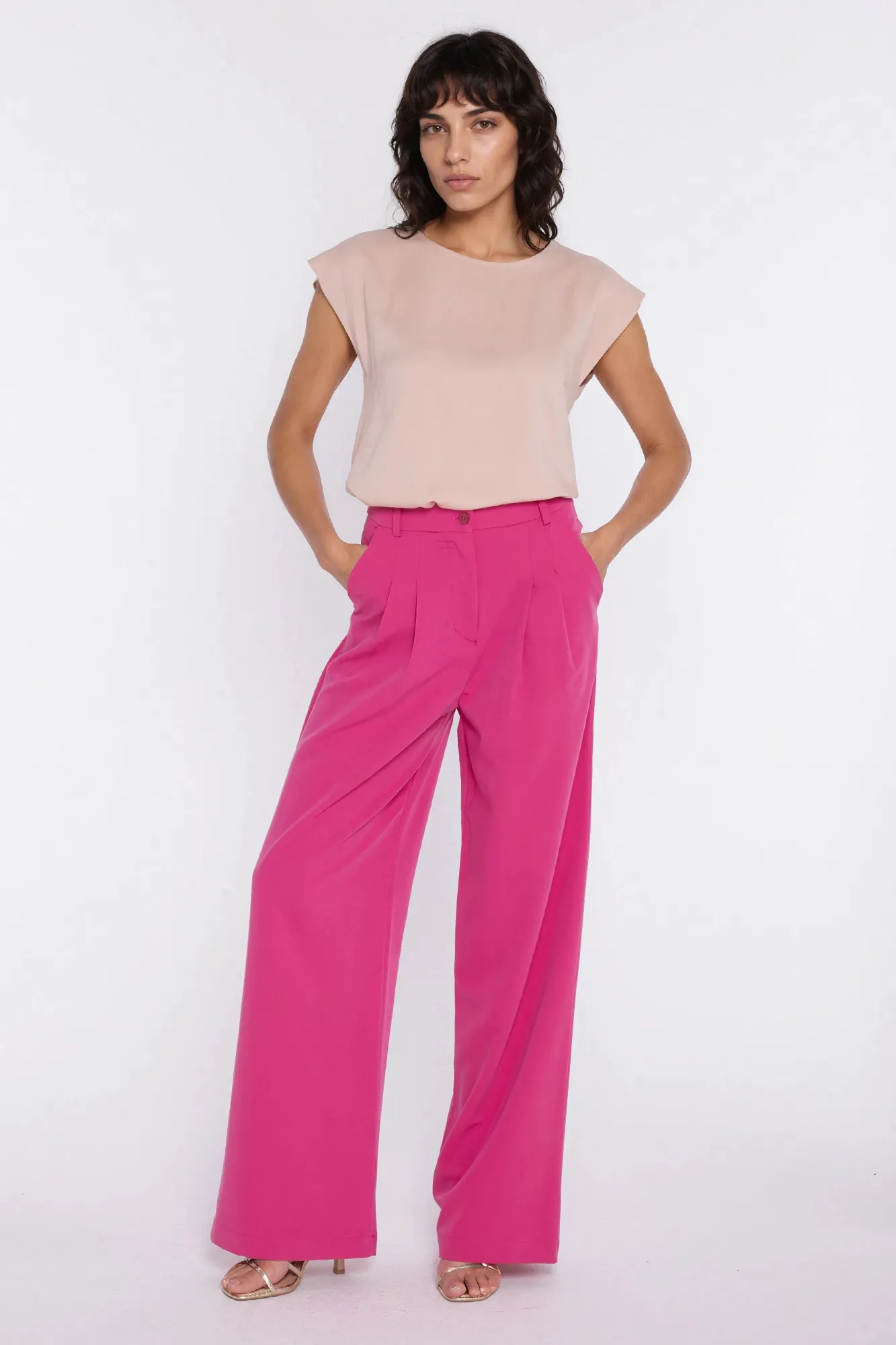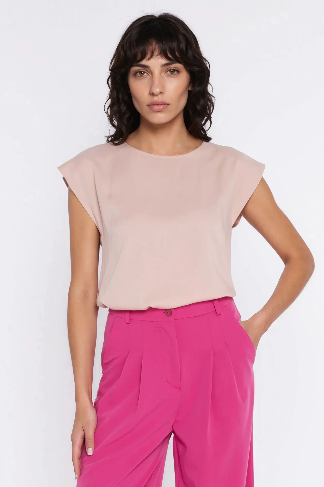 Krój regular. Materiał wiskoza. Dekolt okrągły. Krótki rękaw kimono. Z tyłu zapięcie na guzik. Rozcięcia na dole po bokach. Wkładana przez głowę.