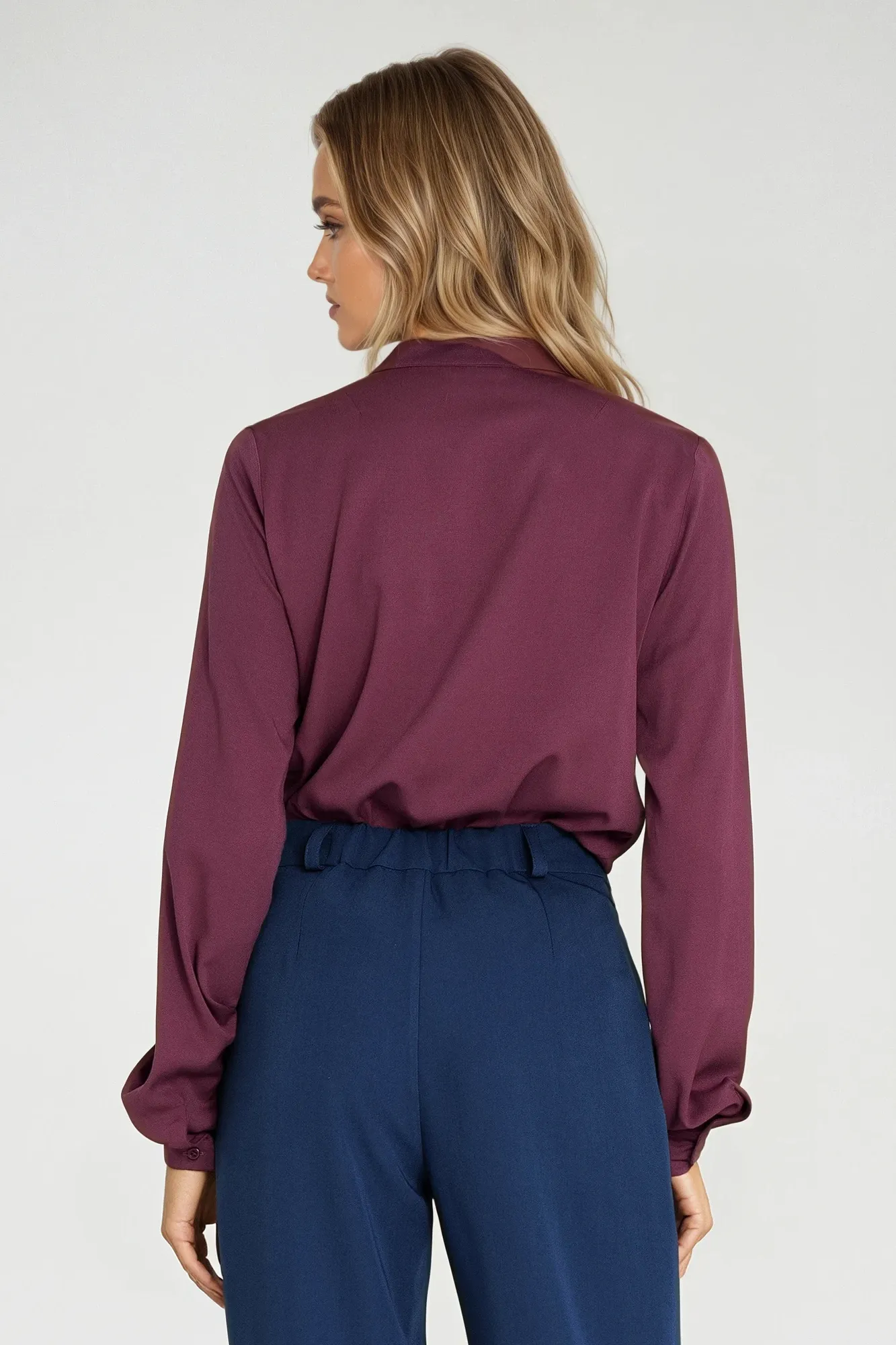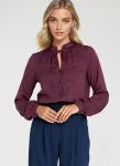 Krój reglar. Materiał wiskoza. Wiązana pod szyją z delikatnym rozcięciem na dekolcie. Długi rękaw. Rozpinana na guziki. Delikatnie marszczona przy stójce.