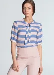 Lekka i romantyczna bluzka z wiązaniem na dekolcie. Model posiada prosty krój i krótki rękaw. Bluzka świetnie dopełni wiosenną stylizację do biura i nie tylko!
