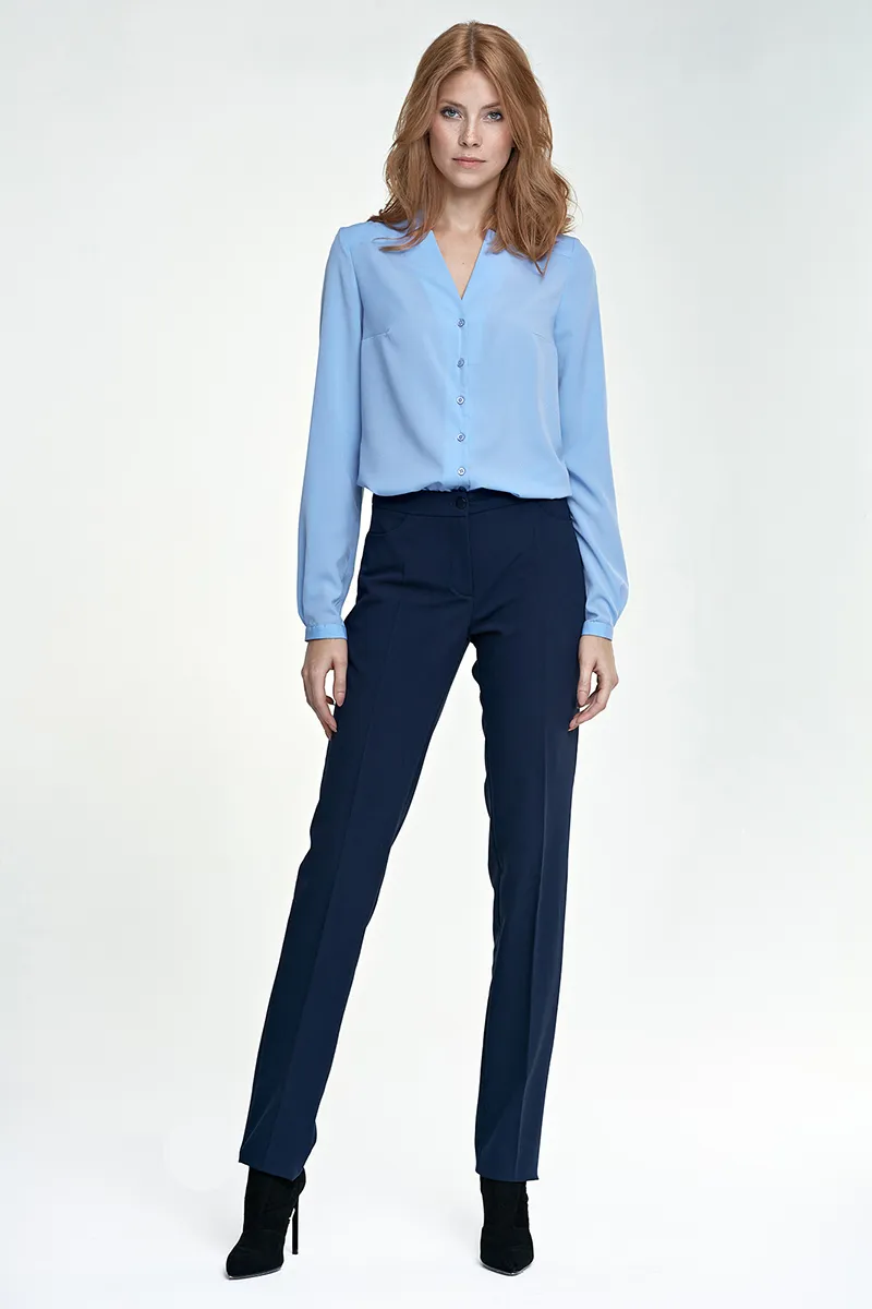 Bluzka posiada zaszewki na biuście, rozpinana.