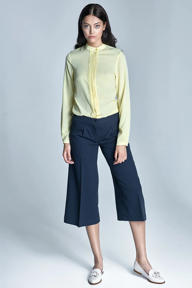 Bluzka z zaszewkami na biuście, zapinana na guziki ukryte pod plisą.