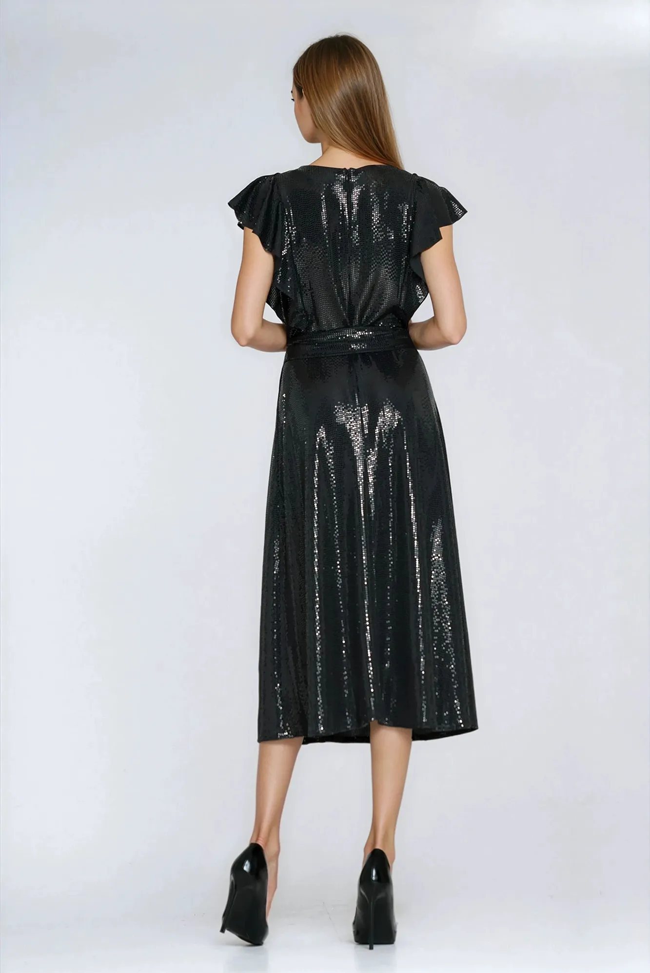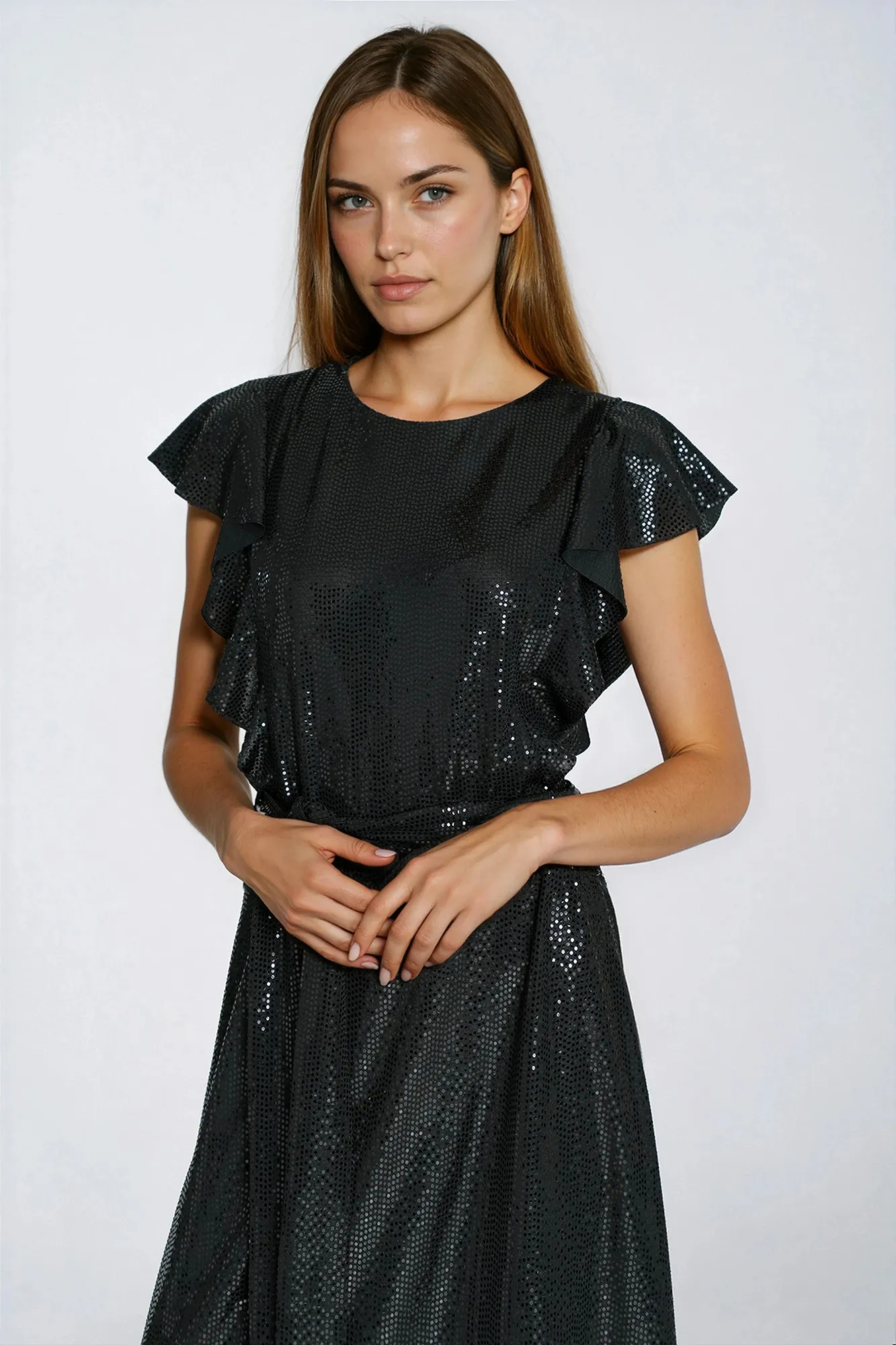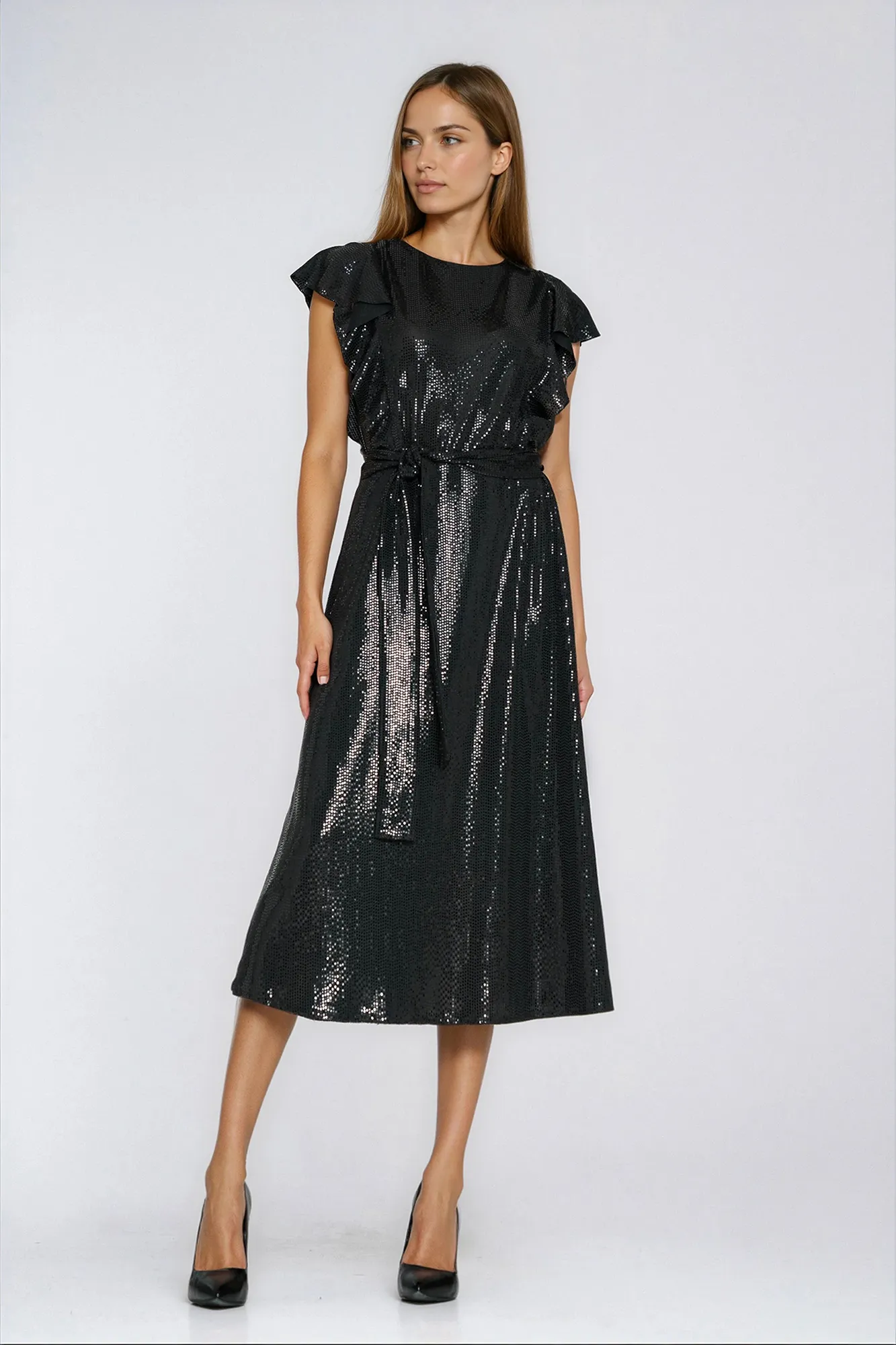 Krój dopasowana góra i trapezowy dół. Materiał klejone cekiny. Okrągły dekolt pod szyję. Bez rękawów. Falbany na ramionach. Długość za kolano. Zapinana na zamek z tyłu. W komplecie pasek.