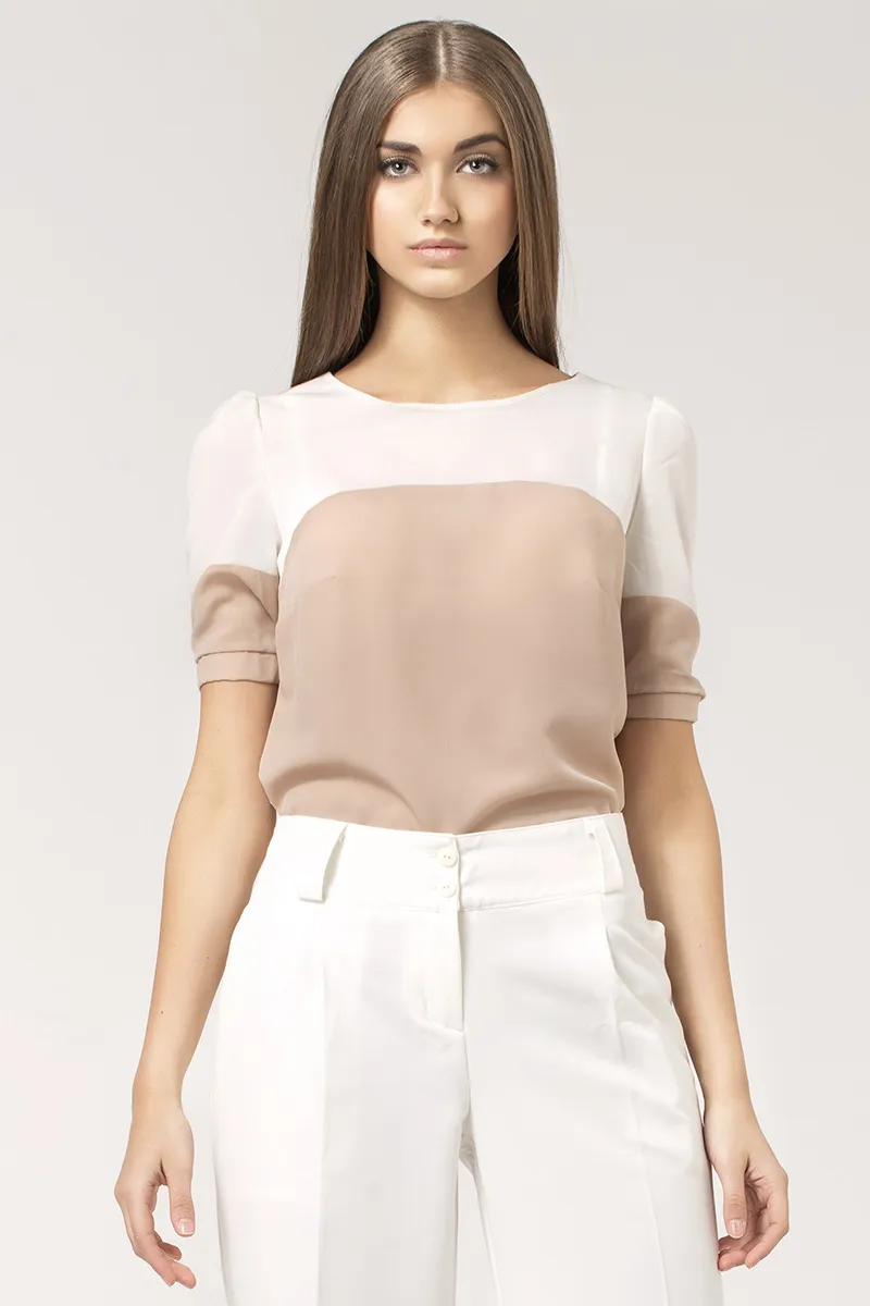 Finezyjna, dwukolorowa bluzka z krótkim rękawem,w połączeniu z krótkim żakietem i spódniczką będzie wyglądać perfekcyjnie. Sprawdzi się na eleganckie biznesowe kolacje w połączeniu ze szpilkami, w połączeniu ze szwedami i sweterkiem sprawdzi się na kolacji z przyjaciółmi.