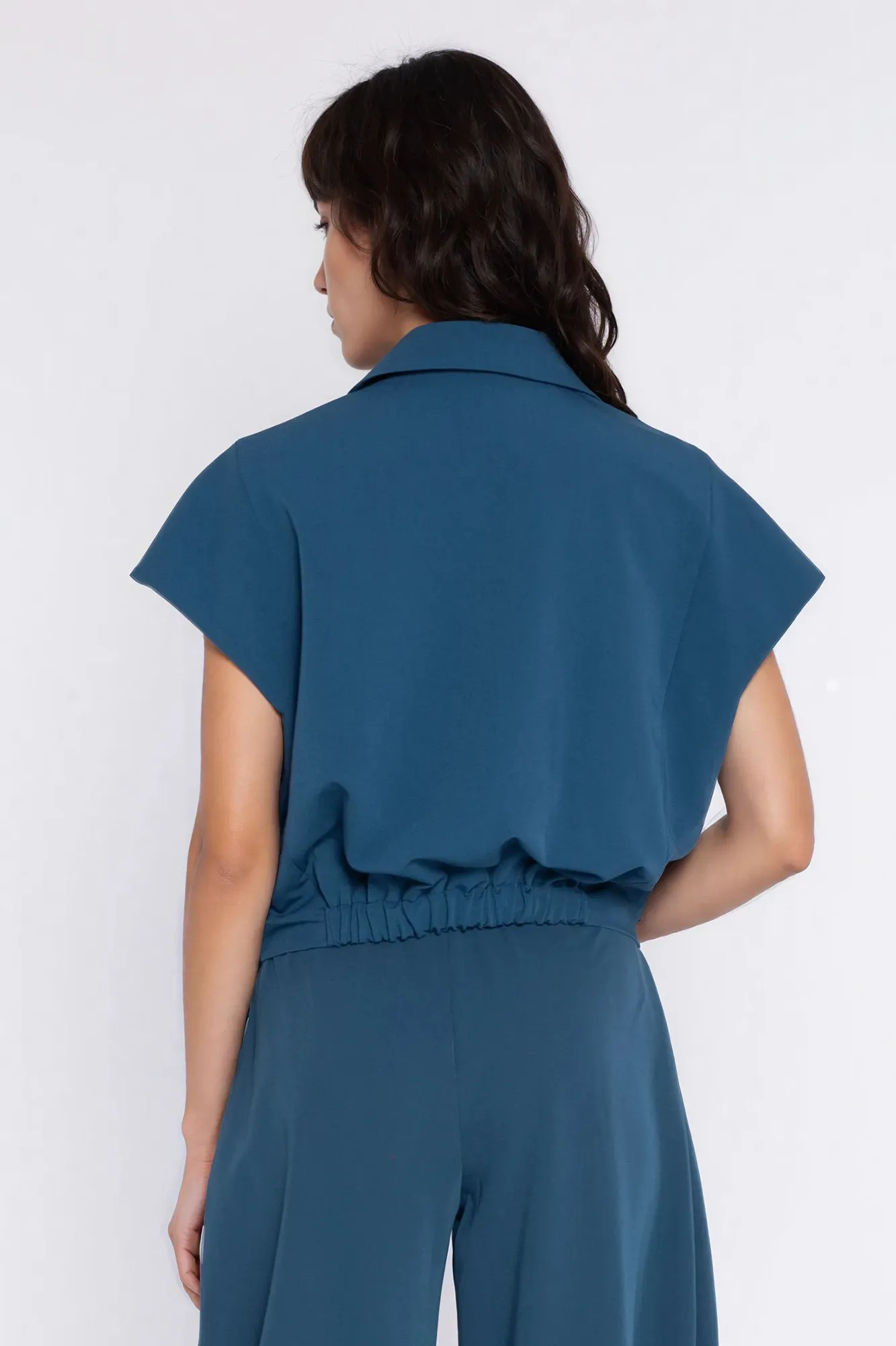 Krój regular. Klasyczny kołnierz. Krótki półrękaw. Zapięcie na dwa guziki. W tylnej części w pasie guma. Posiada podszewkę.