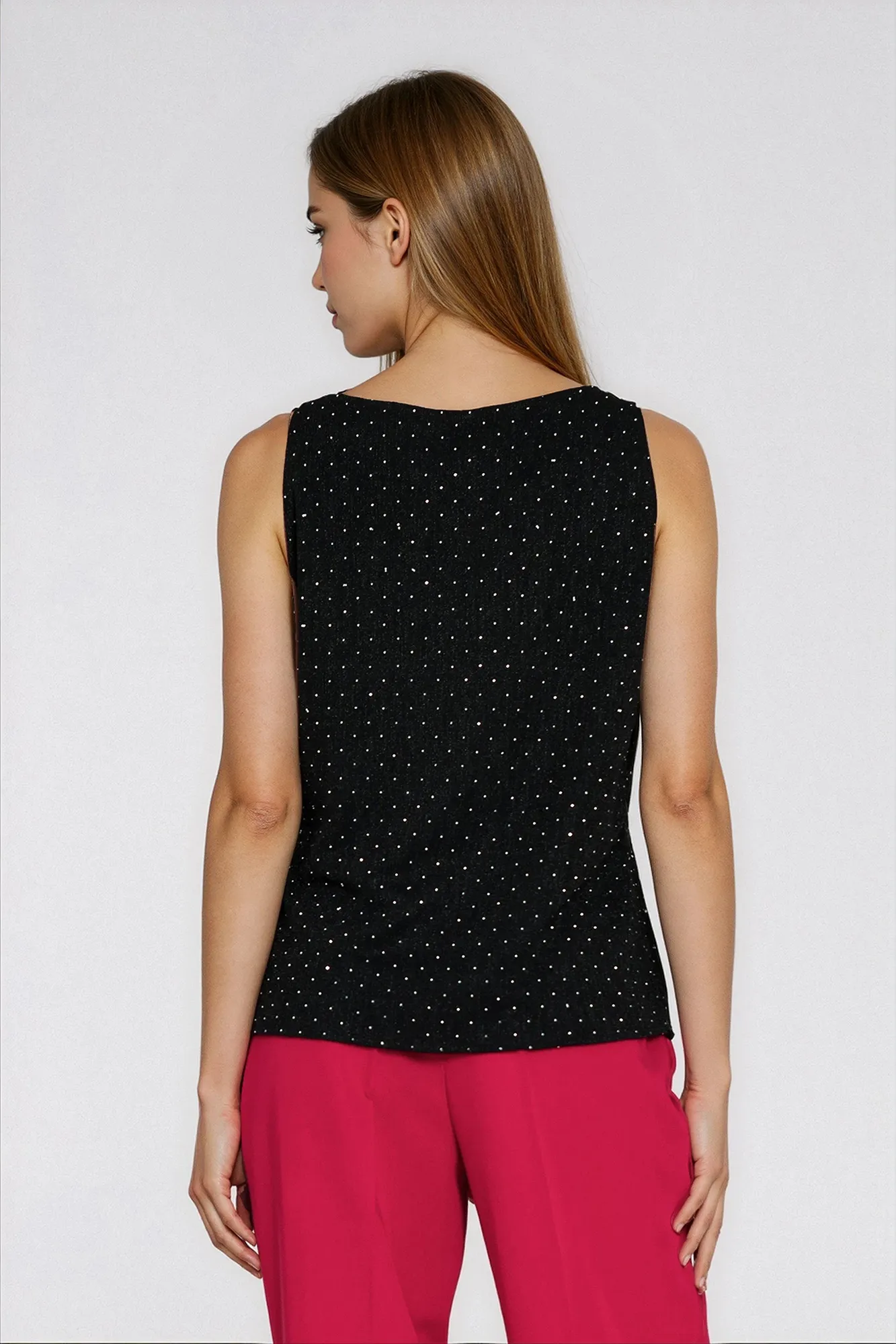 Krój regular. Materał dzianina z błyszczącymi srebrnymi dżetami. Okrągły dekolt. Bez rękawów. Wkładana przez głowę.