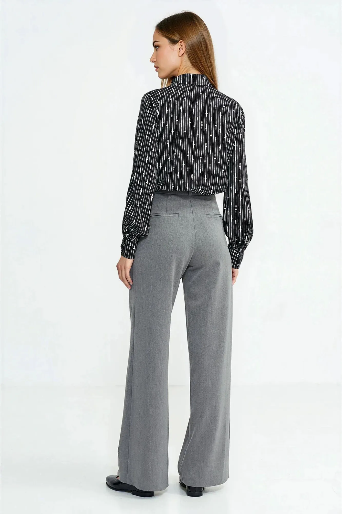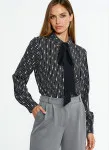 Regular cut. Viscose material, with an interesting pattern. Classic collar with a black sash underneath. Long sleeve with cuff. Button fastening at front.