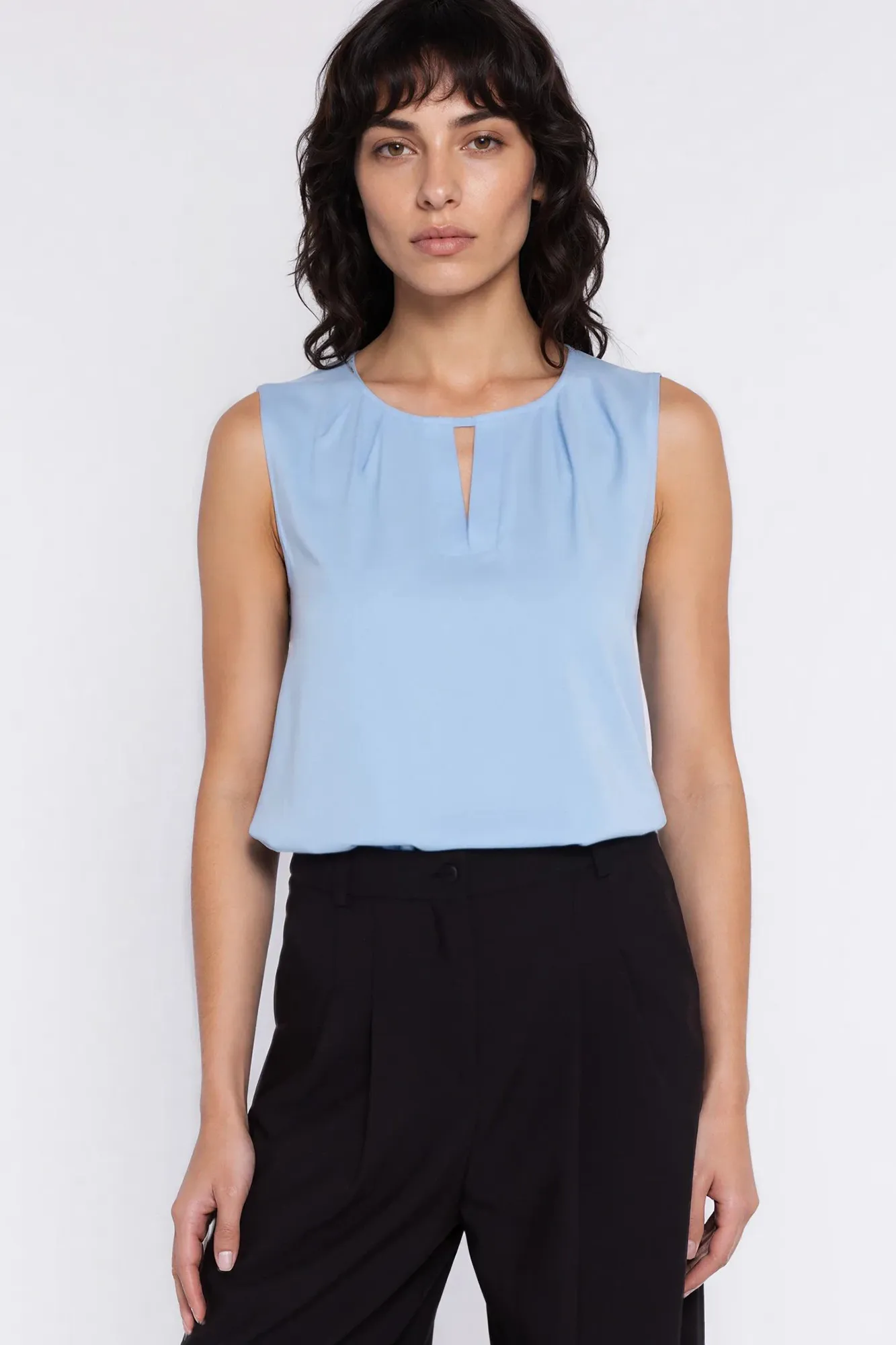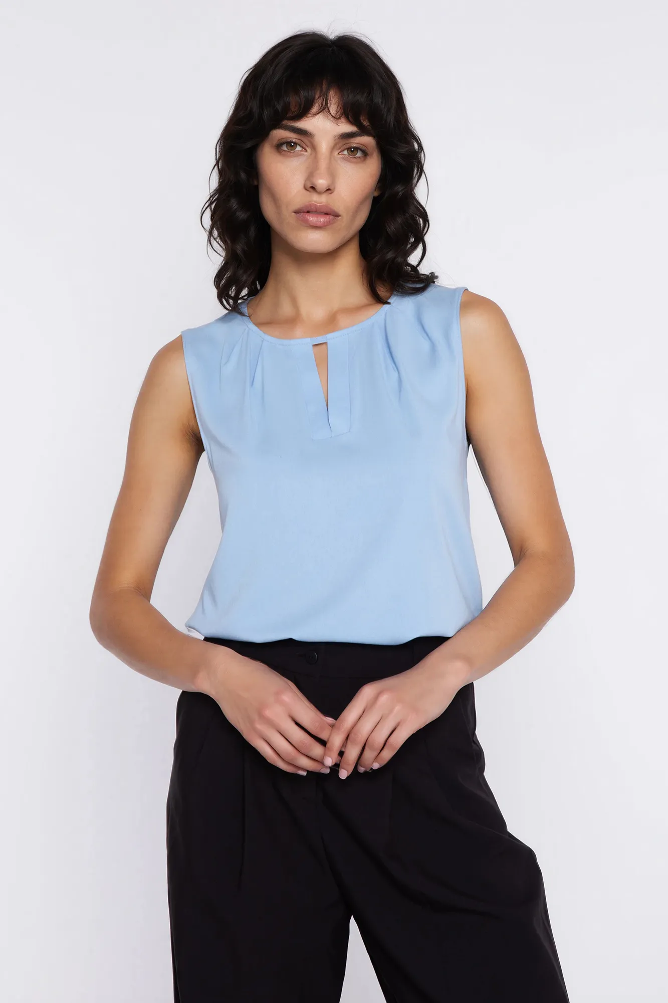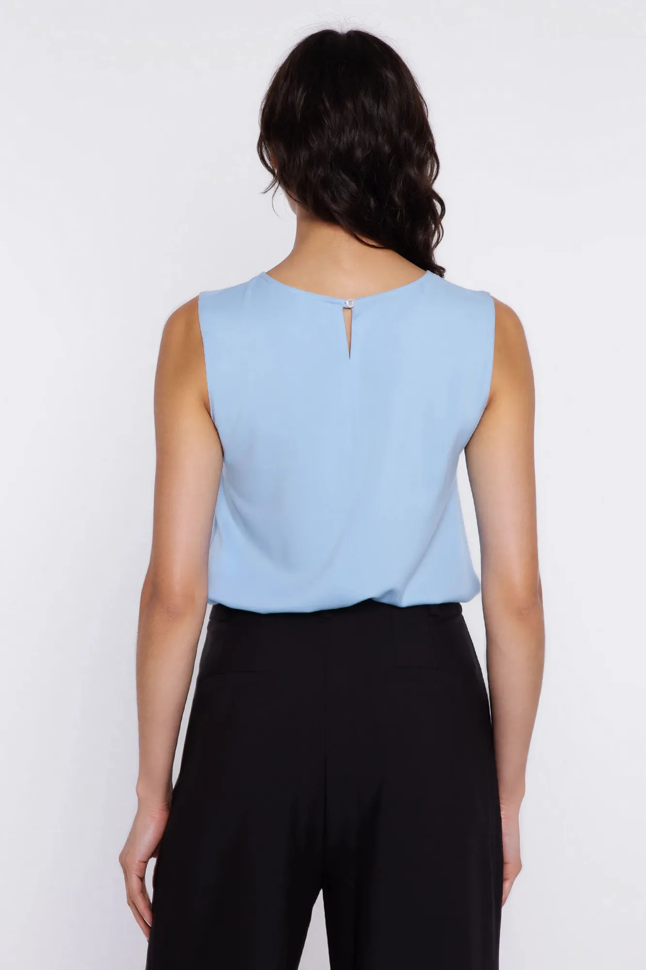 Regular fit. Viscose fabric. Round neckline. Sleeveless. Button fastening at the back. Pull-on style. Decorative darts and V-shaped cut-out at the neckline.