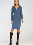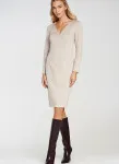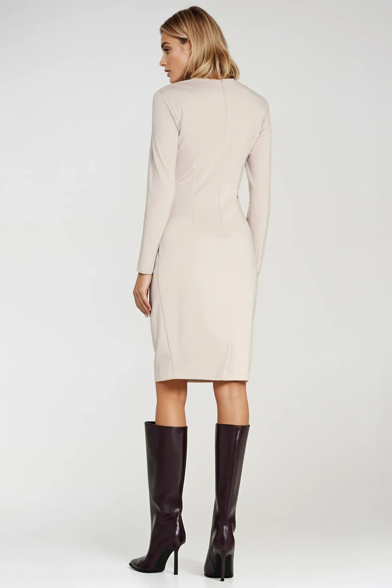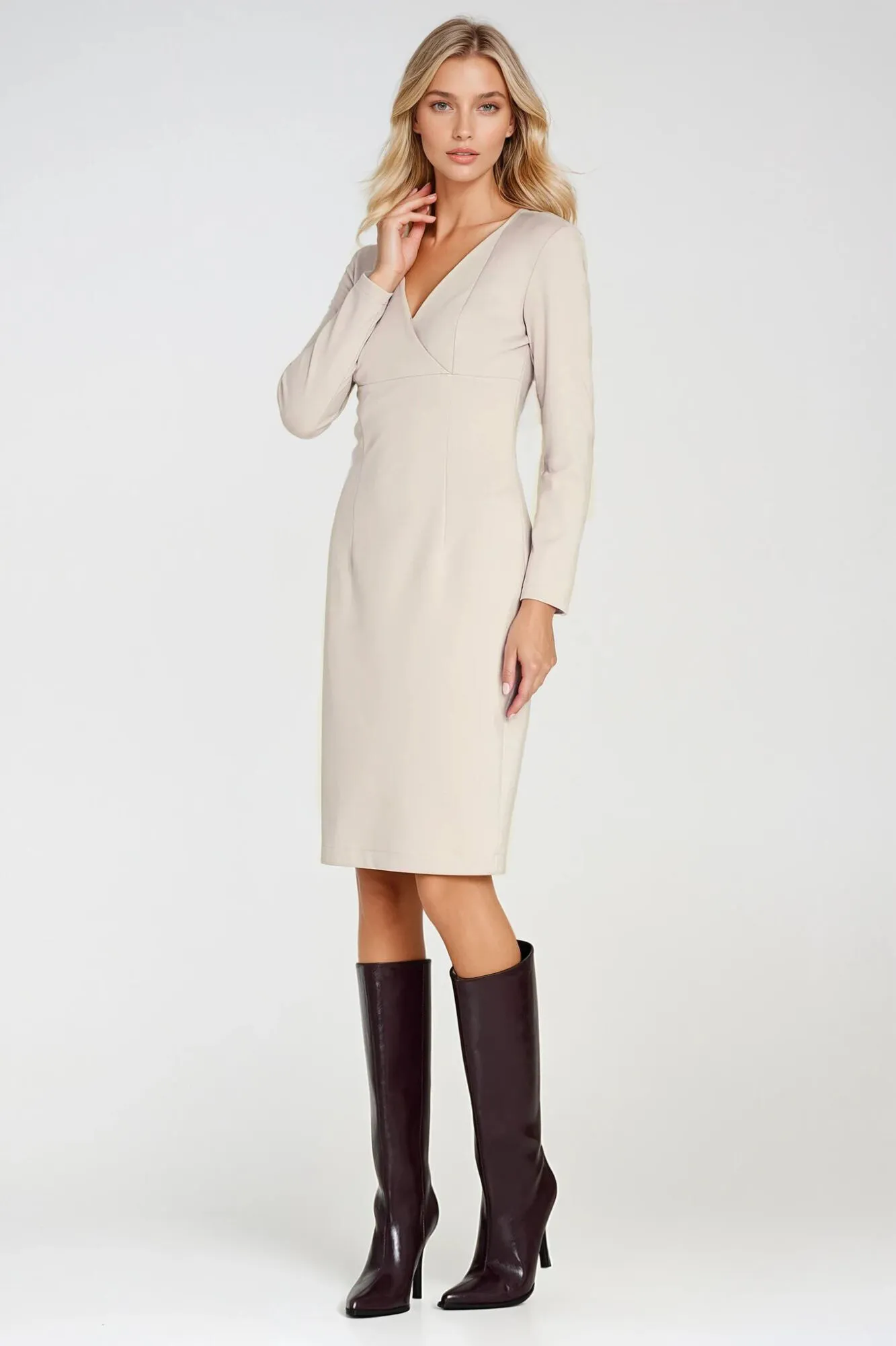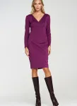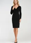 Fitted cut. Knit fabric. Boat neckline in V-shape. Long sleeve. Pencil skirt bottom. Knee length. Back zip closure.