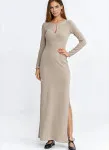 Fitted cut. Ribbed knit fabric. Round neckline with a tear below. Cut under the bust. Long Sleeve. Maxi length. Put on over the head. Slit in the side seam.