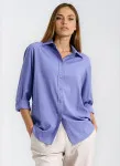 Oversize cut. Viscose material. Violet color- Veri Peri. Classic collar. Long sleeve ended with a cuff. Fastening buttons at the front. There is a yoke on the back with a pleat in the middle.