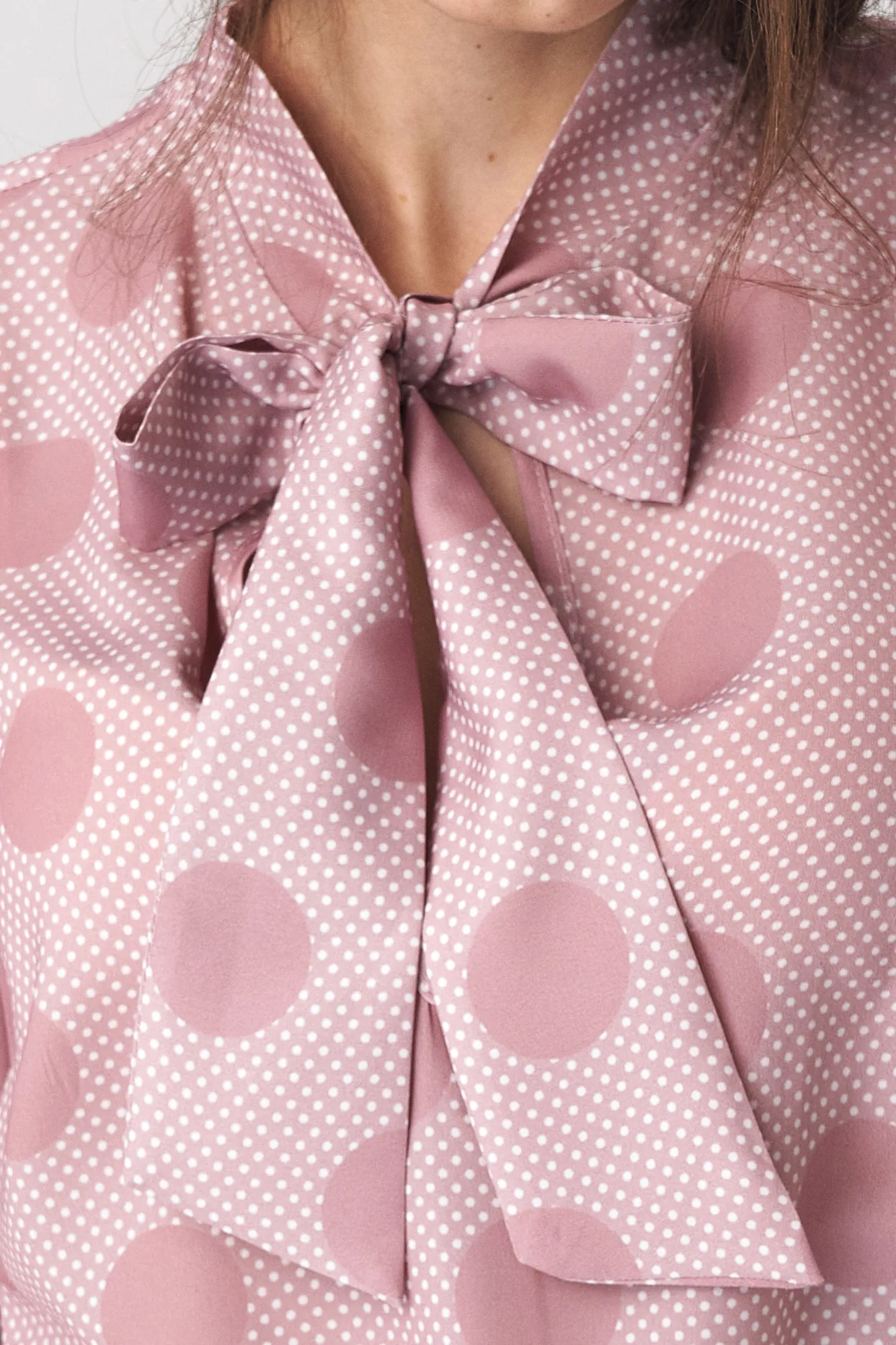 Pinky polka-dot blouse with a tie on the neckline is a charming proposal to break the classic office outfit. Pastel shade and busty sleeves give it a feminine tone. The blouse will create an unusual, graceful soft-office styling with both trousers and a skirt.