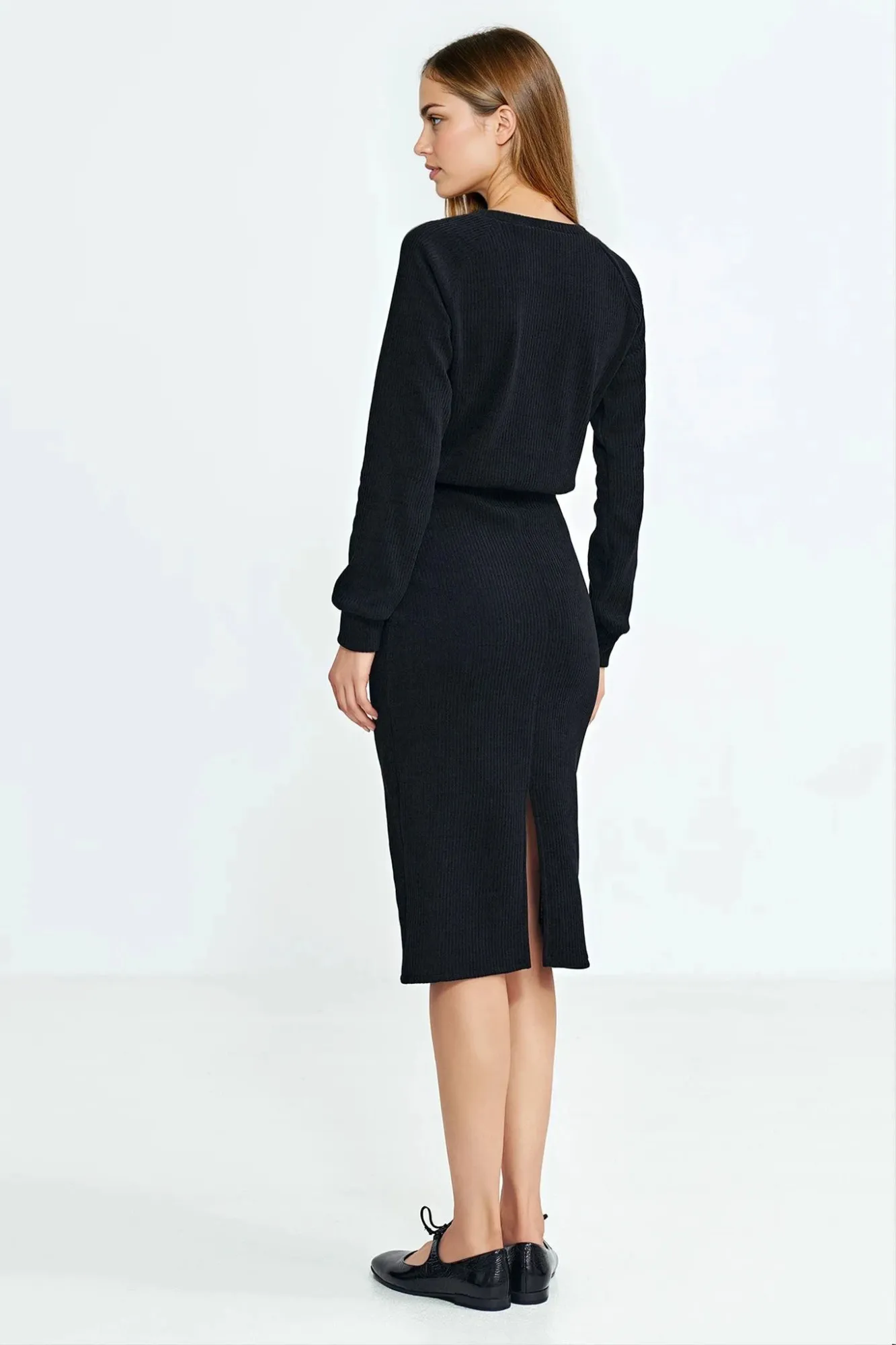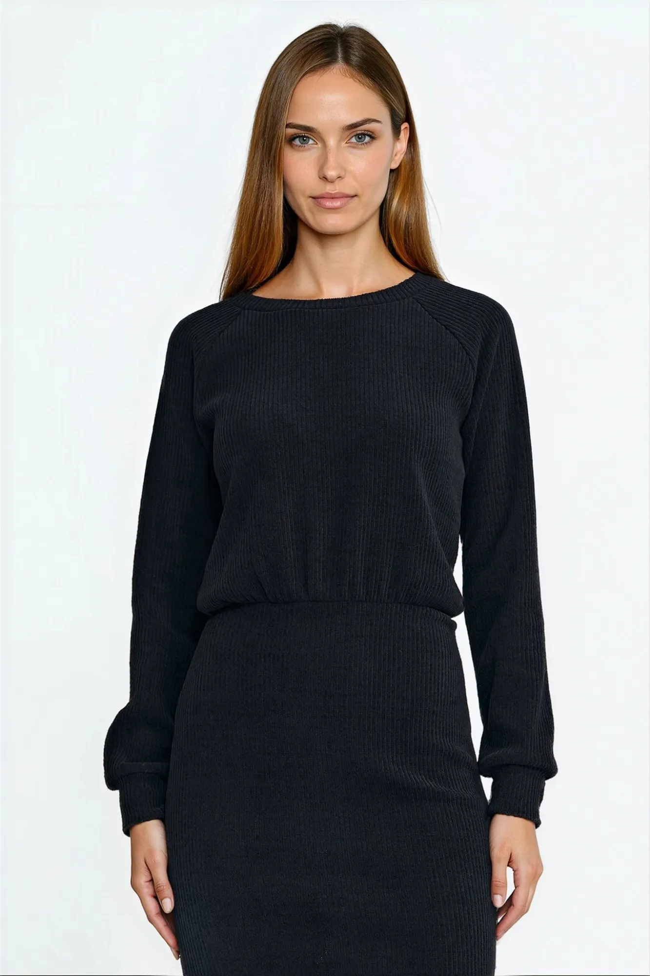 Regular cut. Ribbed knit fabric. Round neckline. Long raglan sleeves finished with a cuff. Elastic waistband emphasizing the waist. Midi length. Put on over the head. Slit at the back. Basic model.