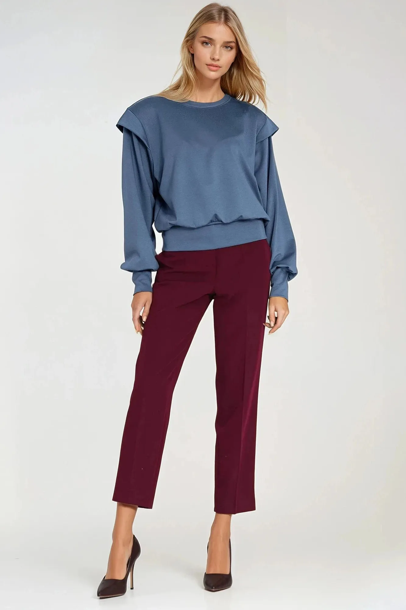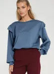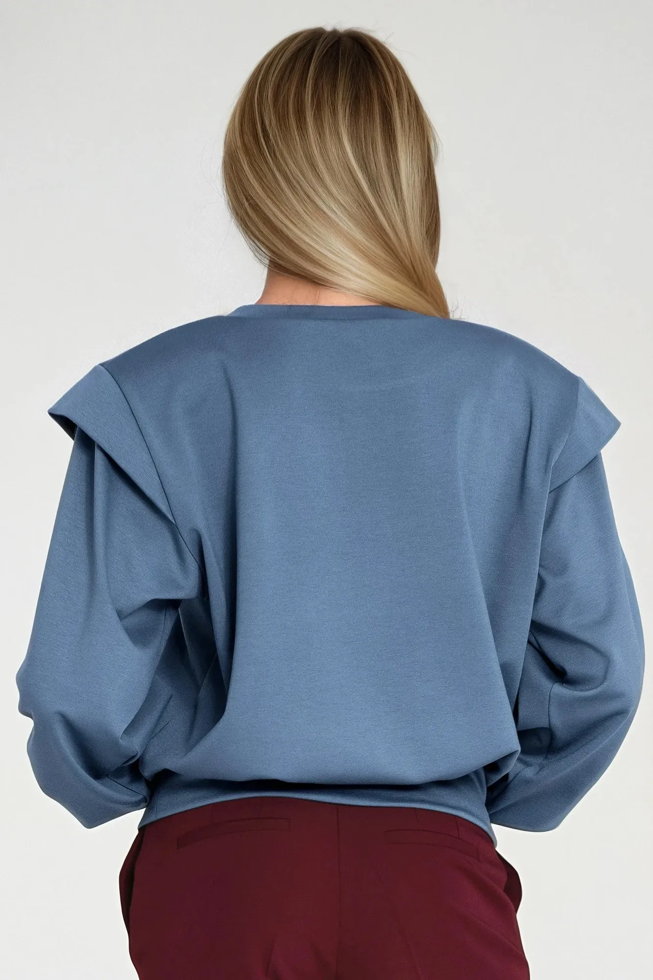 Oversize fit. Round neckline. Long sleeve with shoulder extension. Finished with long bottom cuff. Shoulder pads. Pullover style. High bottom ribbing.