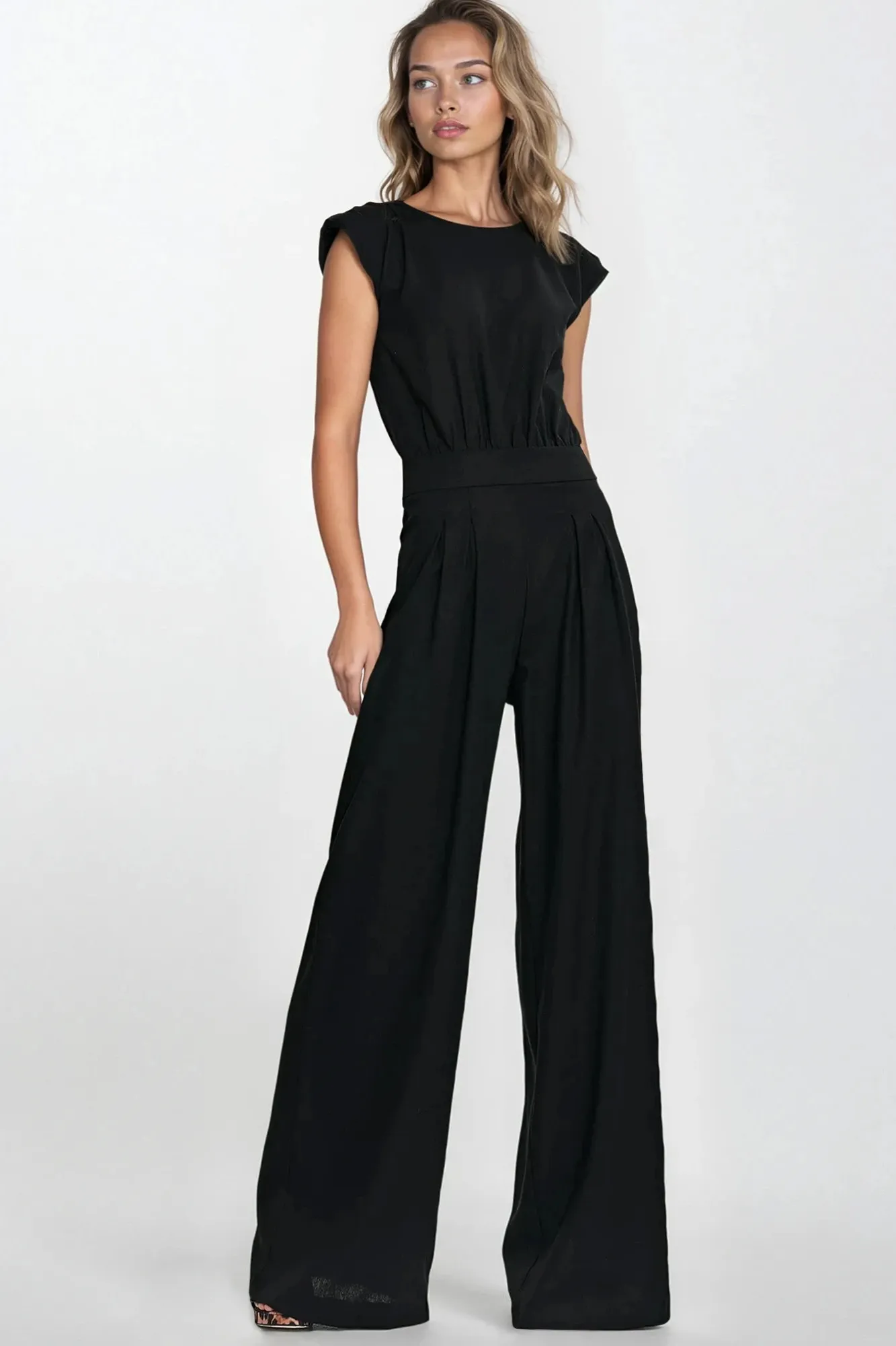 Krój regular fit. Materiał o lnianej fakturze: rayon z dodatkiem lnu. Dekolt typu łódka. Na ramionach poduszki podkreślające linię ramion. Dopasowany na wysokości talii. Spodnie palazzo. Zapinany z tyłu, na suwaki w górnej i dolnej części.