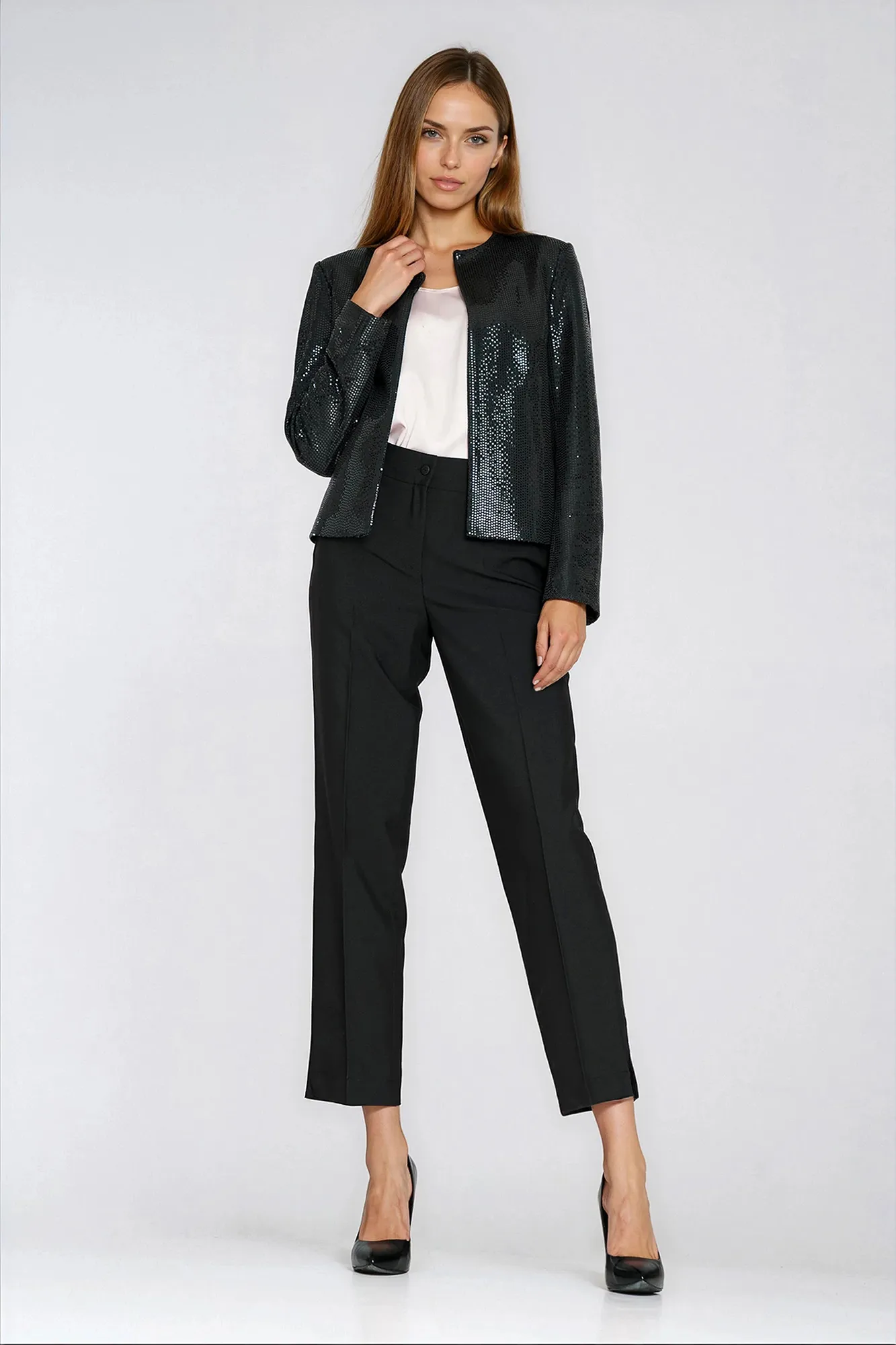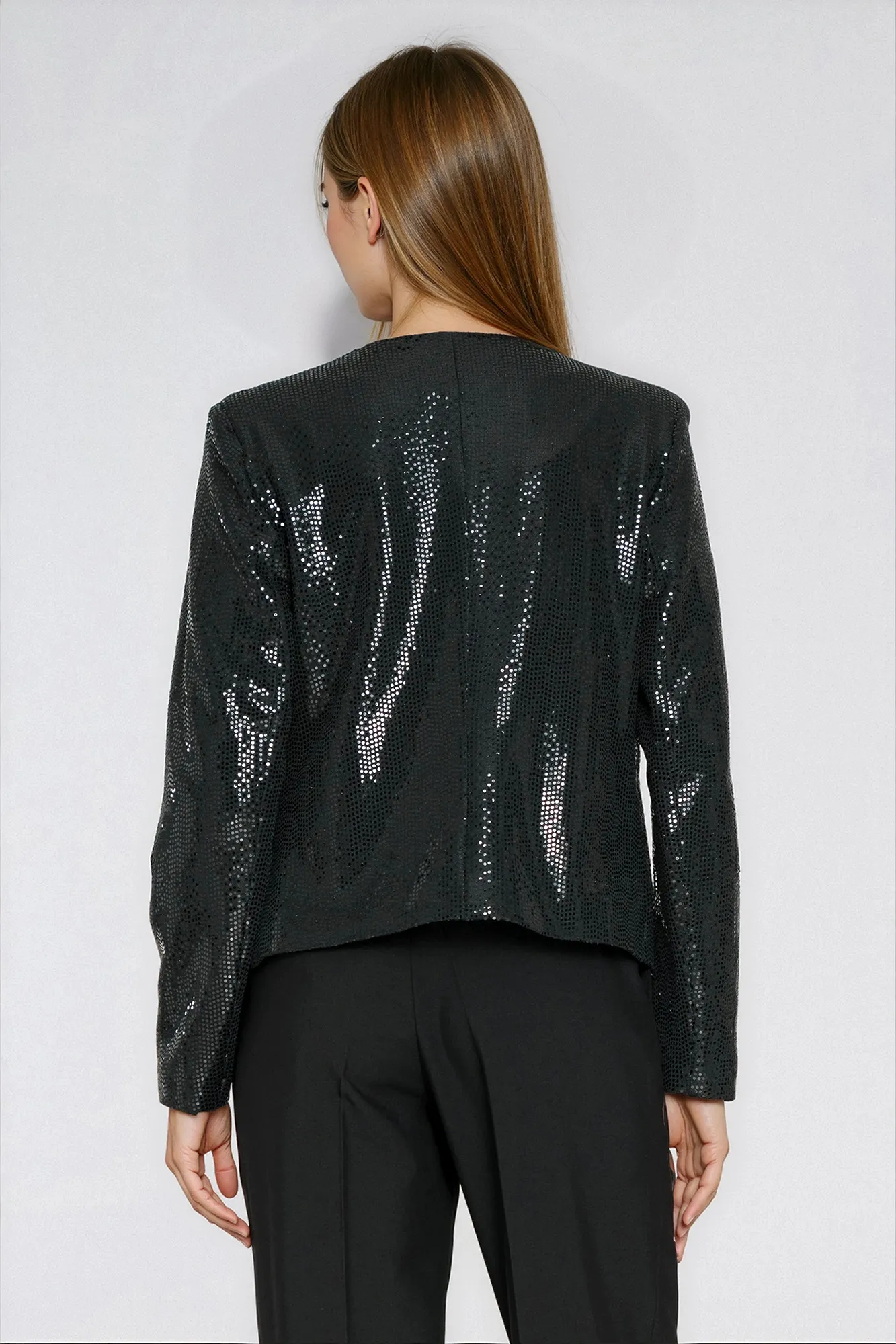 Krój regular. Materiał klejona cekiny. Bez zapięcia. Poduszki na ramionach. Posiada podszewkę.