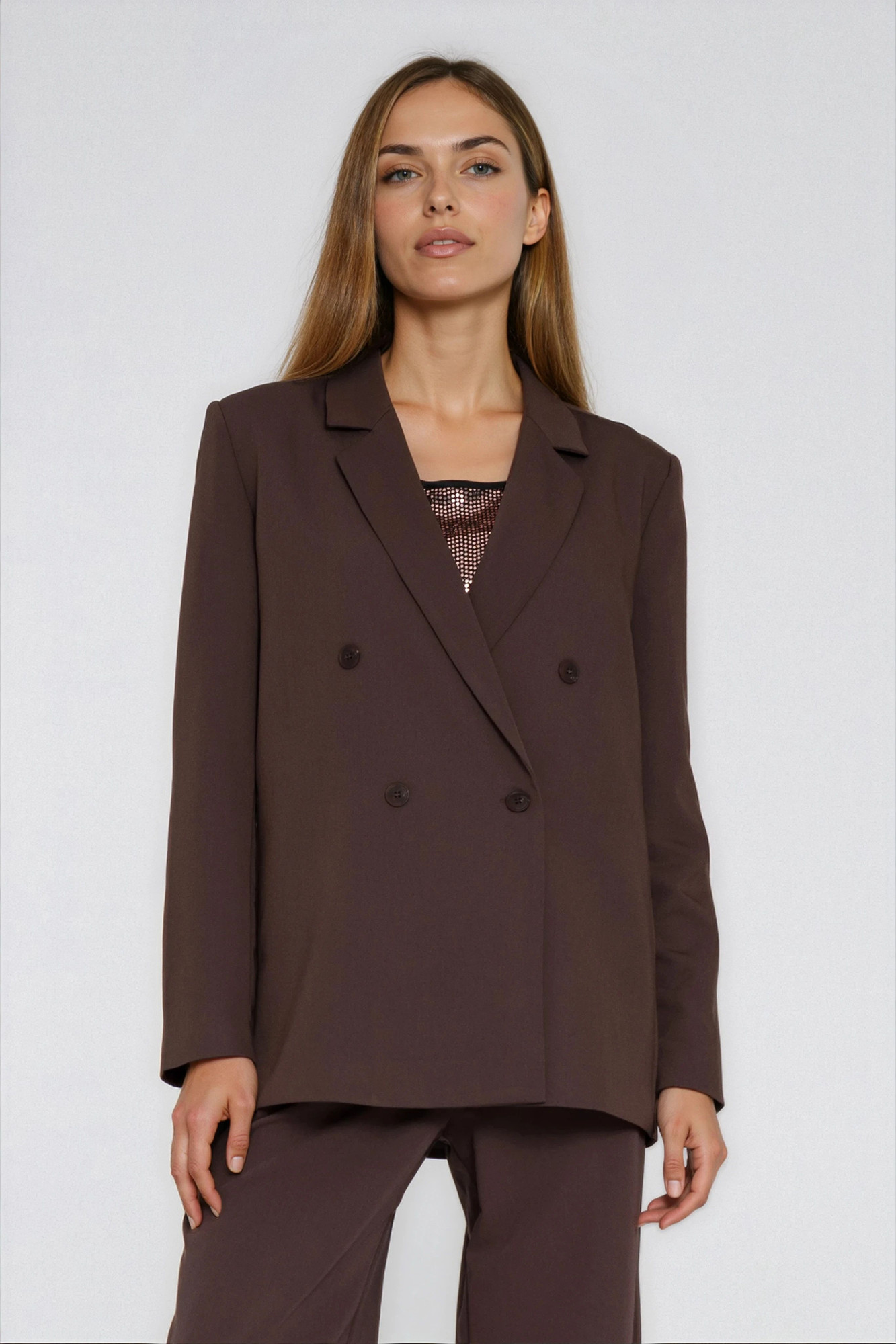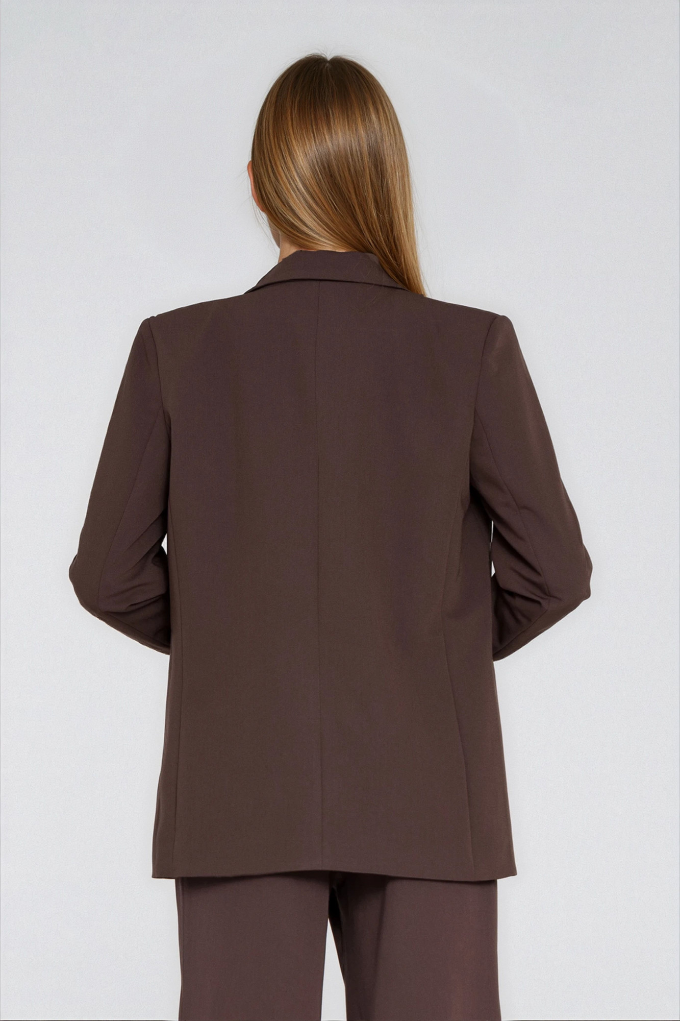 Krój oversize. Kołnierz z wyłożonymi klapami. Długi rękaw z guzikami u dołu. Poduszki na ramionach. Długość za linię bioder. Dwurzędowe zapięcie na guziki z przodu. Posiada podszewkę.