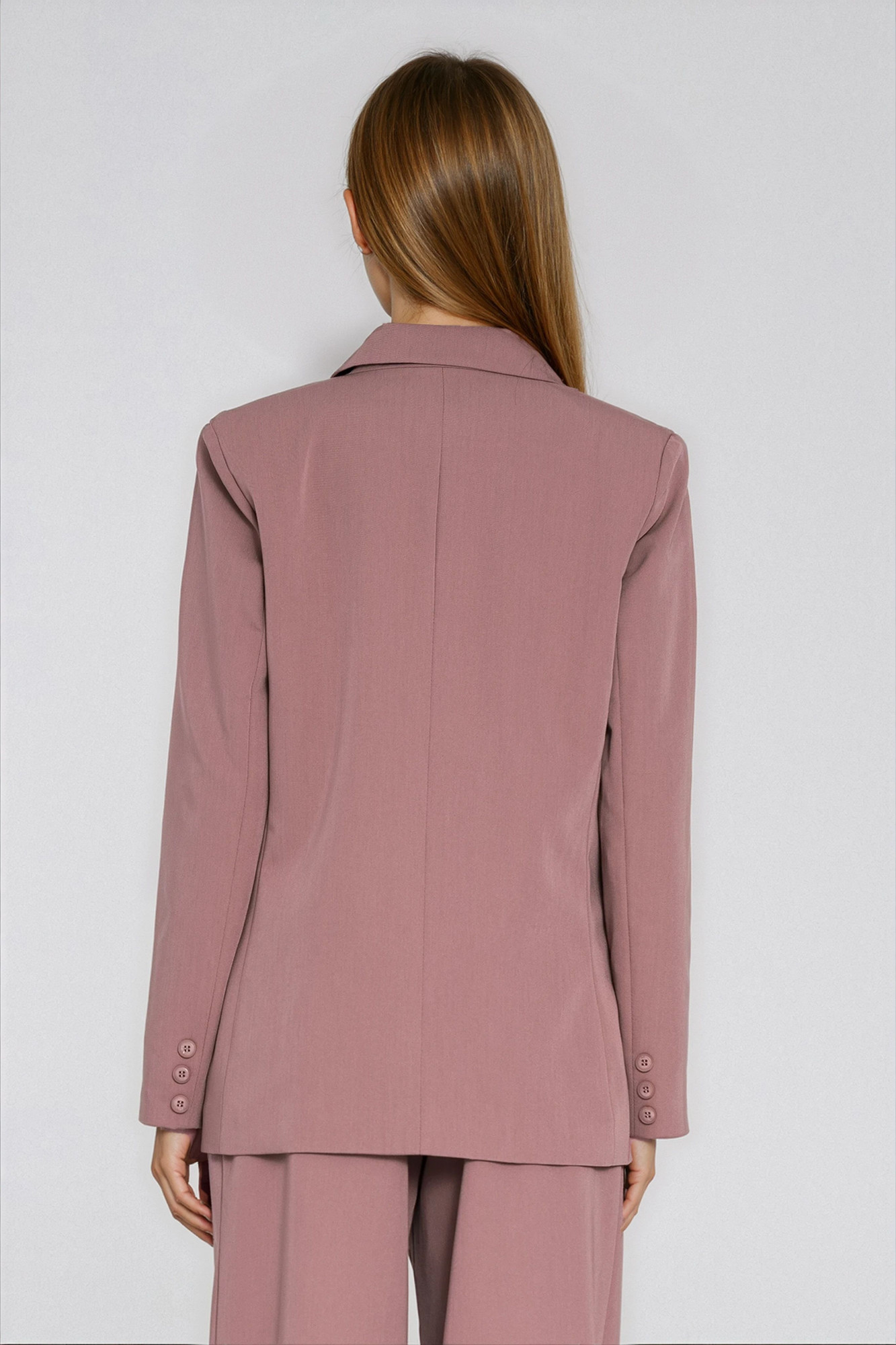 Krój oversize. Kołnierz z wyłożonymi klapami. Długi rękaw z guzikami u dołu. Poduszki na ramionach. Długość za linię bioder. Dwurzędowe zapięcie na guziki z przodu. Posiada podszewkę.