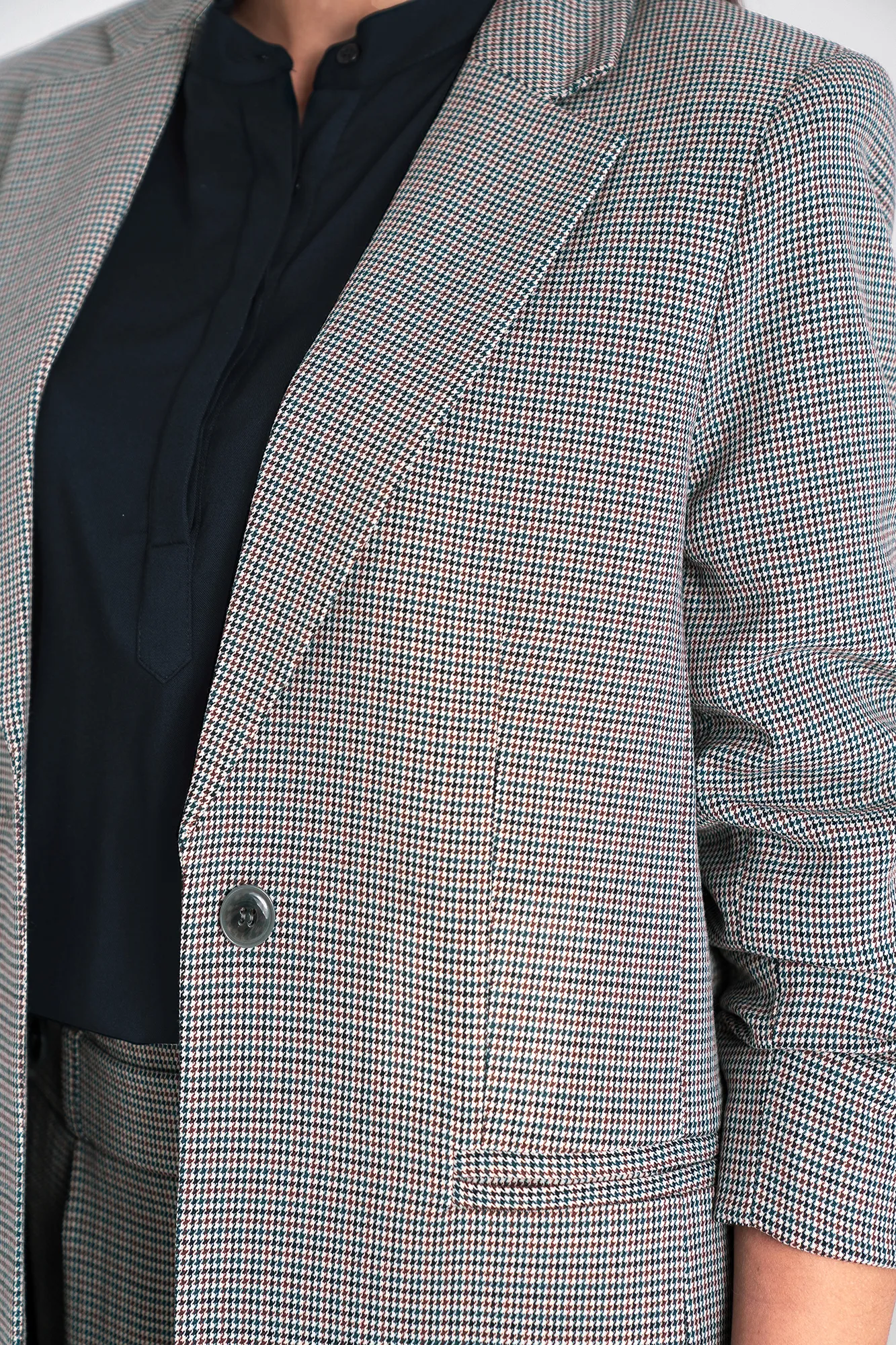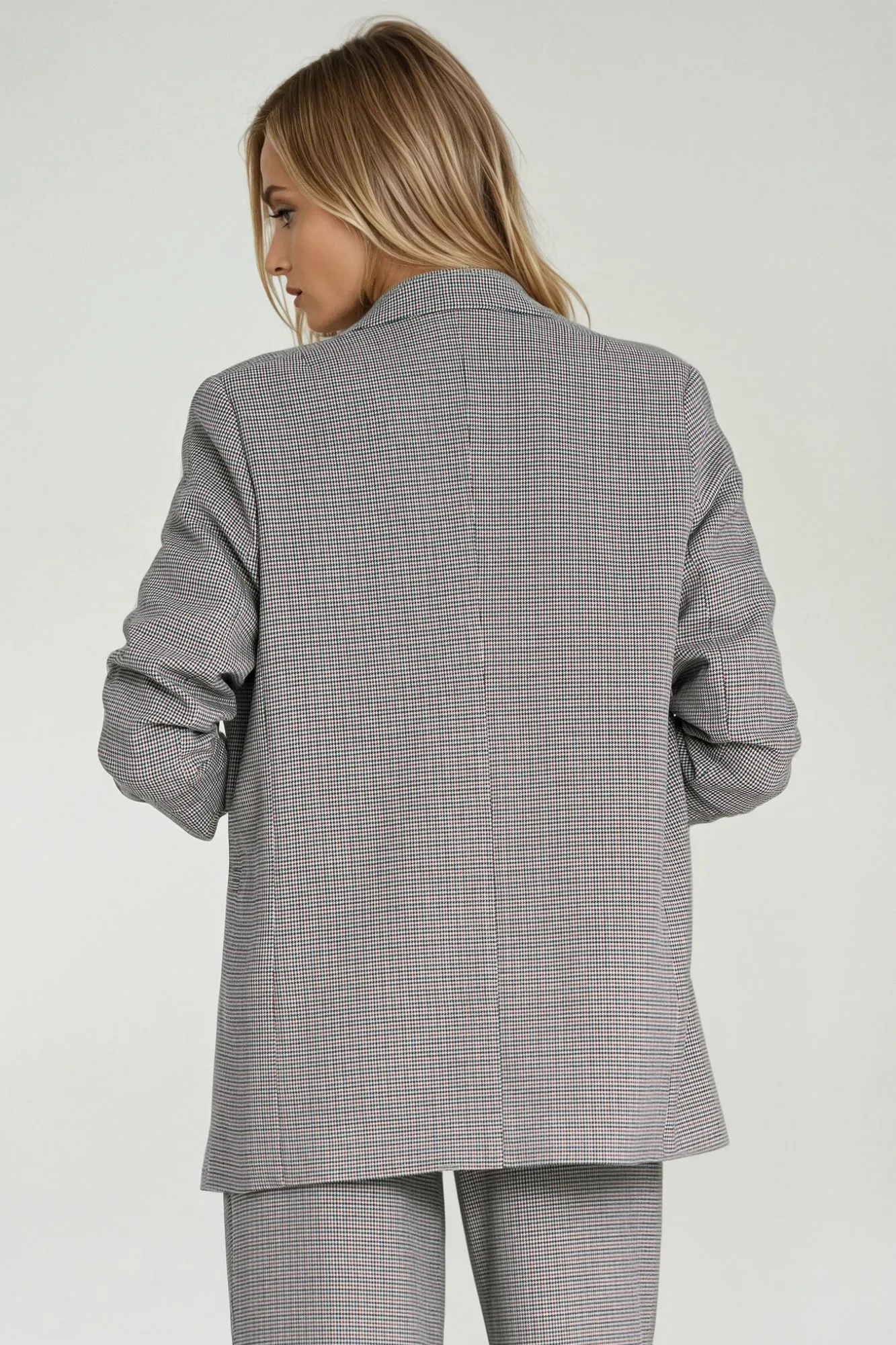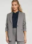 Krój regular, luźny. Materiału o niejednolitym kolorze. Wykładane klapy. Rękaw 3/4 z zakładkami. Zapinana na jeden guzik. Z przodu imitacje kieszeni. Poduszki na ramionach. Z podszewką.