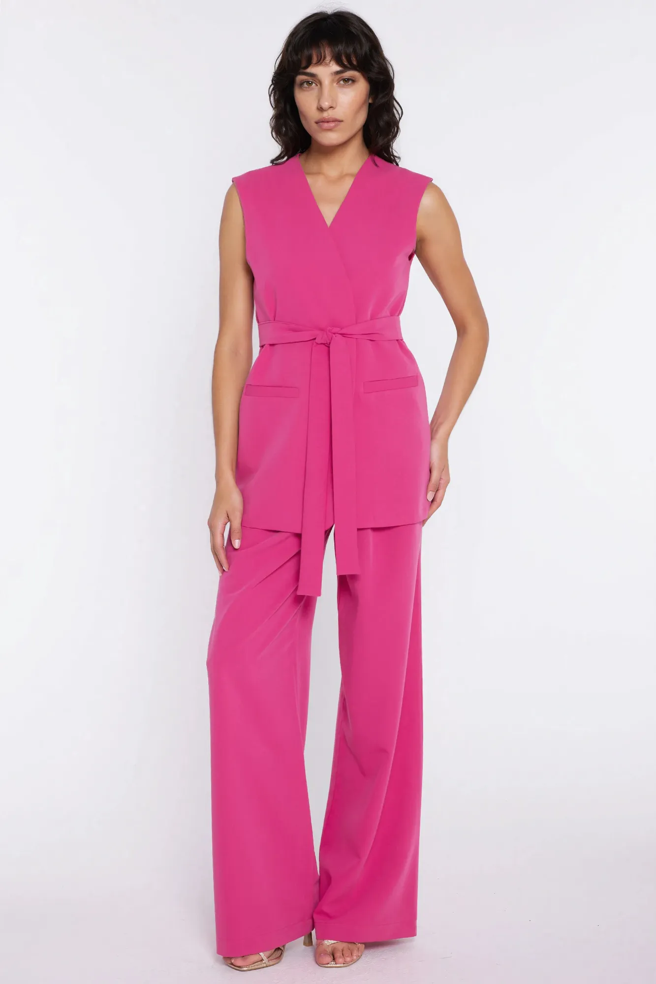 Krój regular fit. Kopertowy dekolt w literę V. Bez zapięcia. Wiązana w pasie. Z przodu imitacja kieszeni. Posiada podszewkę. W komplecie materiałowy pasek.