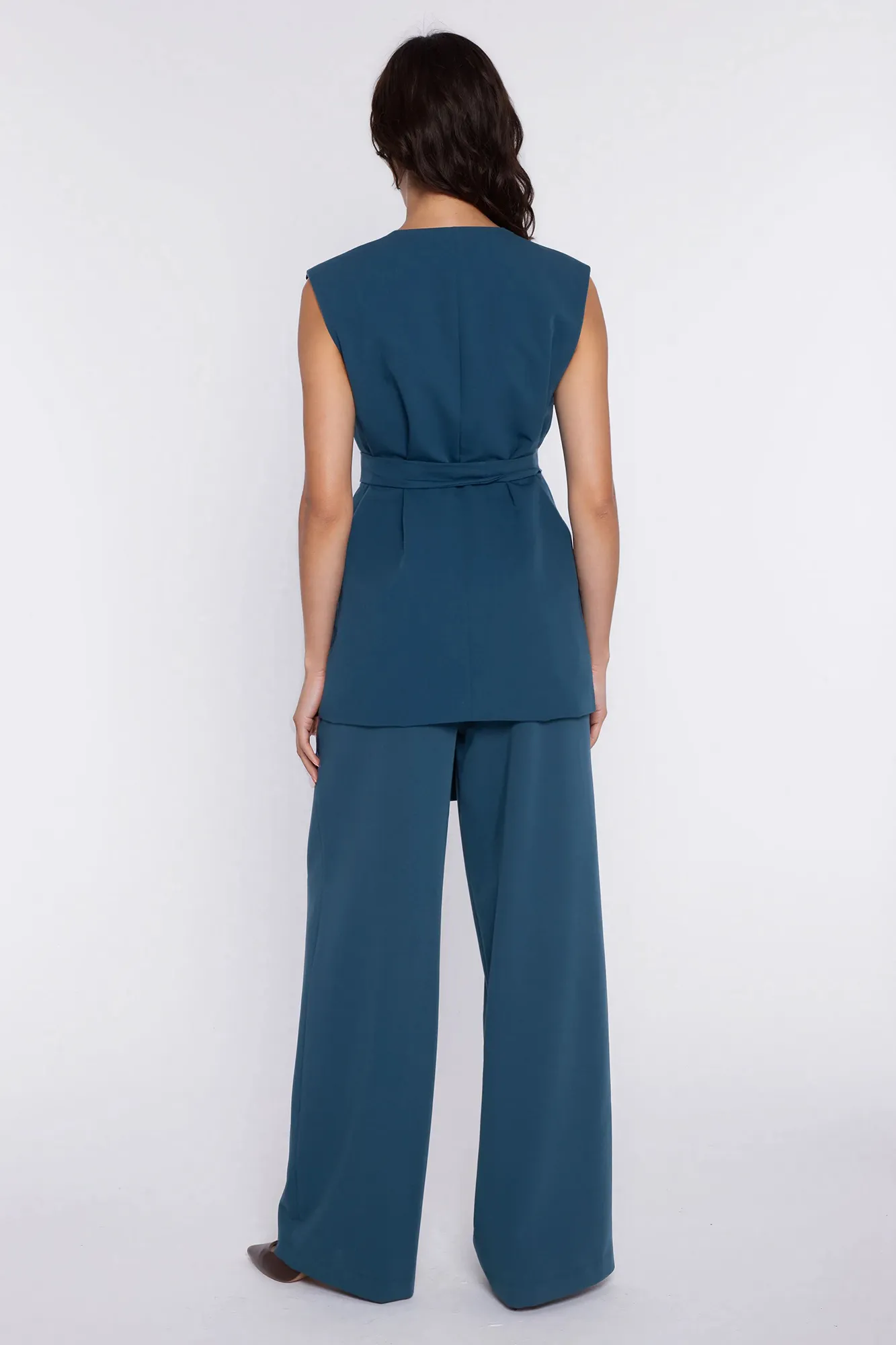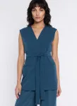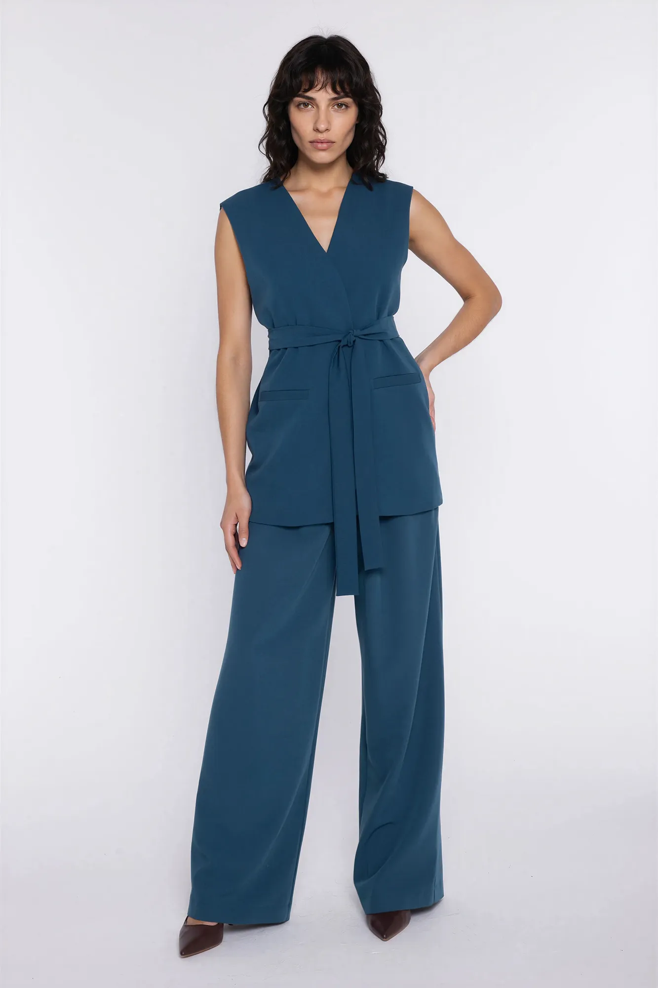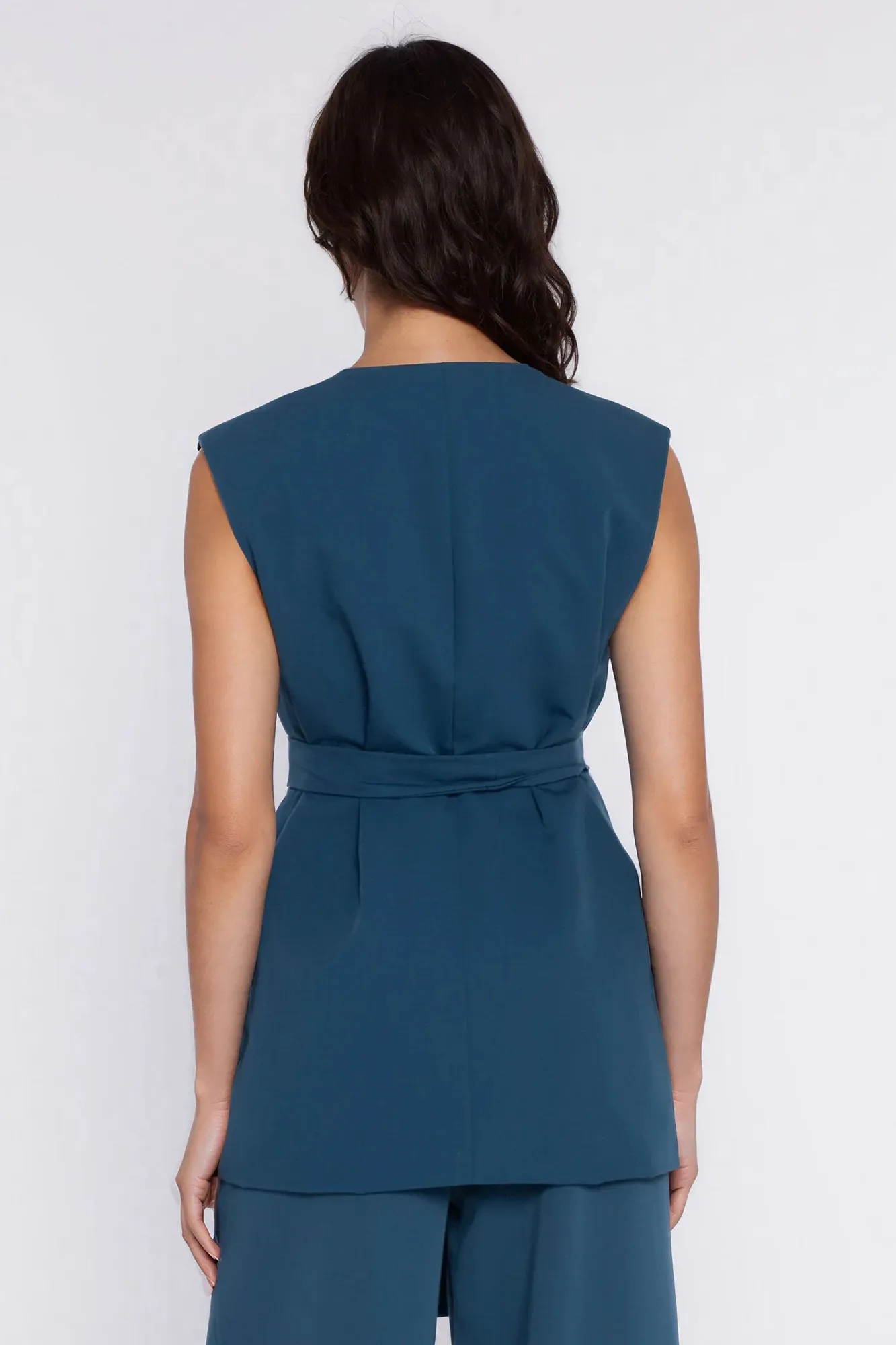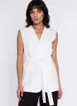 Krój regular fit. Kopertowy dekolt w literę V. Bez zapięcia. Wiązana w pasie. Z przodu imitacja kieszeni. Posiada podszewkę. W komplecie materiałowy pasek.