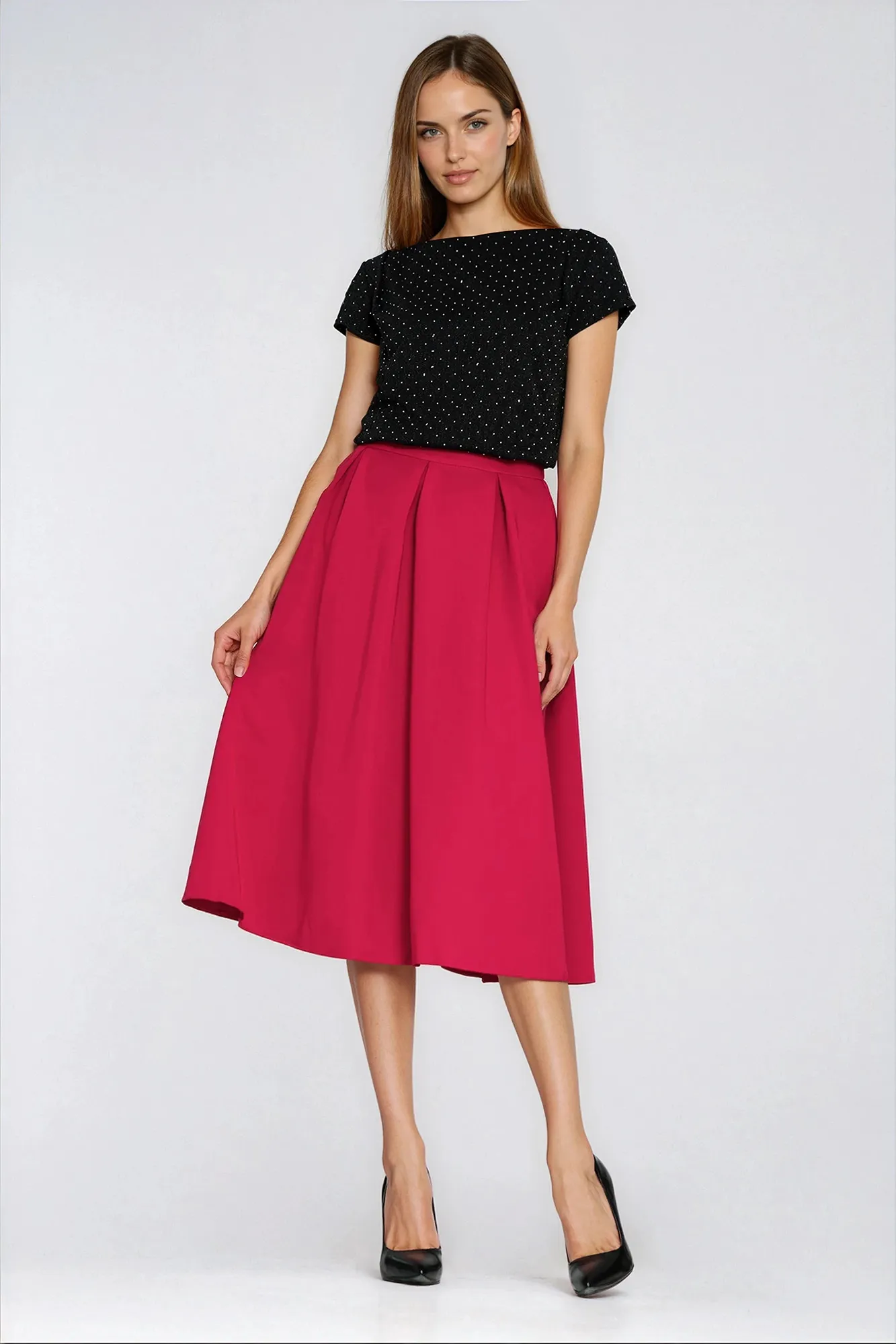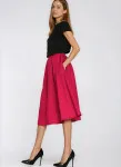 Krój regular. Trapezowy fason z kontrafałdami, dopasowana w talii. Długość do połowy łydki. Zapinana na zamek z tyłu. Kieszenie.
