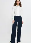 Krój regular. Średni stan. Nogawka szeroka, typu wide leg. Zaprasowane kanty z przodu i z tyłu. Zapięcie na suwak i guzik. Klasyczne kieszenie z przodu. W pasku, na bokach i z tyłu wszyta guma dopasowująca spodnie do figury.