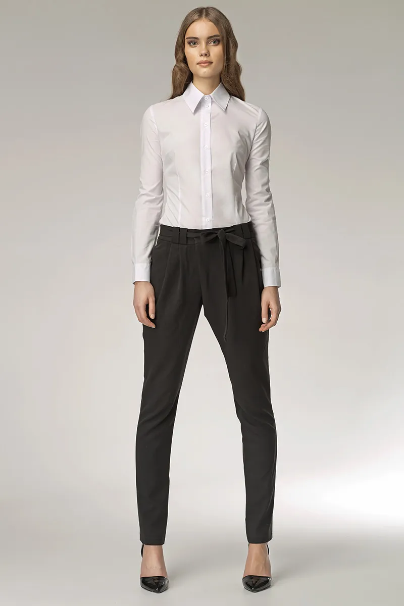 Spodnie z nietypowym zapięciem w różnych zestawieniach