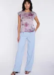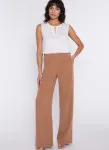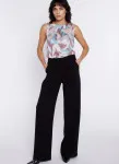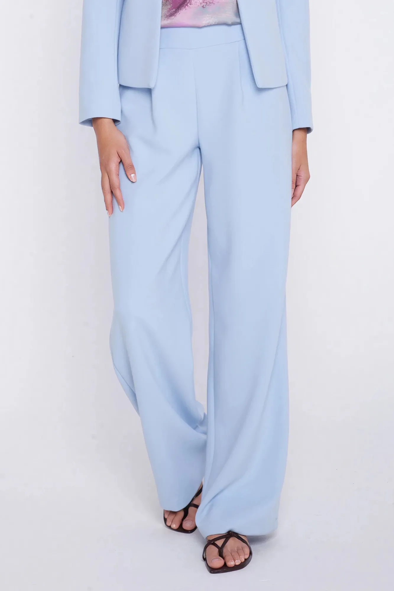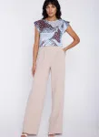 Krój relaxed fit. Wysoki stan. Ozdobne zakładki z przodu. Nogawki wide leg- szerokie, długie. Guma na tylnej części pasa. Klasyczne kieszenie z przodu. Szeroki pas.