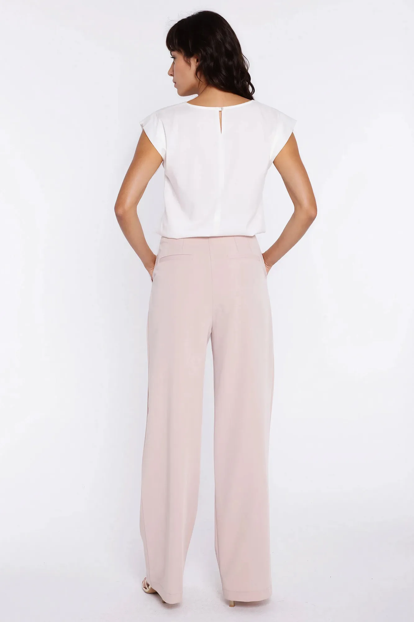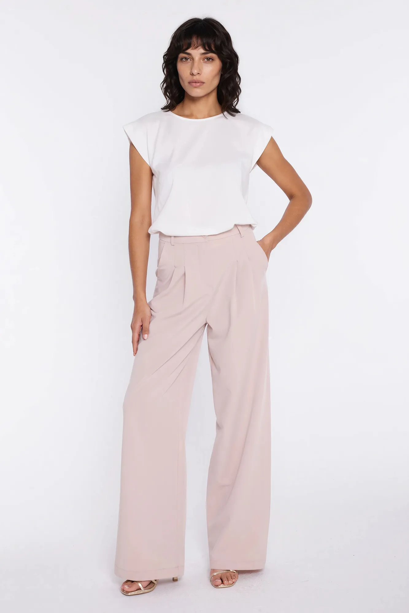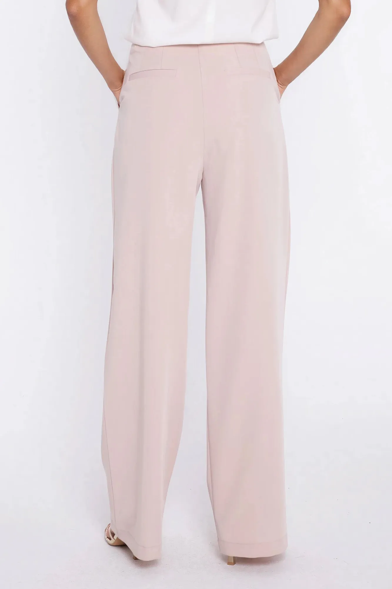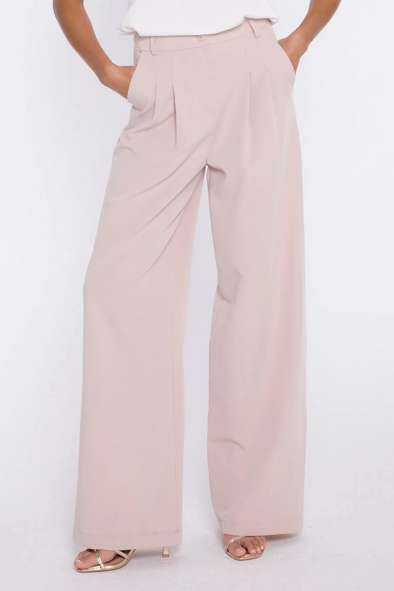 Krój relaxed fit. Wysoki stan. Ozdobne zakładki z przodu. Nogawki wide leg- szerokie, długie. Zapięcie z przodu, na suwak i guzik. Klasyczne kieszenie z przodu i imitacje kieszeni z tyłu. Szlufki na pasek.