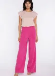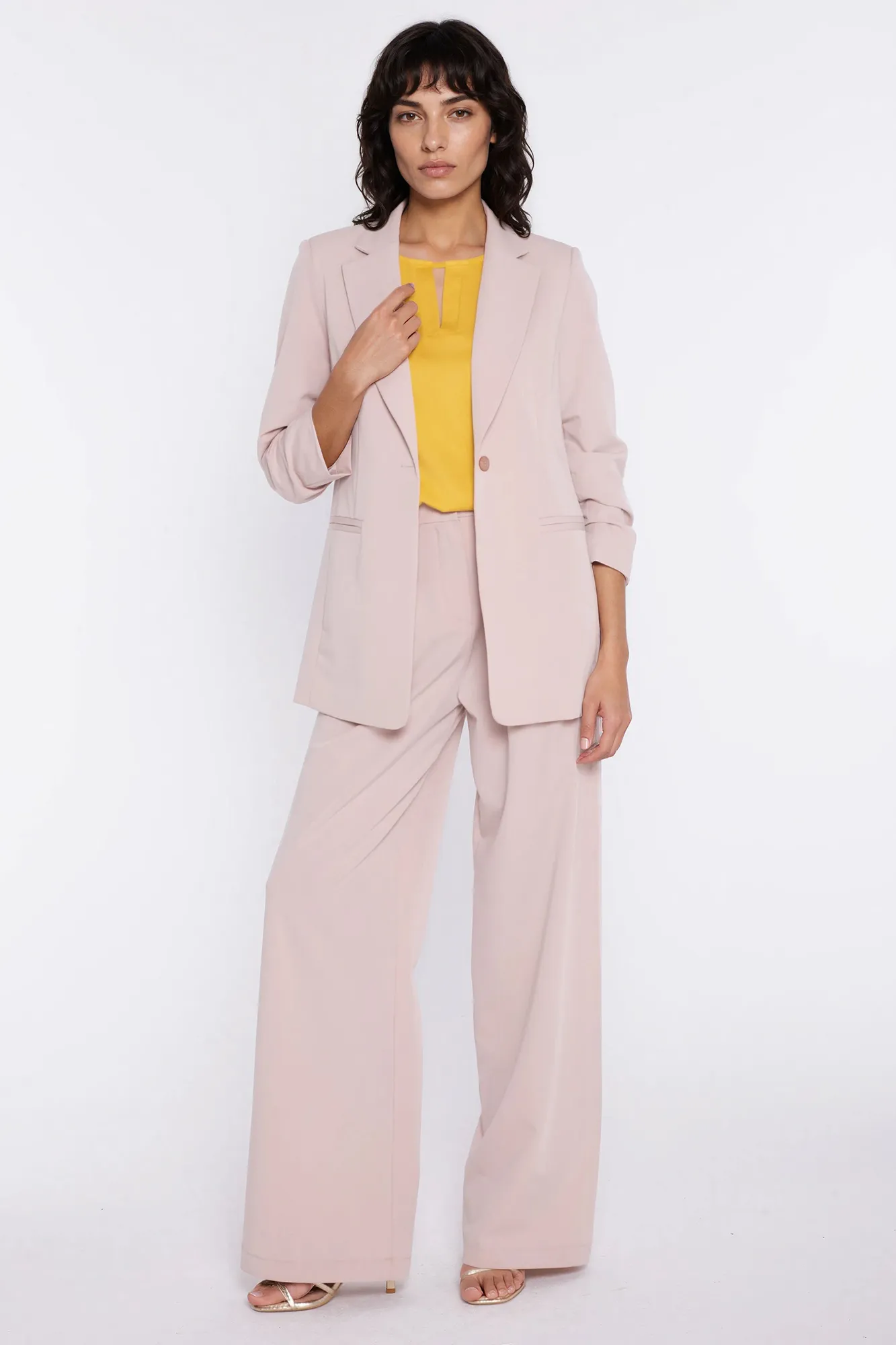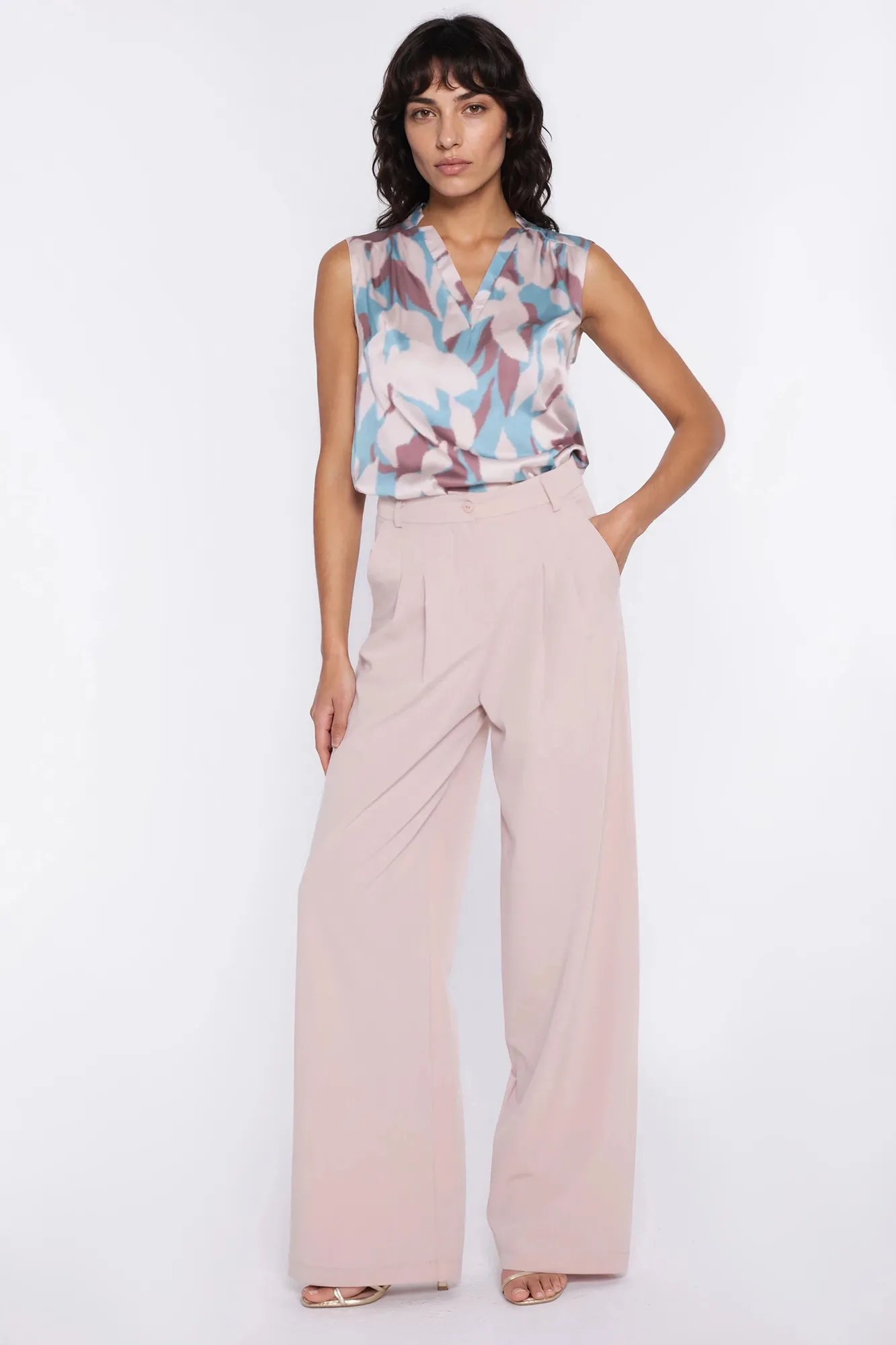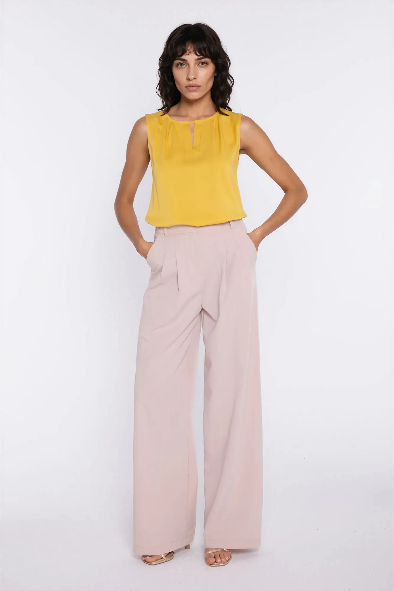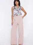 Krój relaxed fit. Wysoki stan. Ozdobne zakładki z przodu. Nogawki wide leg- szerokie, długie. Zapięcie z przodu, na suwak i guzik. Klasyczne kieszenie z przodu i imitacje kieszeni z tyłu. Szlufki na pasek.