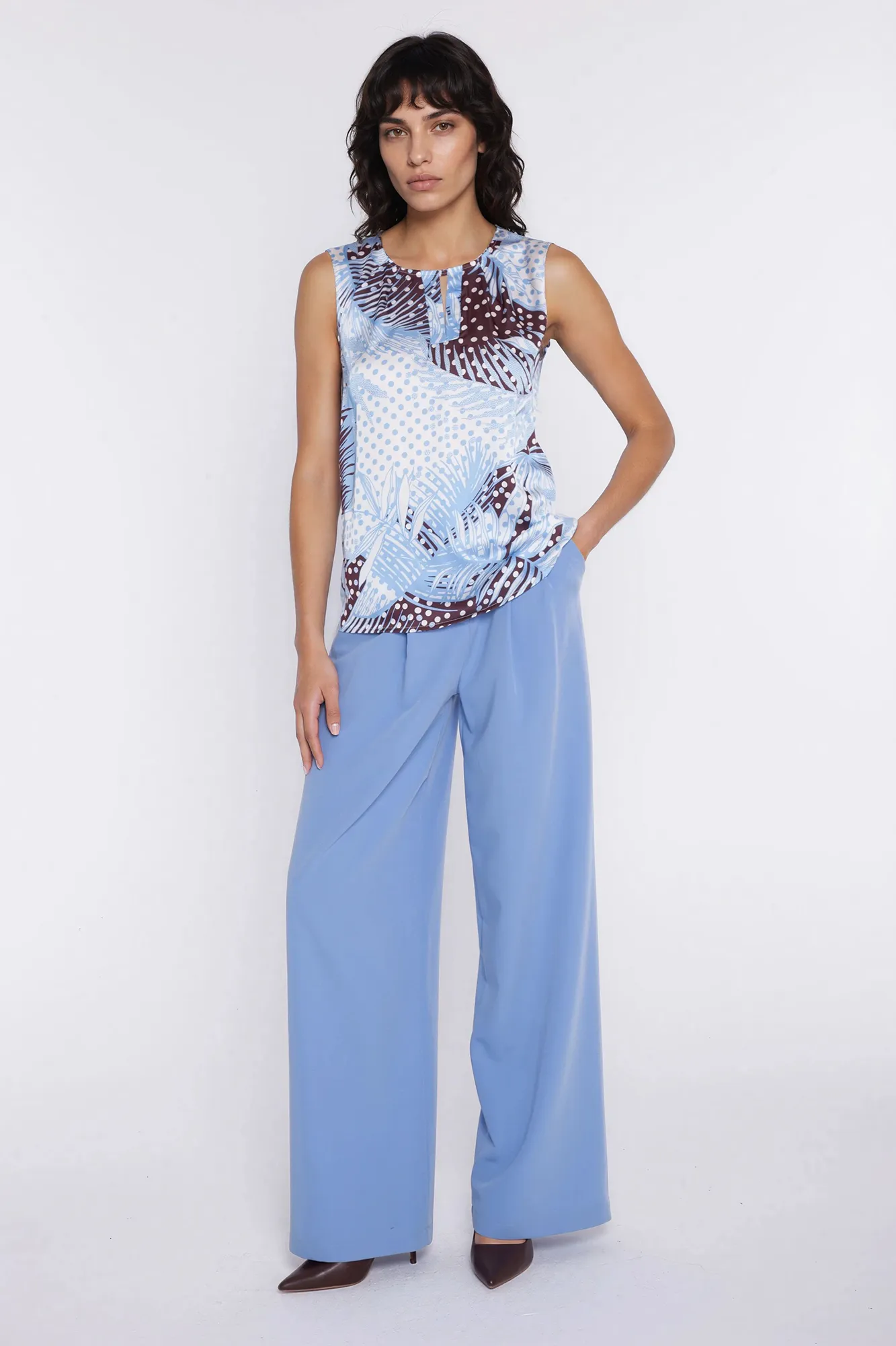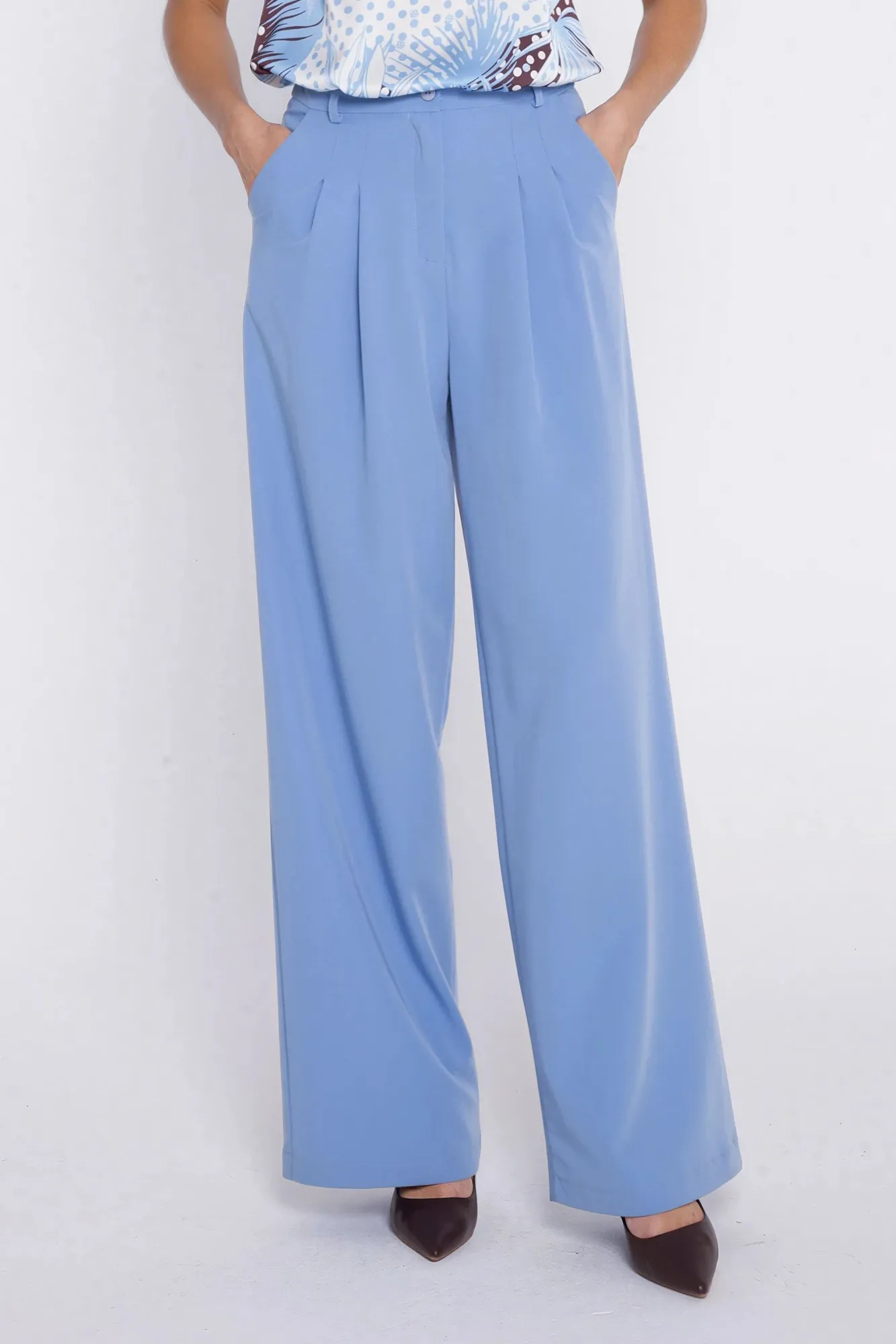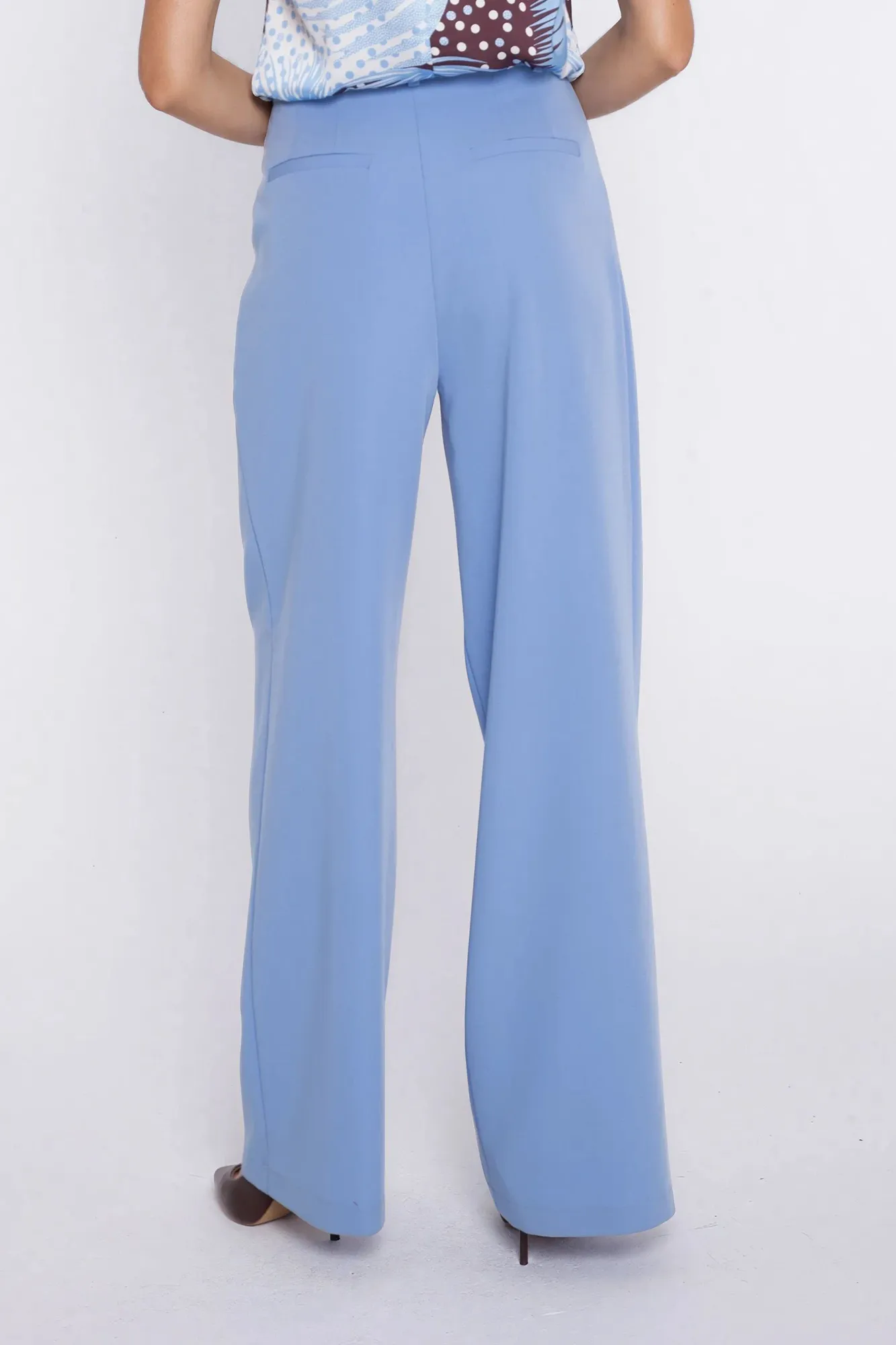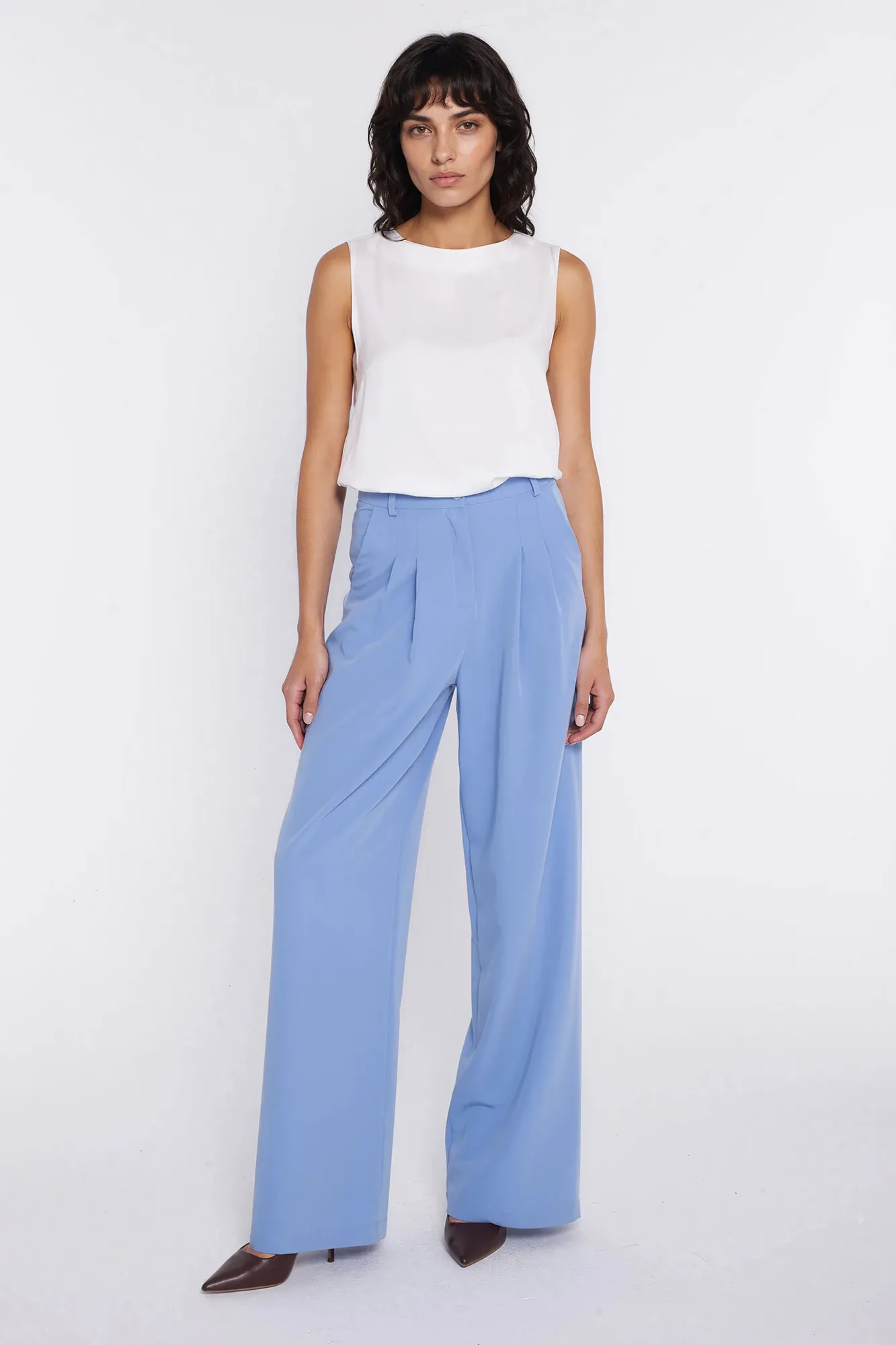 Krój relaxed fit. Wysoki stan. Ozdobne zakładki z przodu. Nogawki wide leg- szerokie, długie. Zapięcie z przodu, na suwak i guzik. Klasyczne kieszenie z przodu i imitacje kieszeni z tyłu. Szlufki na pasek.