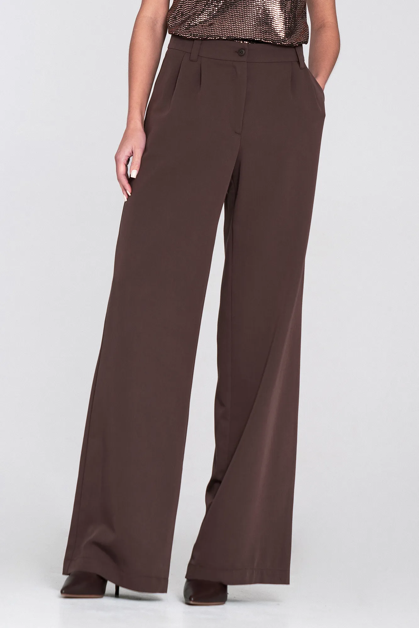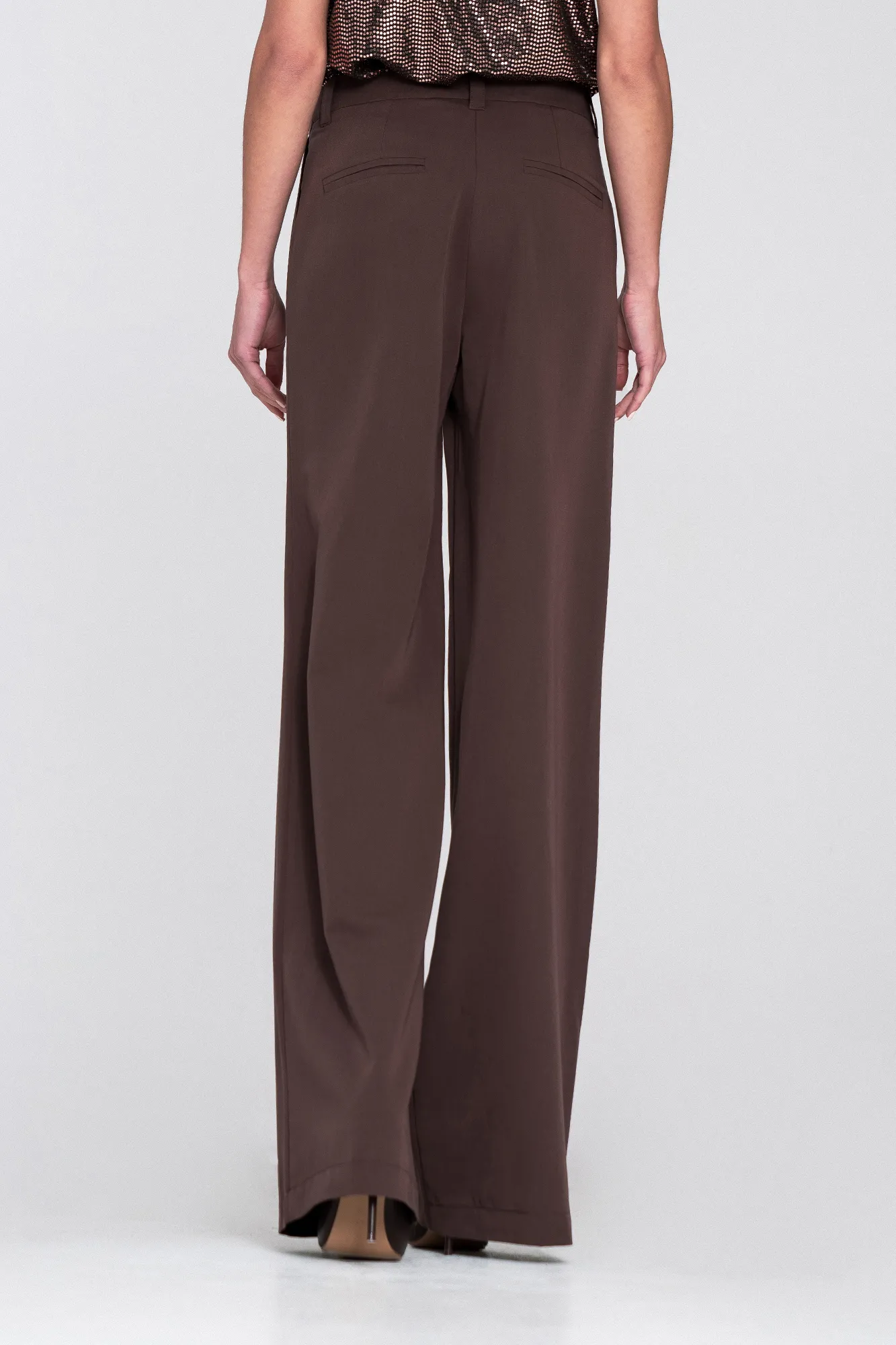 Krój relaxed fit. Średni stan. Ozdobne zakładki z przodu. Nogawka wide leg- szeroki krój. Zapięcie z przodu, na suwak i guzik. Klasyczne kieszenie z przodu i imitacje kieszeni z tyłu. Szlufki na pasek.