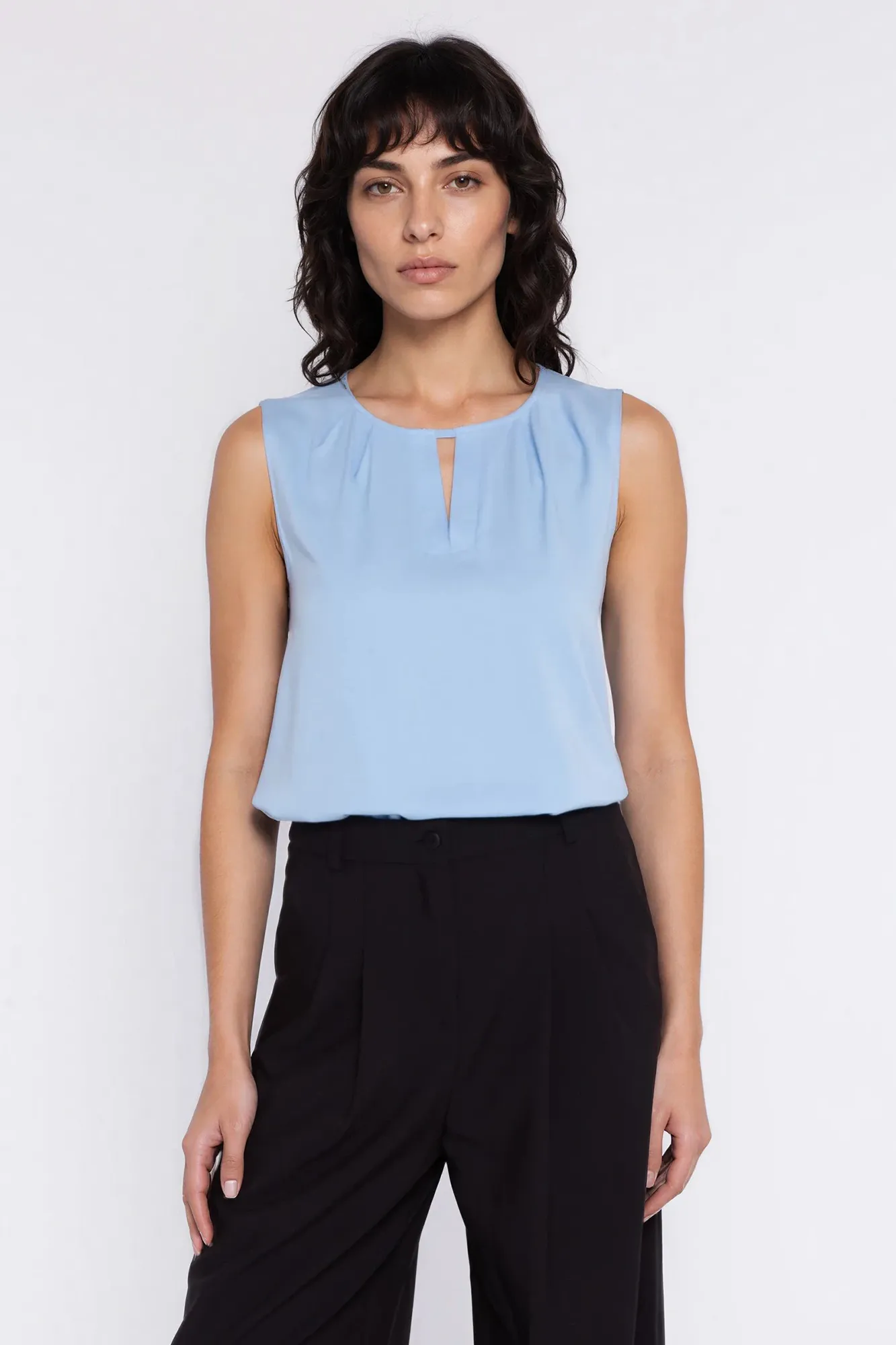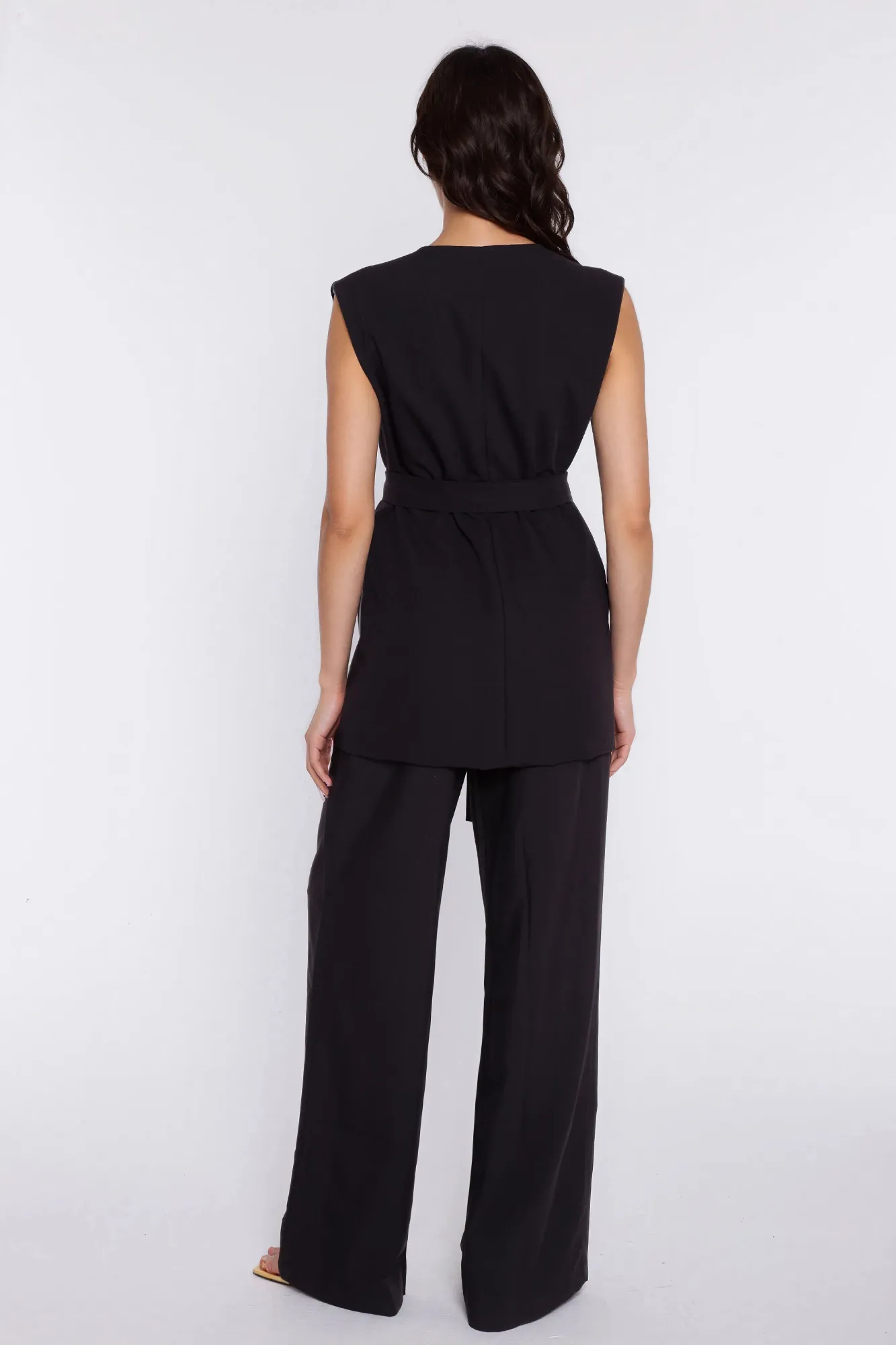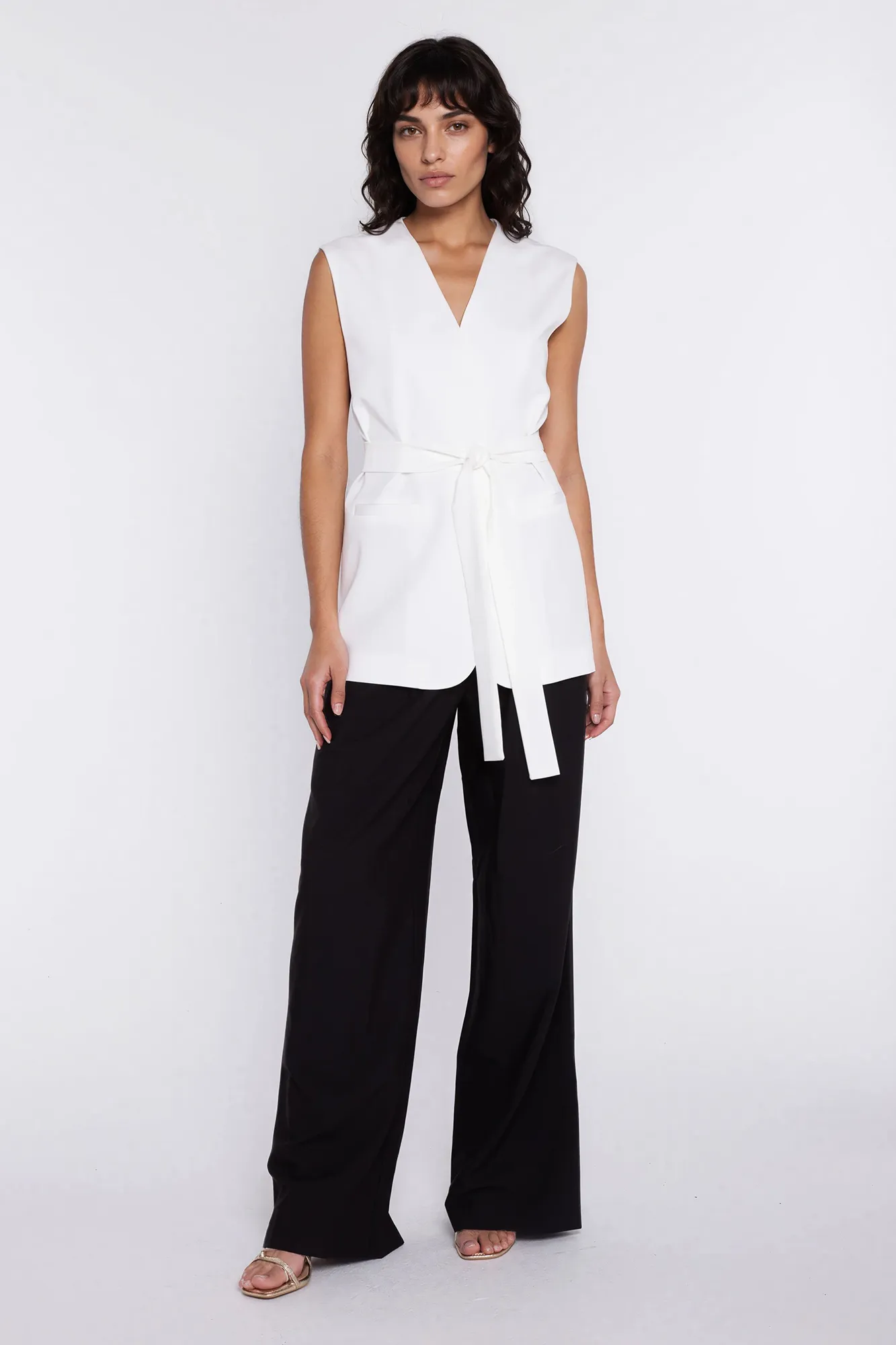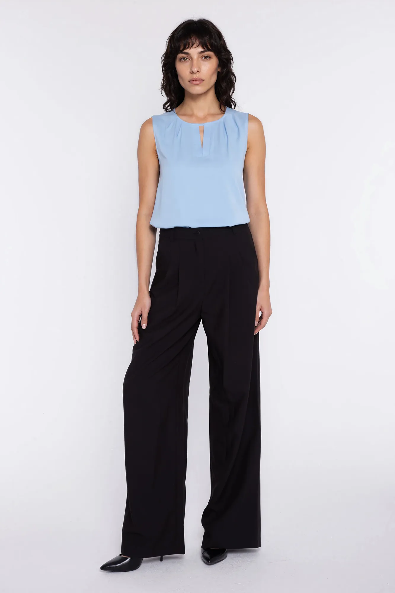Krój relaxed fit. Wysoki stan. Ozdobne zakładki z przodu. Nogawki wide leg- szerokie, długie. Zapięcie z przodu, na suwak i guzik. Klasyczne kieszenie z przodu i imitacje kieszeni z tyłu. Szlufki na pasek.