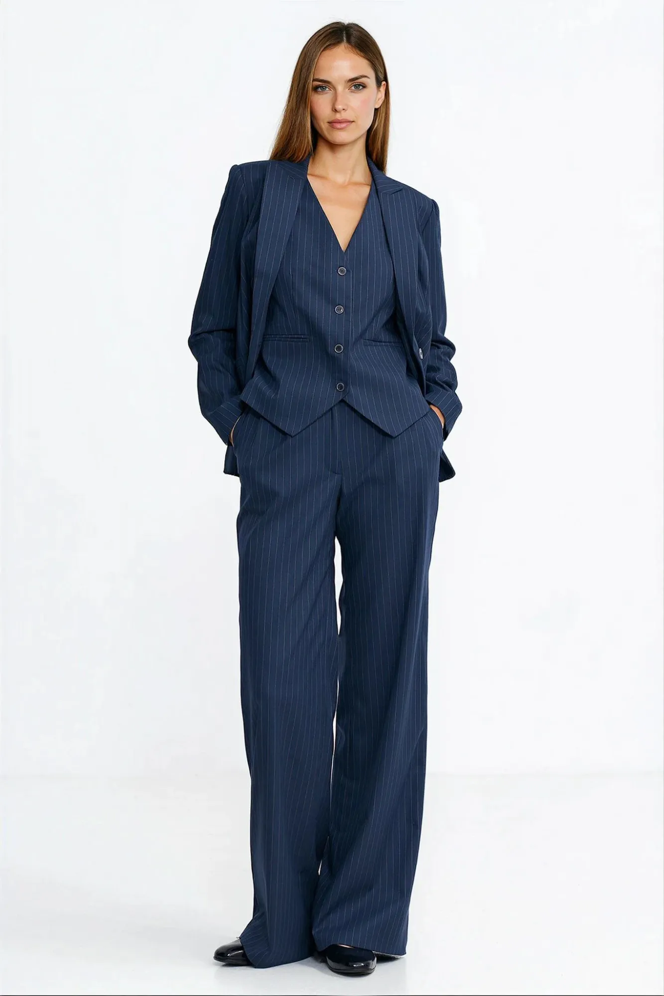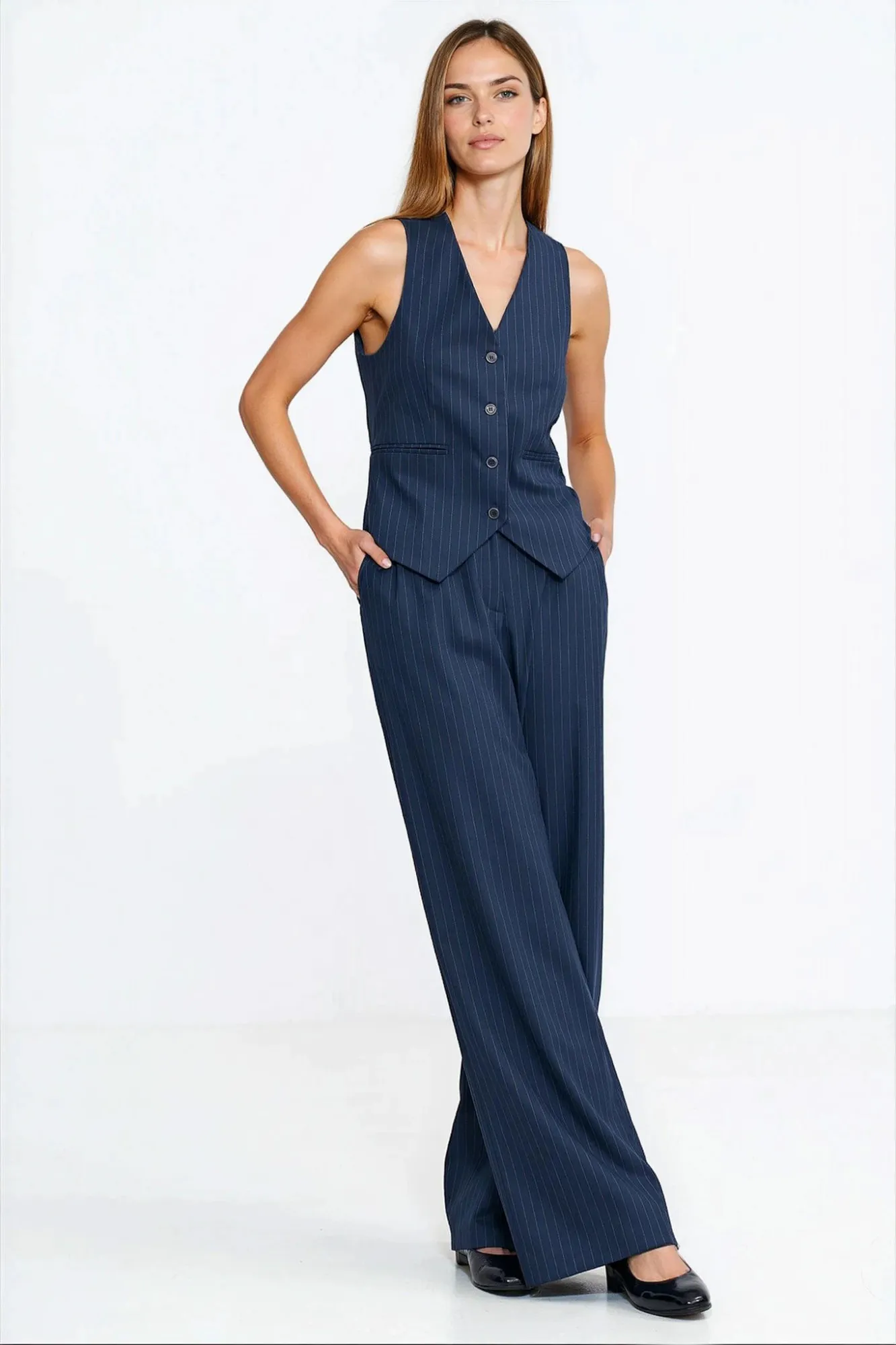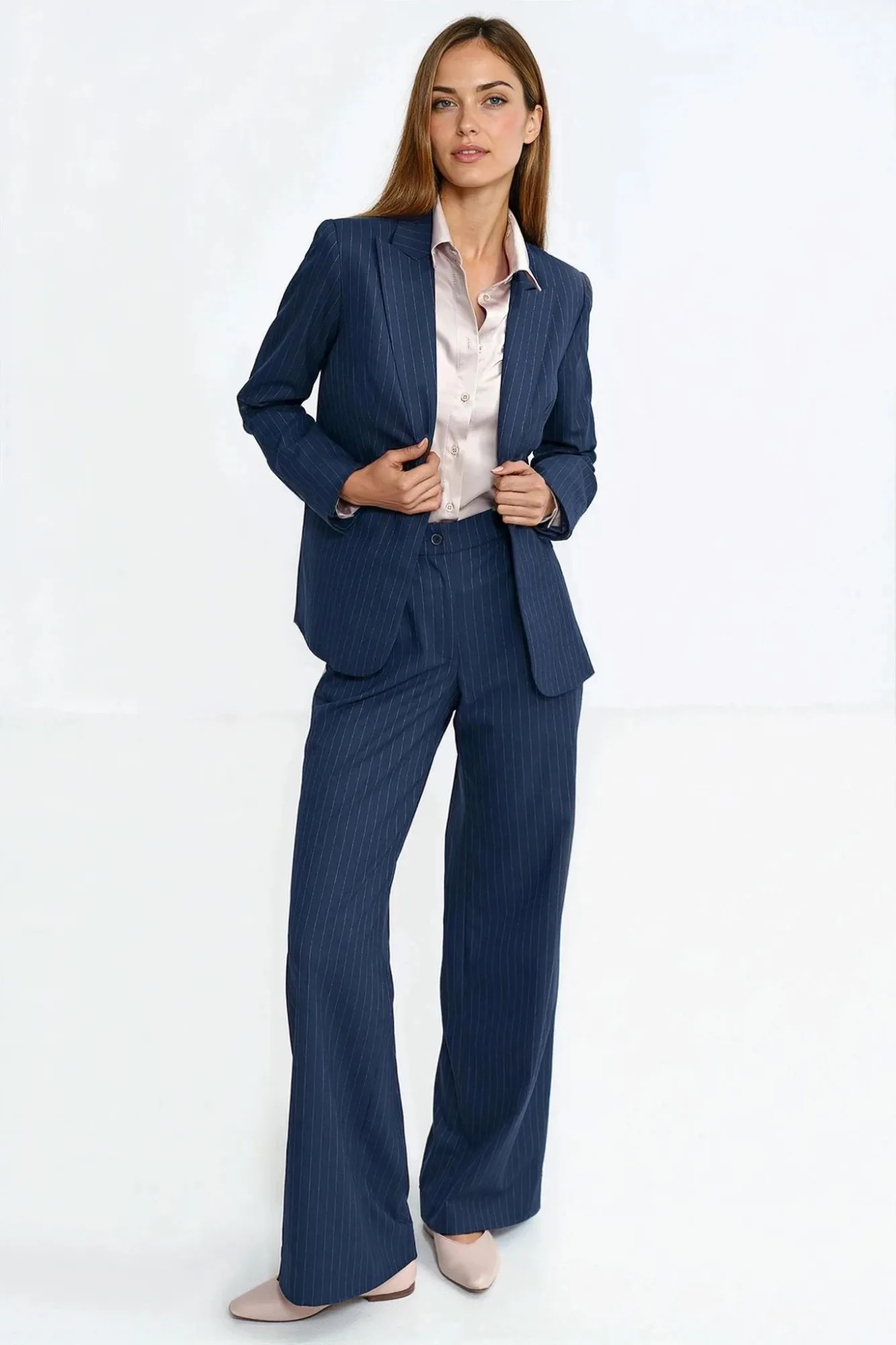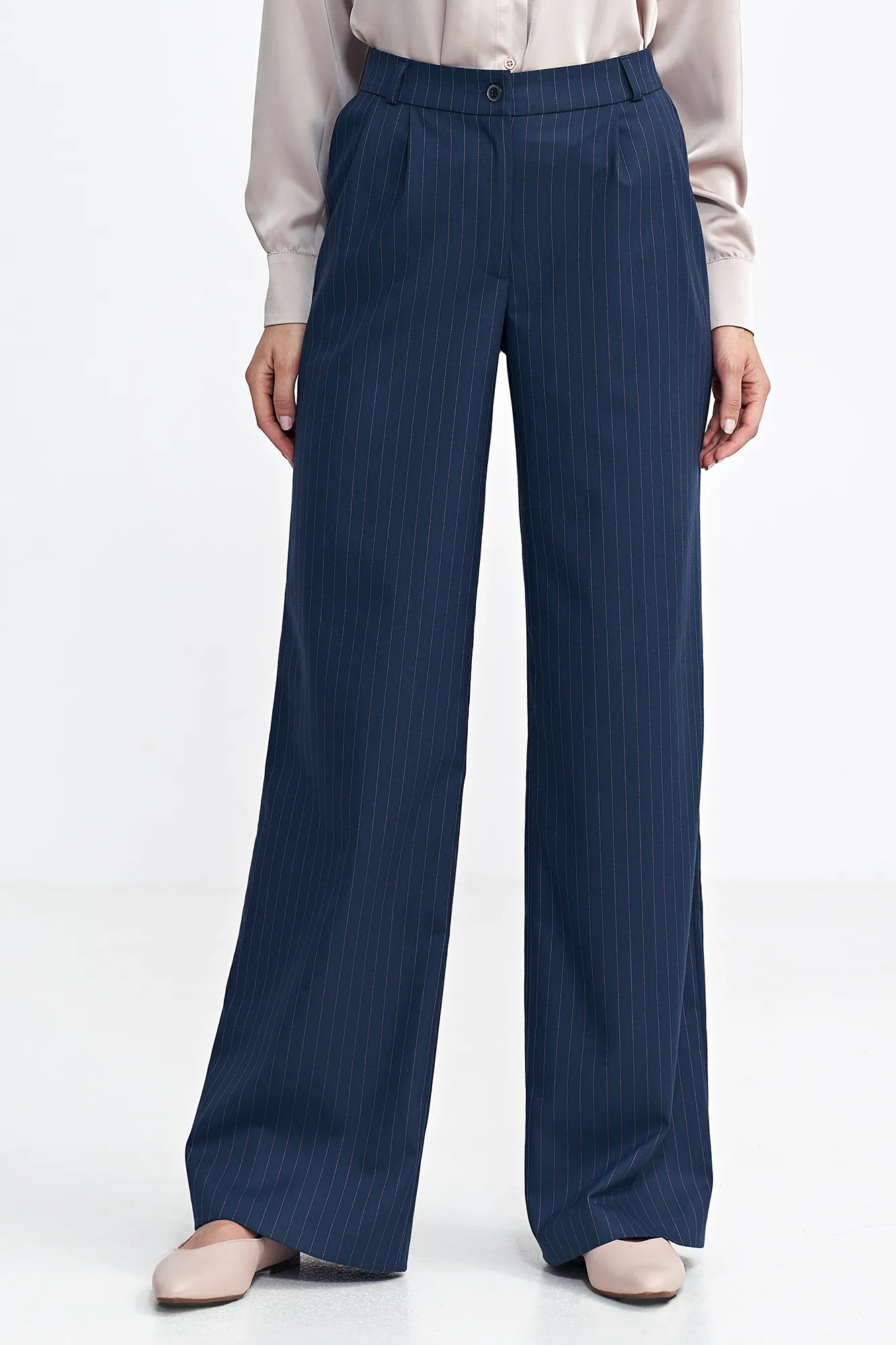 Krój relaxed fit. Materiał z subtelnie kontrastującymi prążkami, typu tenis. Średni stan. Ozdobne zakładki z przodu. Nogawka wide leg- szeroki krój. Zapięcie z przodu, na suwak i guzik. Klasyczne kieszenie z przodu i imitacje kieszeni z tyłu. Szlufki na pasek.