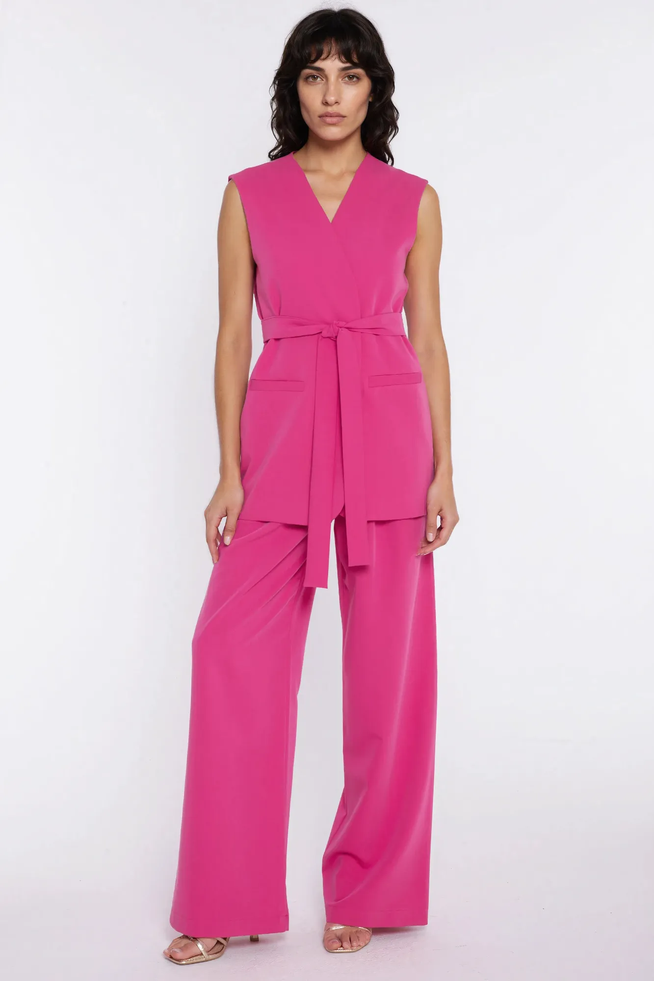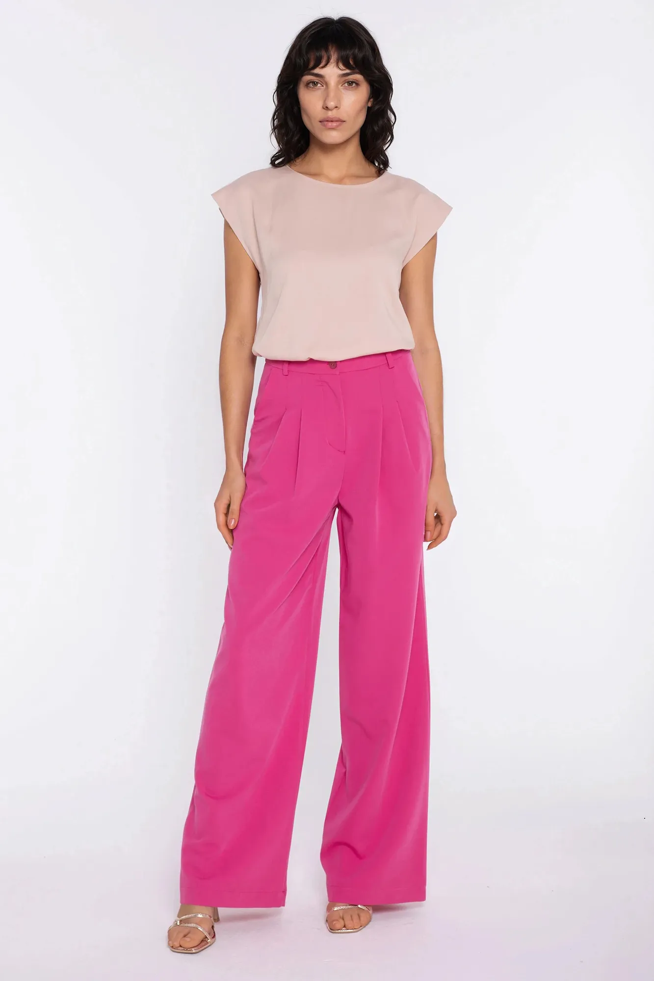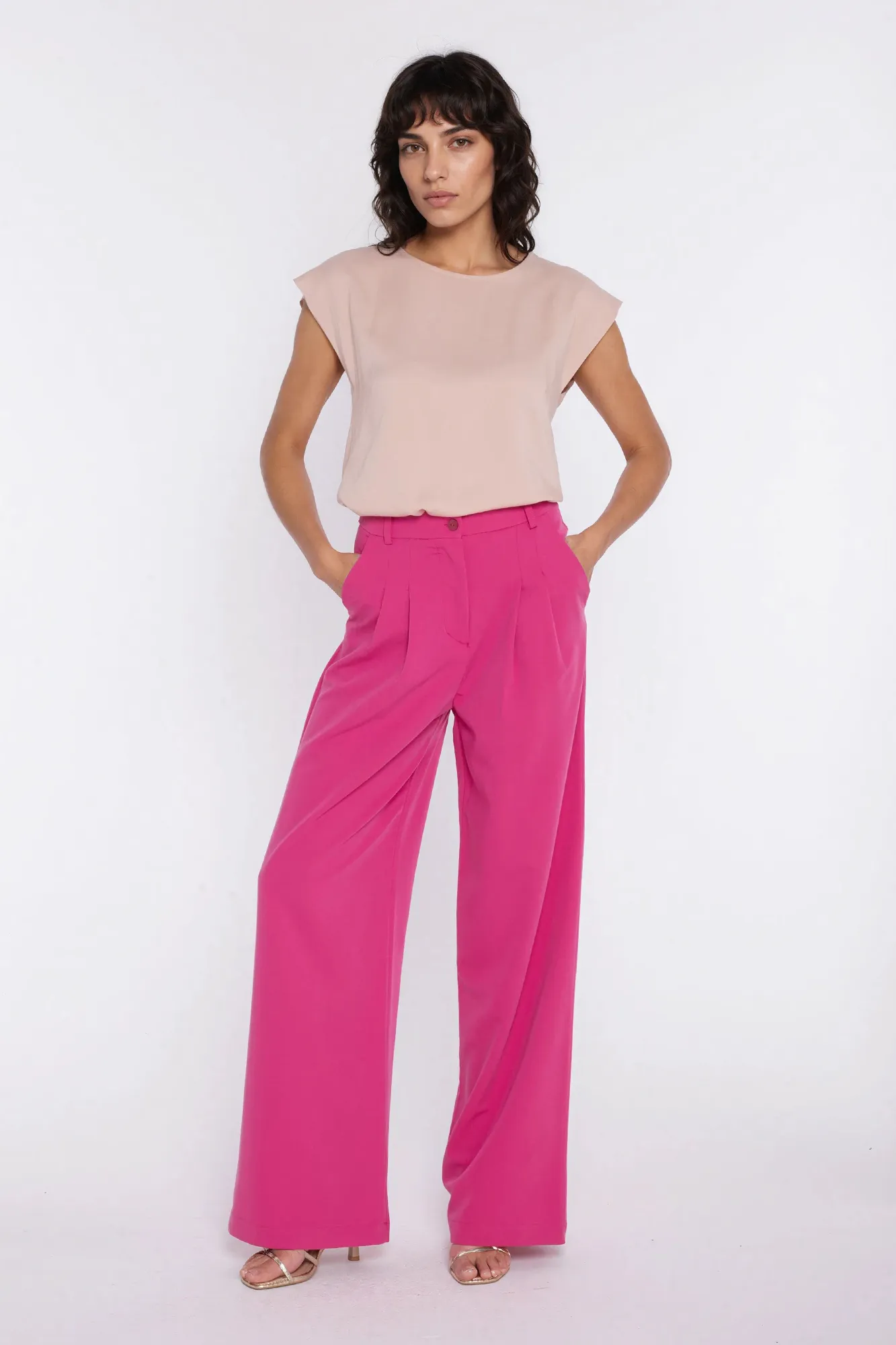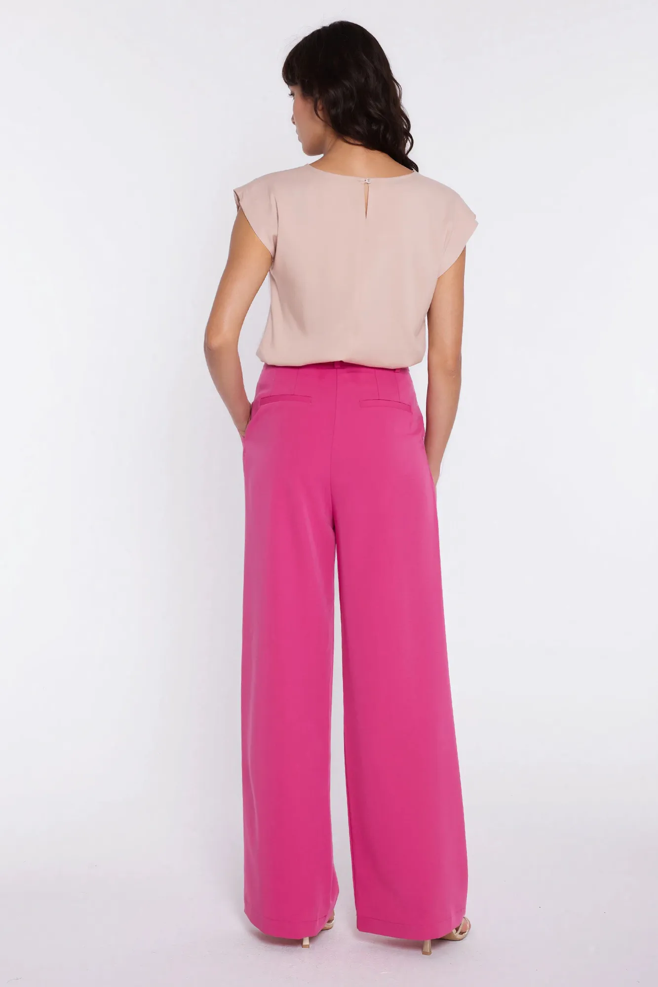 Spodnie z zakładkami, wide leg - róż