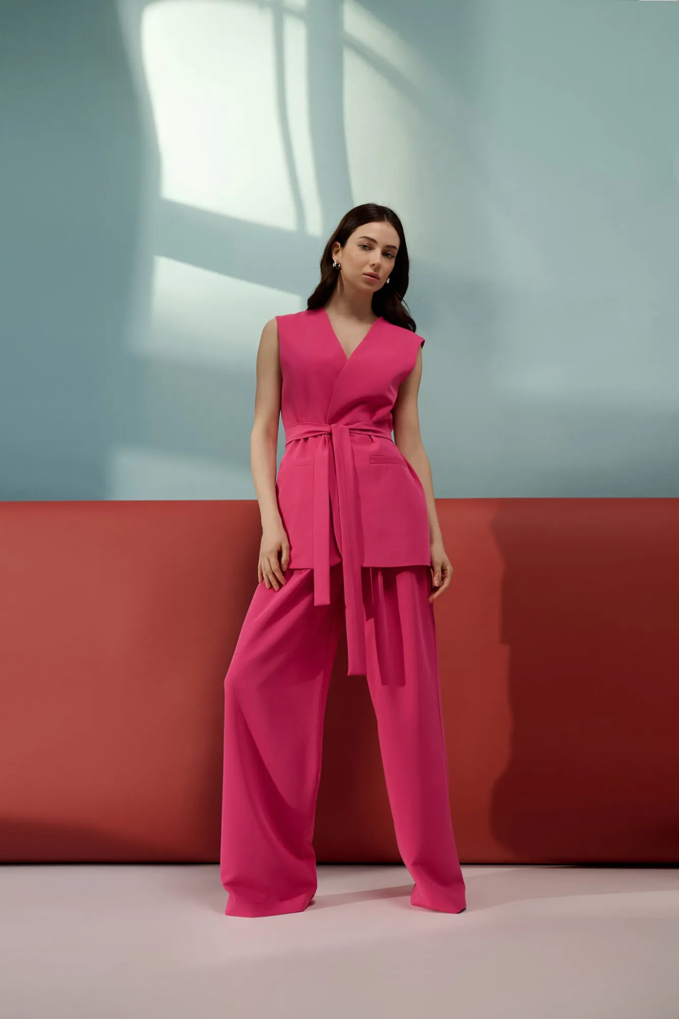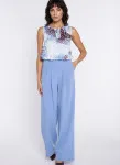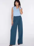 Krój relaxed fit. Wysoki stan. Ozdobne zakładki z przodu. Nogawki wide leg- szerokie, długie. Zapięcie z przodu, na suwak i guzik. Klasyczne kieszenie z przodu i imitacje kieszeni z tyłu. Szlufki na pasek.