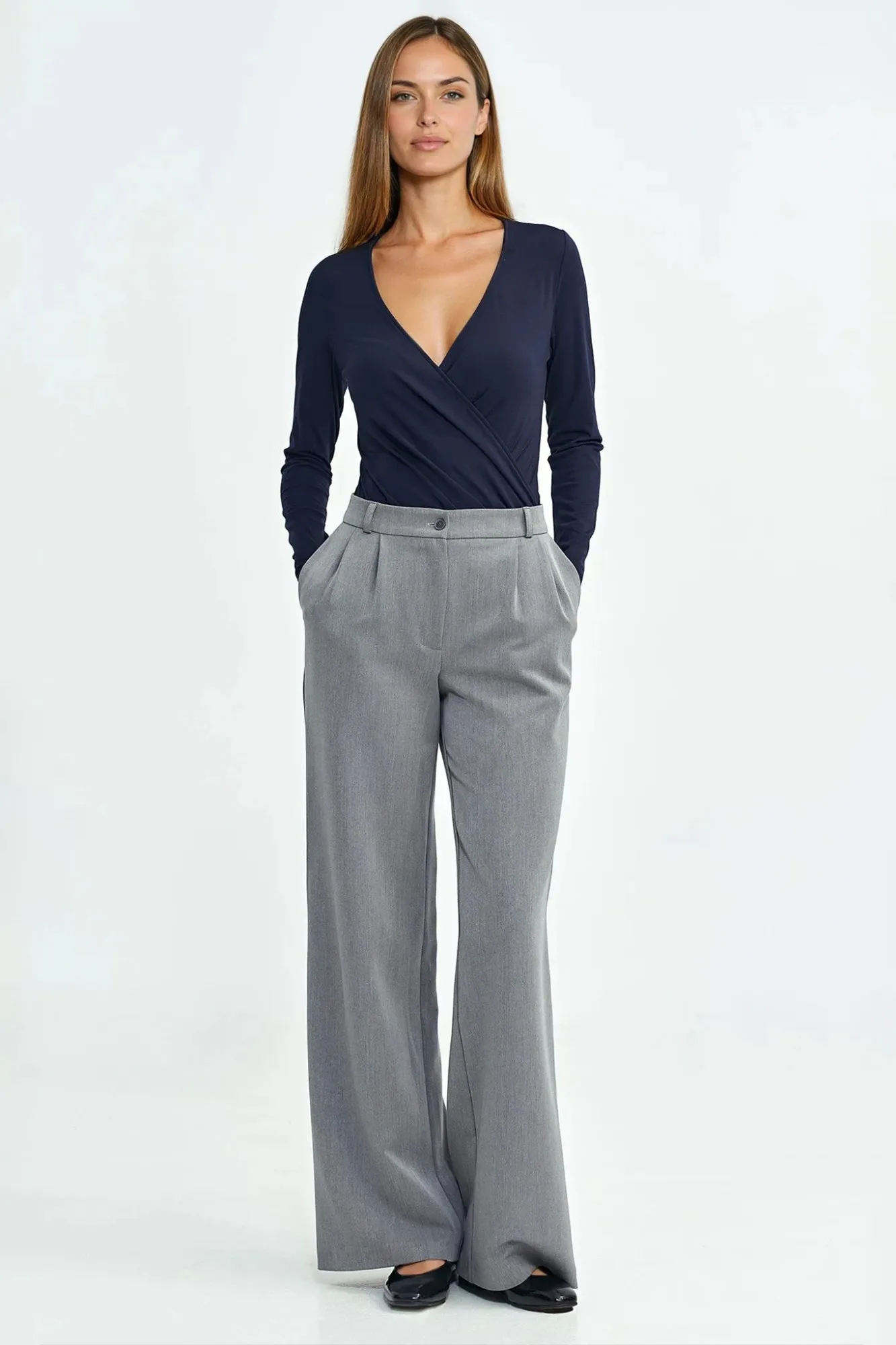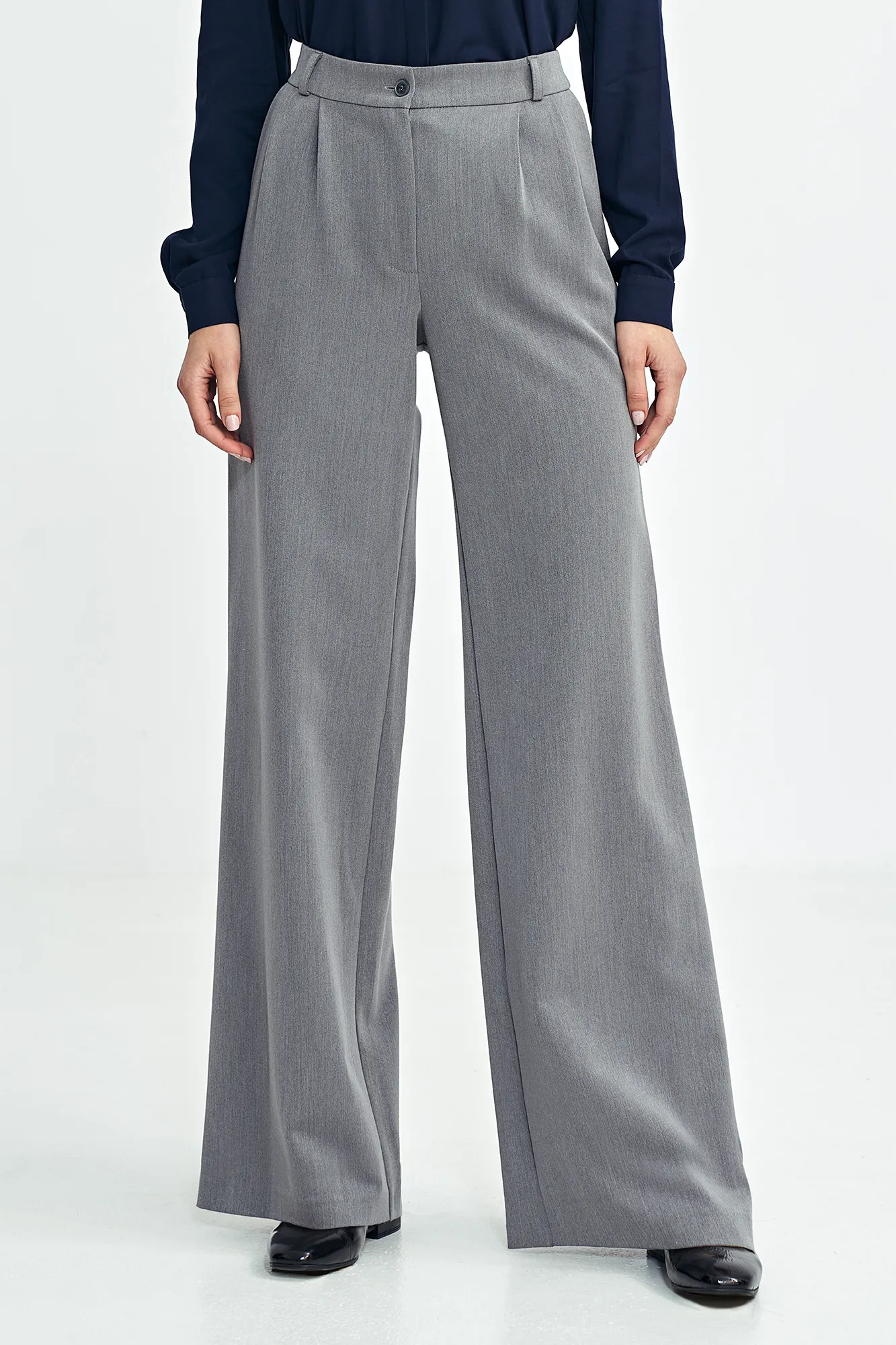 Krój relaxed fit. Średni stan. Ozdobne zakładki z przodu. Nogawka wide leg- szeroki krój. Zapięcie z przodu, na suwak i guzik. Klasyczne kieszenie z przodu i imitacje kieszeni z tyłu. Szlufki na pasek.
