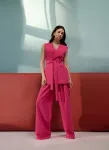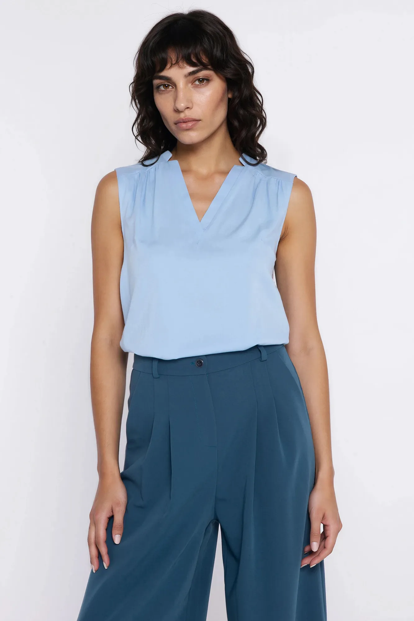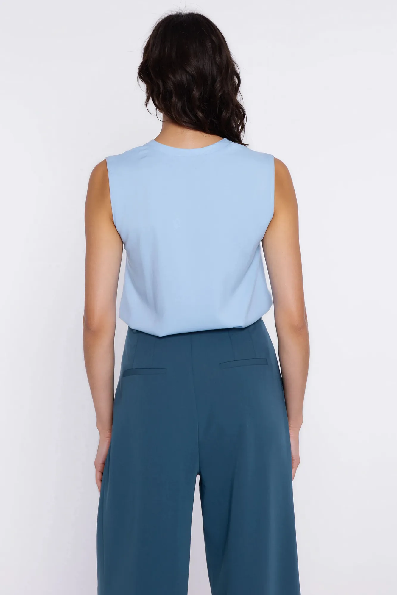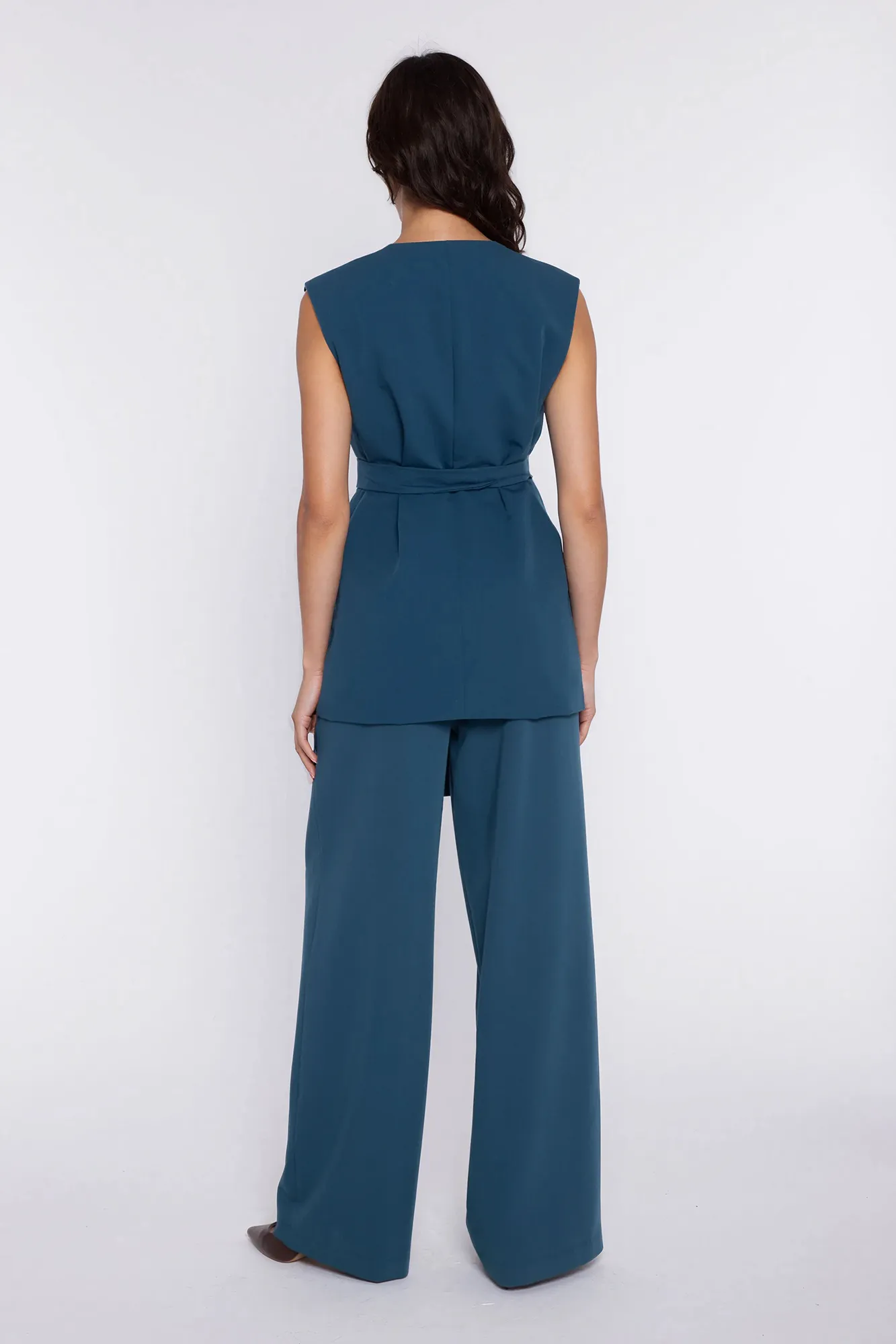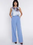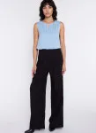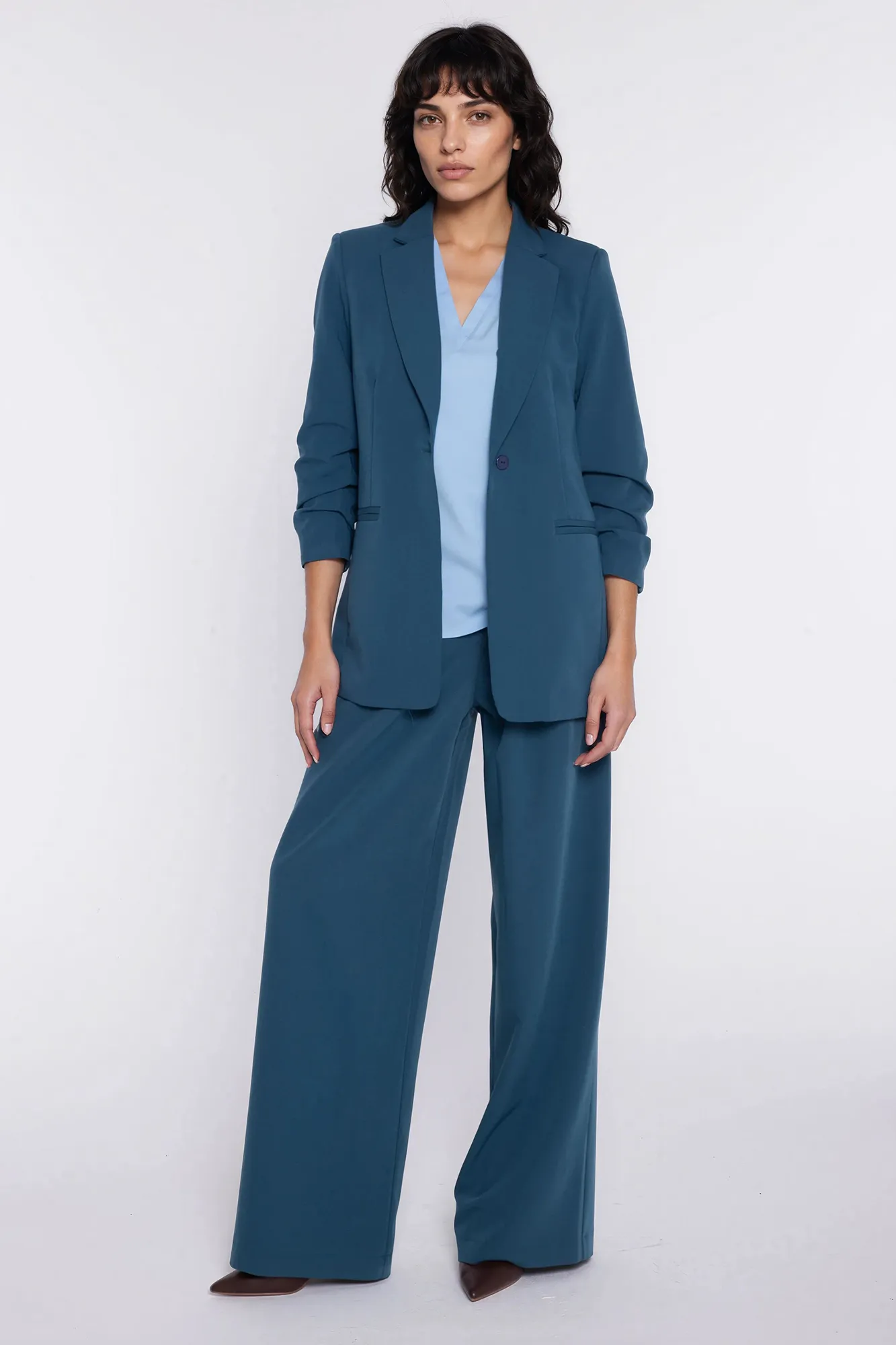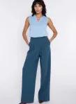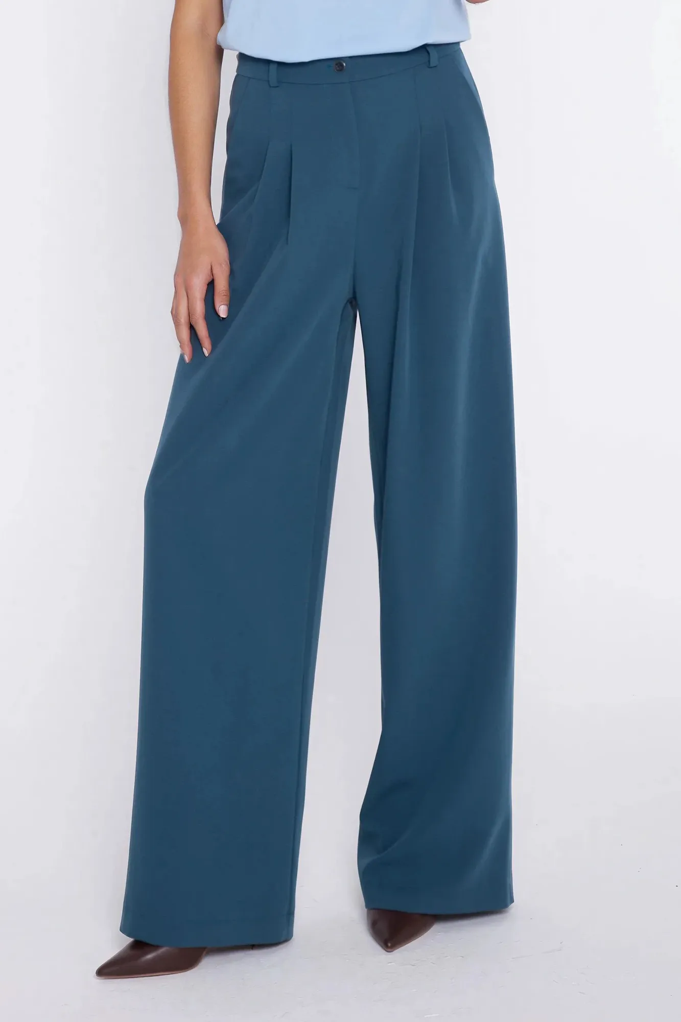 Krój relaxed fit. Wysoki stan. Ozdobne zakładki z przodu. Nogawki wide leg- szerokie, długie. Zapięcie z przodu, na suwak i guzik. Klasyczne kieszenie z przodu i imitacje kieszeni z tyłu. Szlufki na pasek.