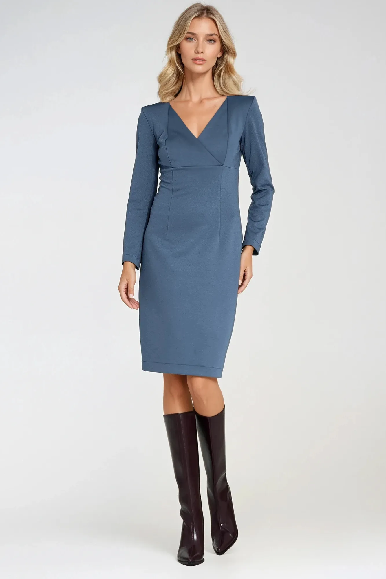 Krój dopasowany, fit. Dzianina. Kopertowy dekolt w kształcie litery V. Długi rękaw. Ołówkowa część dolna. Zapinana z tyłu, pośrodku, na suwak. Długość w kolano.