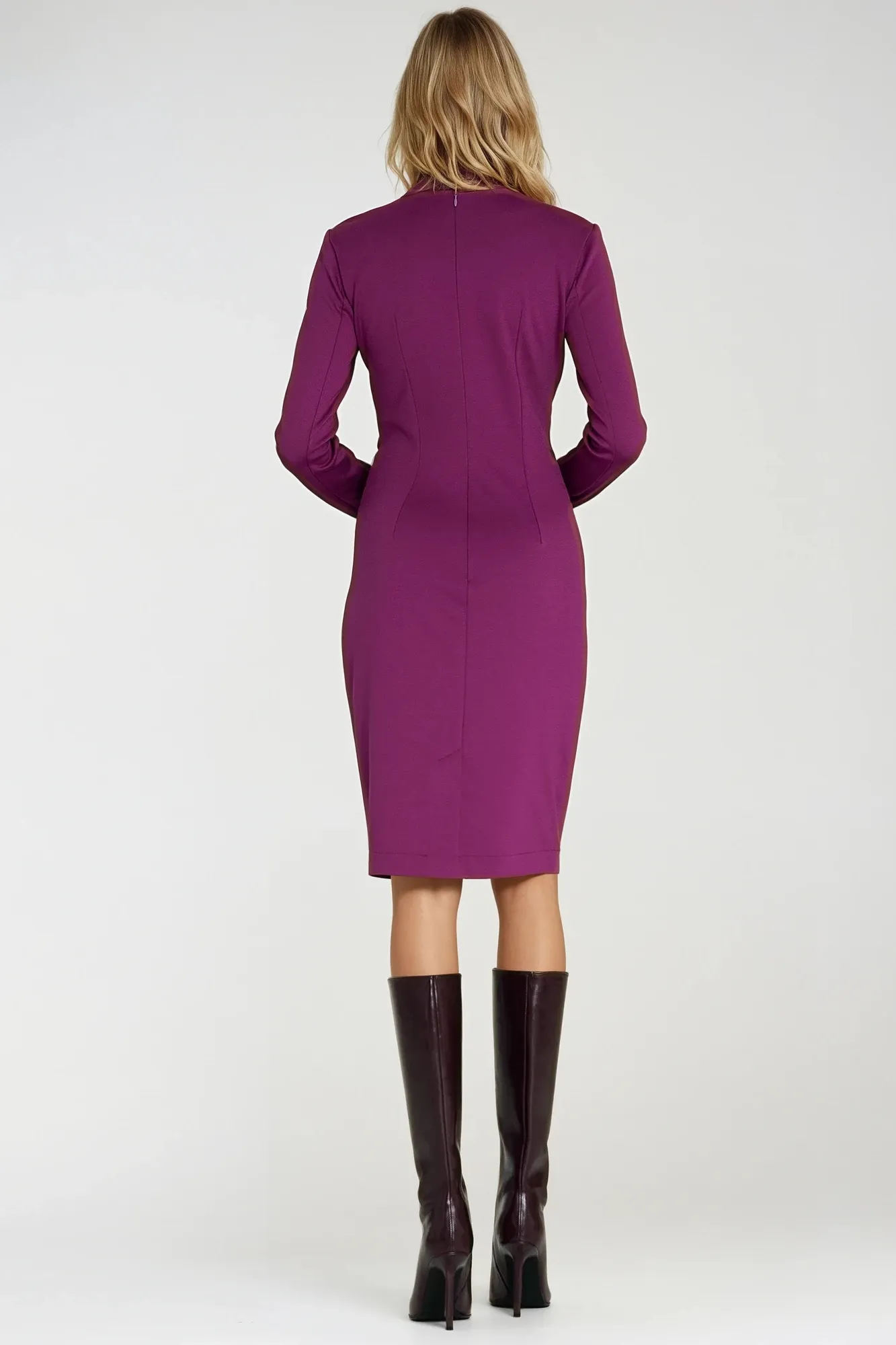 Krój dopasowany, fit. Dzianina. Kopertowy dekolt w kształcie litery V. Długi rękaw. Ołówkowa część dolna. Zapinana z tyłu, pośrodku, na suwak. Długość w kolano.