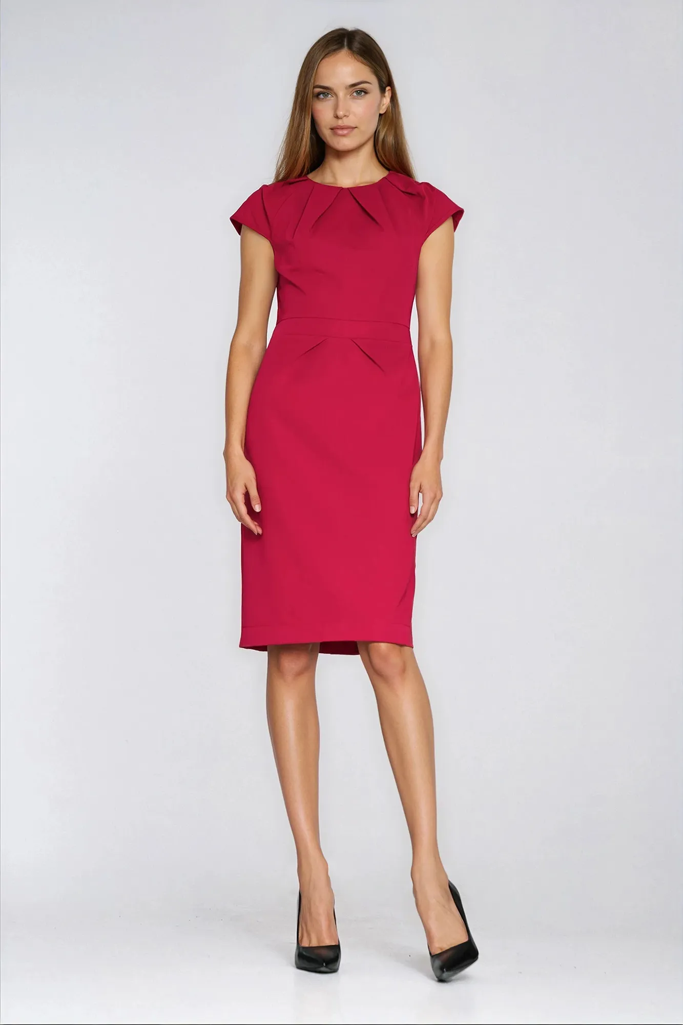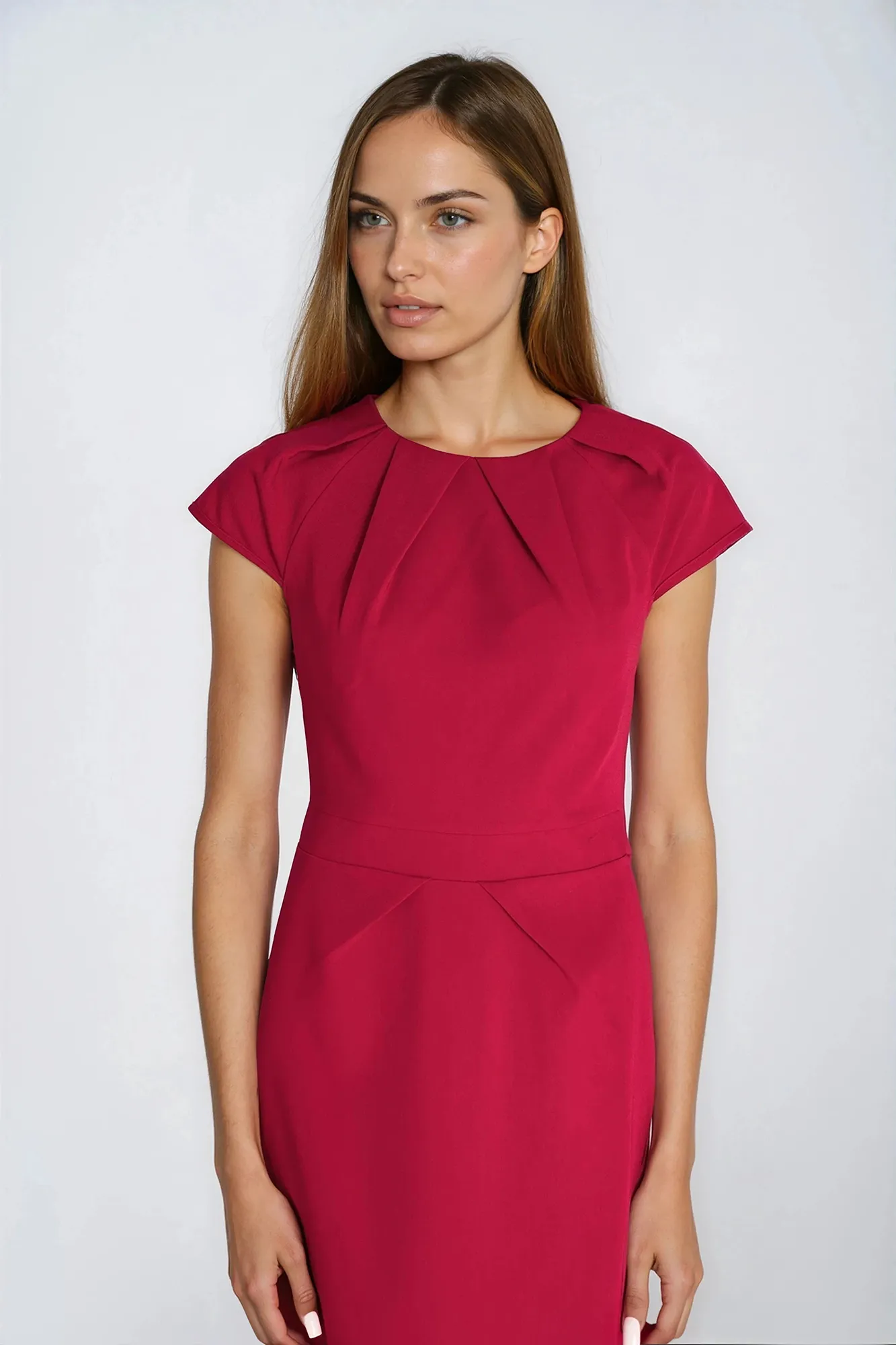 Krój dopasowany, fit. Okrągły dekolt. Rękaw zakrywający ramię, typu cap. Długość w kolano. Ołówkowa część dolna. Zapinana z tyłu, pośrodku, na suwak. Przy dekolcie i w pasie ozdobne zakładki.