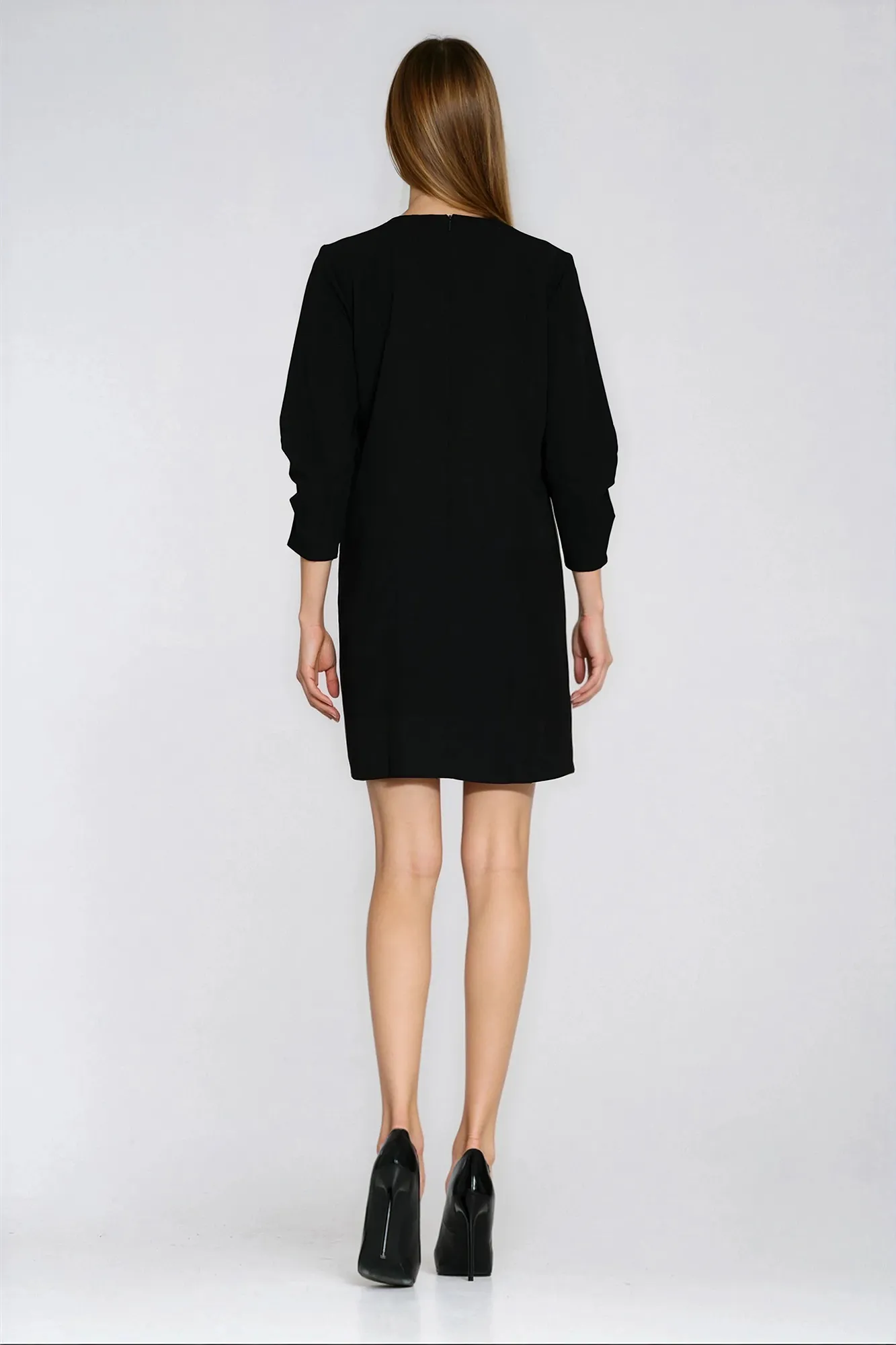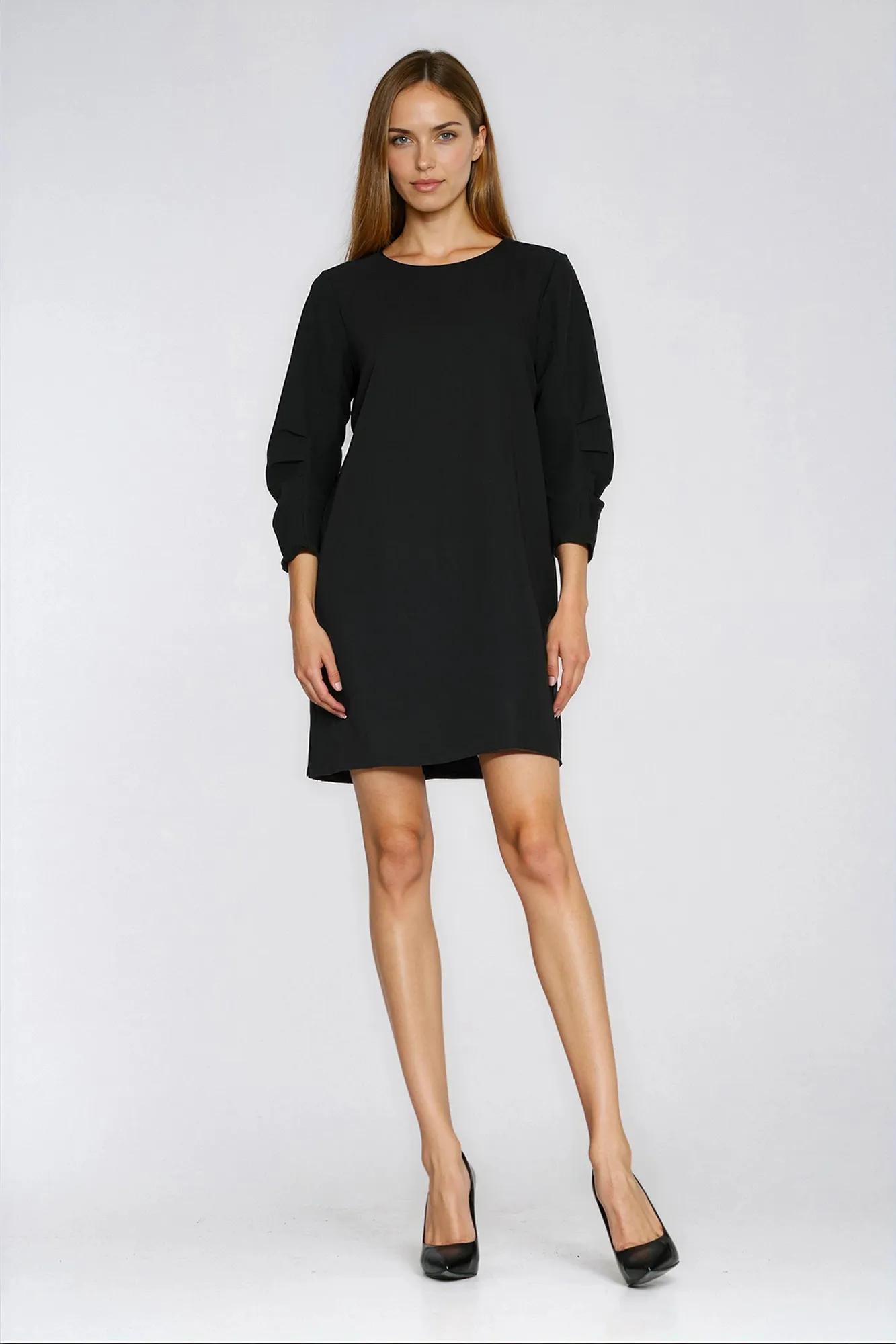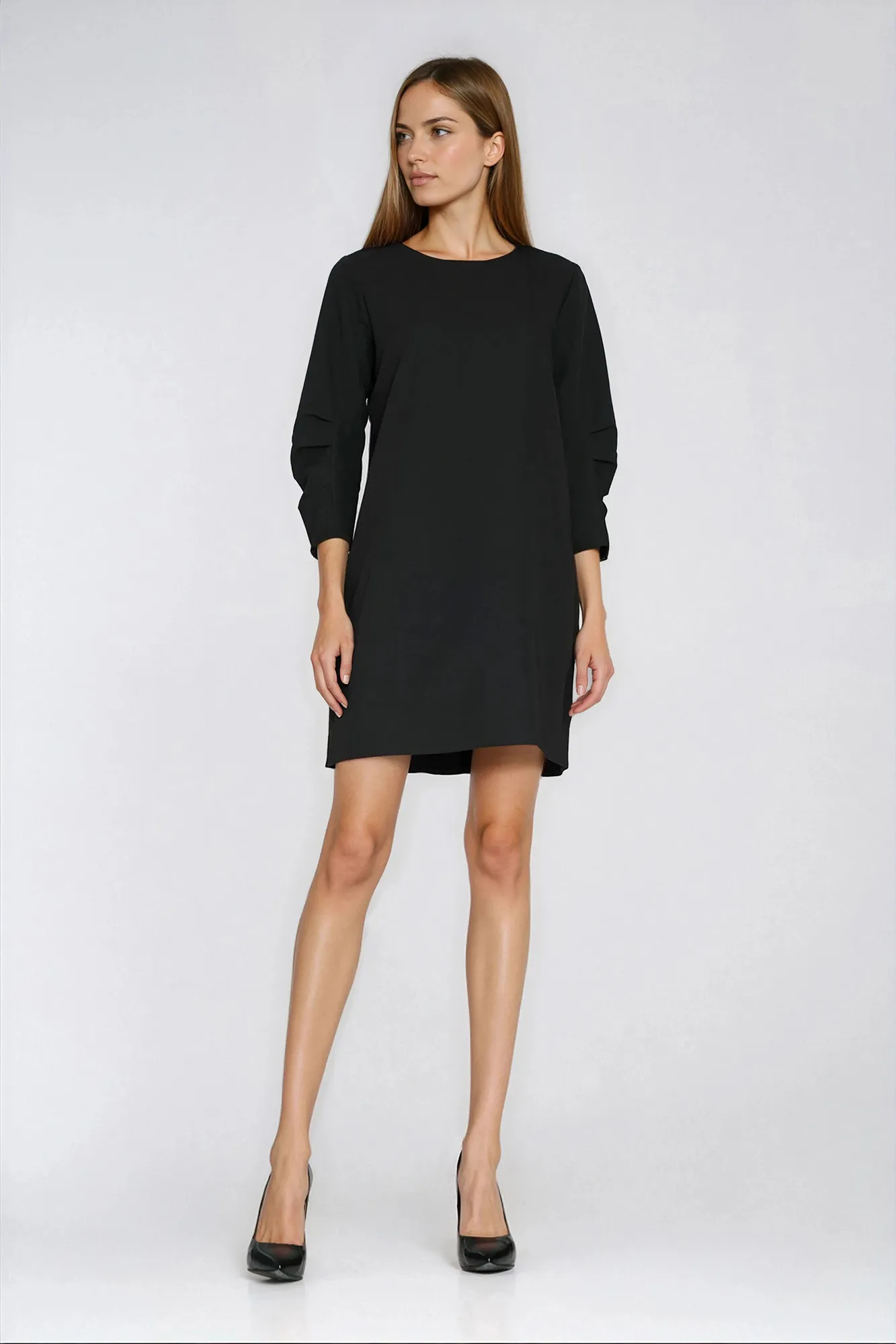 Krój relaxed fit. Fason w literę "A". Okrągły dekolt pod szyję. Rękaw 3/4 z nieszablonowymi zakładkami. Długość przed kolana. Zapięcie na suwak z tyłu.