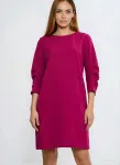 Krój relaxed fit. Fason w literę "A". Okrągły dekolt pod szyję. Rękaw 3/4 z nieszablonowymi zakładkami. Długość przed kolana. Zapięcie na suwak z tyłu.