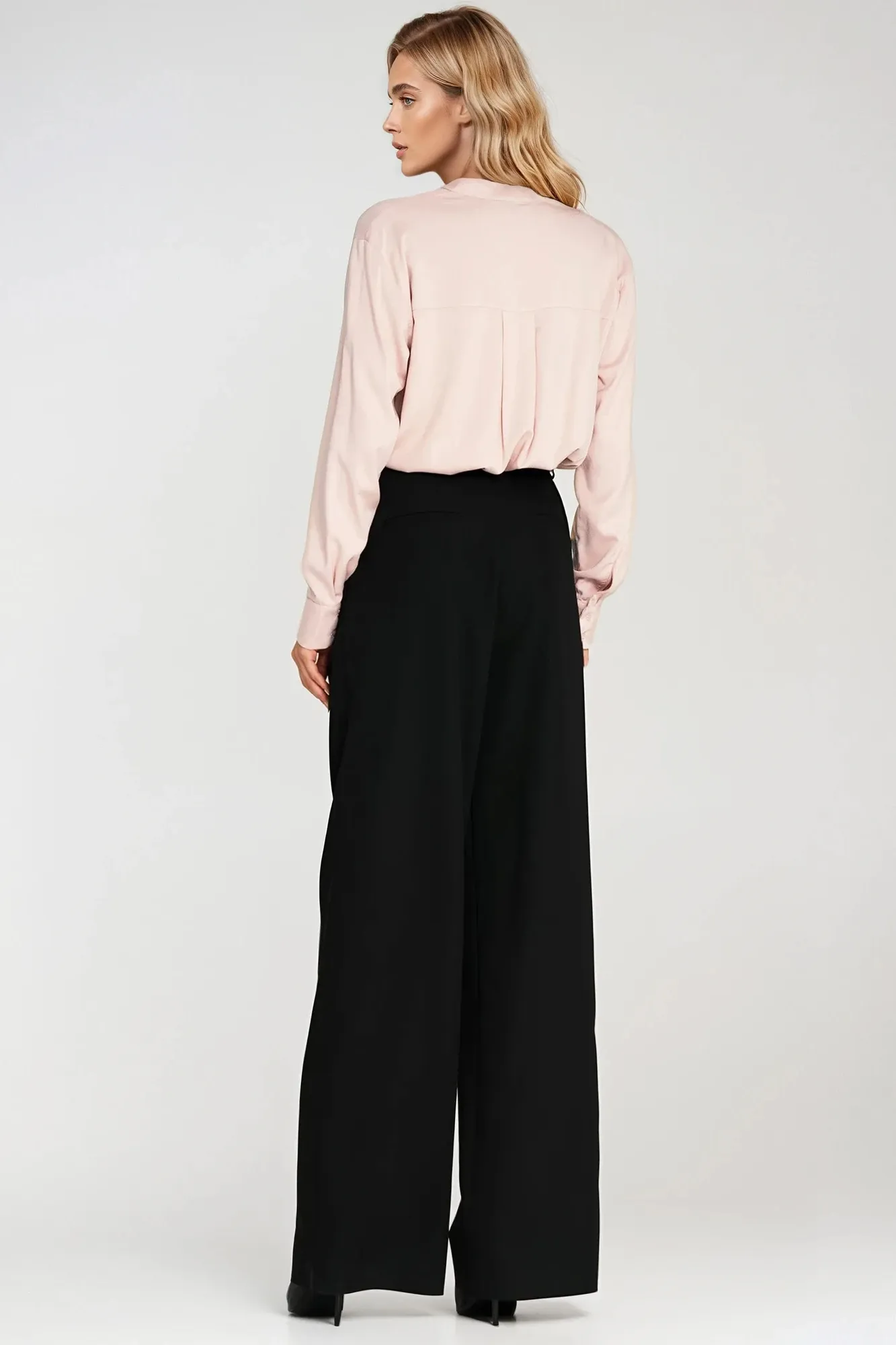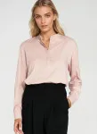 Krój oversize. Materiał wiskoza. Dekolt polo ze stójką. Długi rękaw zakończony mankietem. Do połowy rozpinana na guziki z krytą plisą.