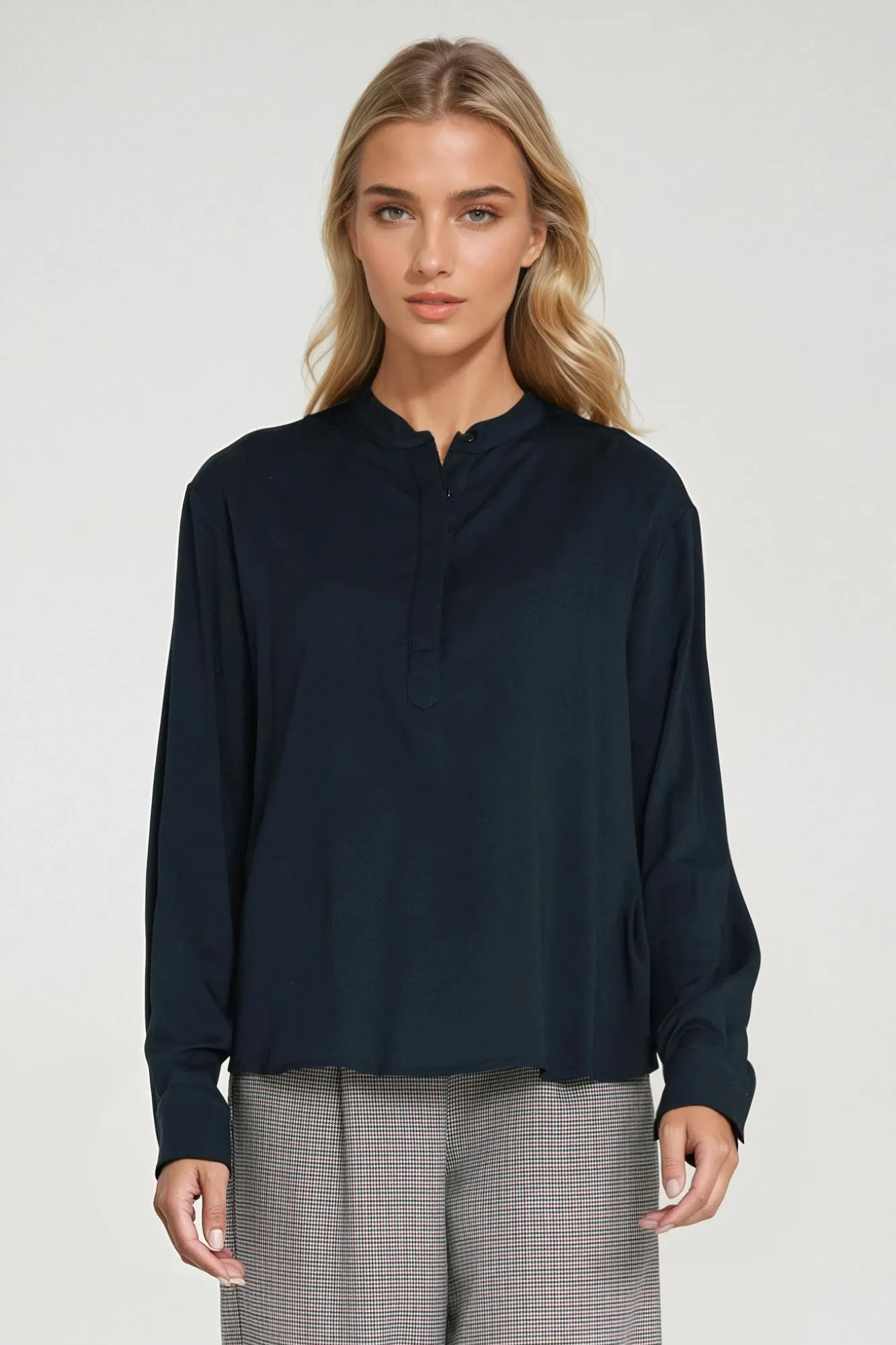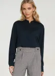 Krój oversize. Materiał wiskoza. Dekolt polo ze stójką. Długi rękaw zakończony mankietem. Do połowy rozpinana na guziki z krytą plisą.