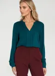 Krój regular. Materał wiskoza. Dekolt w kształcie litery V z szeroką plisą. Długi rękaw zakończony mankietem. Wkładana przez głowę.