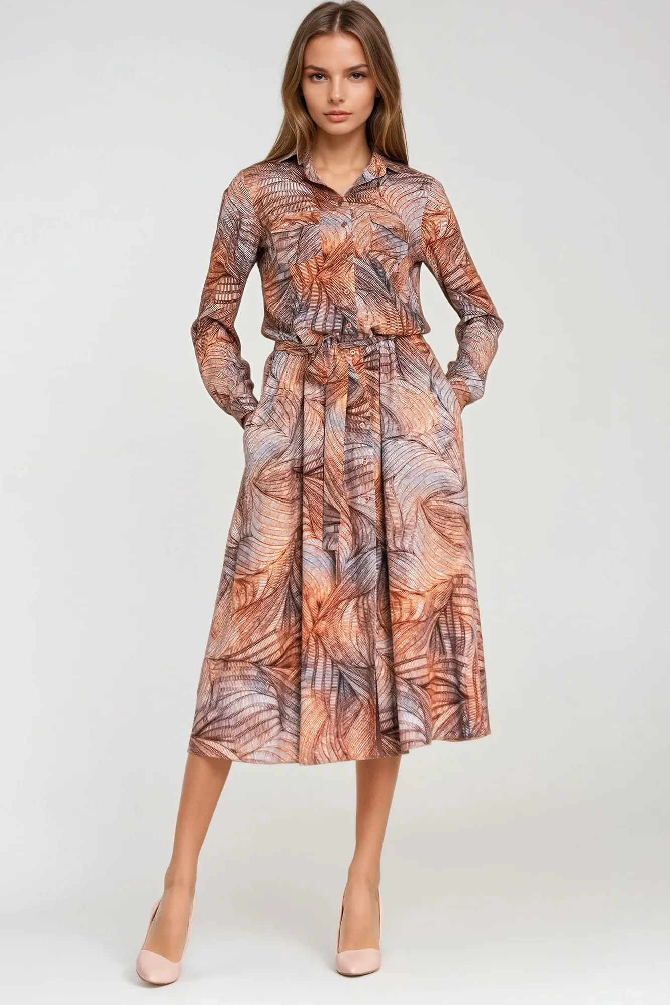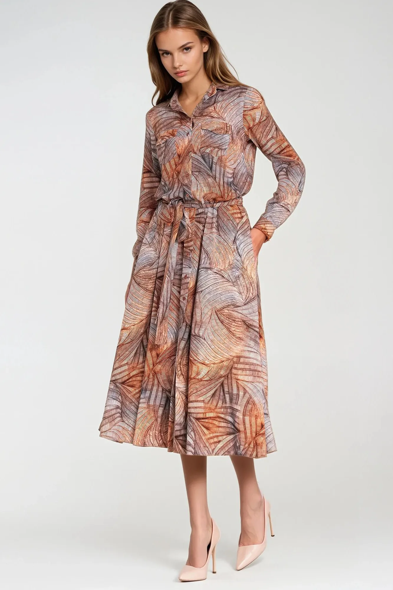 Krój regular. Materiał wiskoza. Klasyczny kołnierzyk. Długi rękaw z mankietem. Zapinana na guziki z przodu. Długość midi. Ozdobne kieszenie na wysokości piersi. Kieszenie w bocznych szwach sukienki. W komplecie prosty, materiałowy pasek. Bez podszewki.